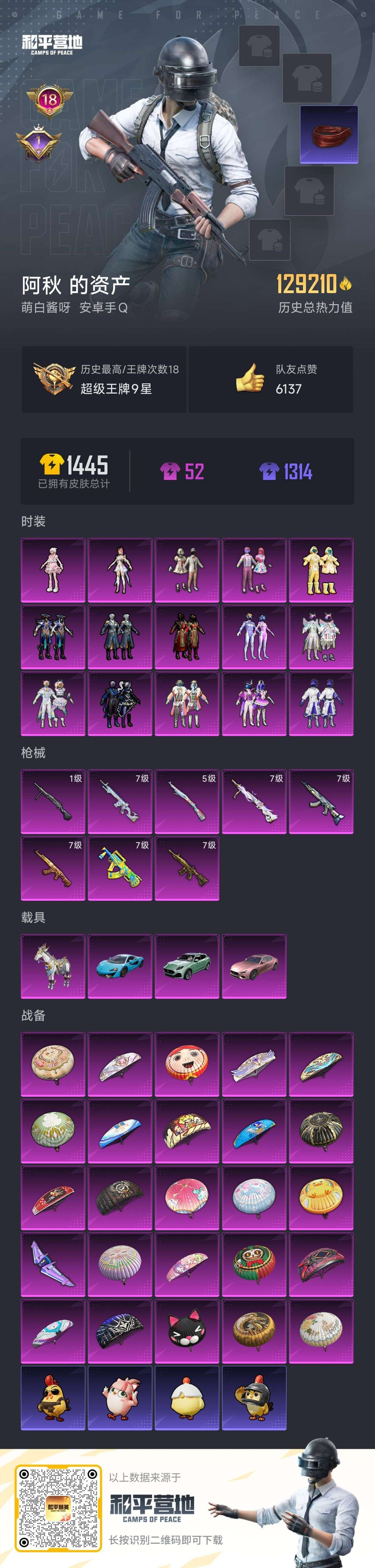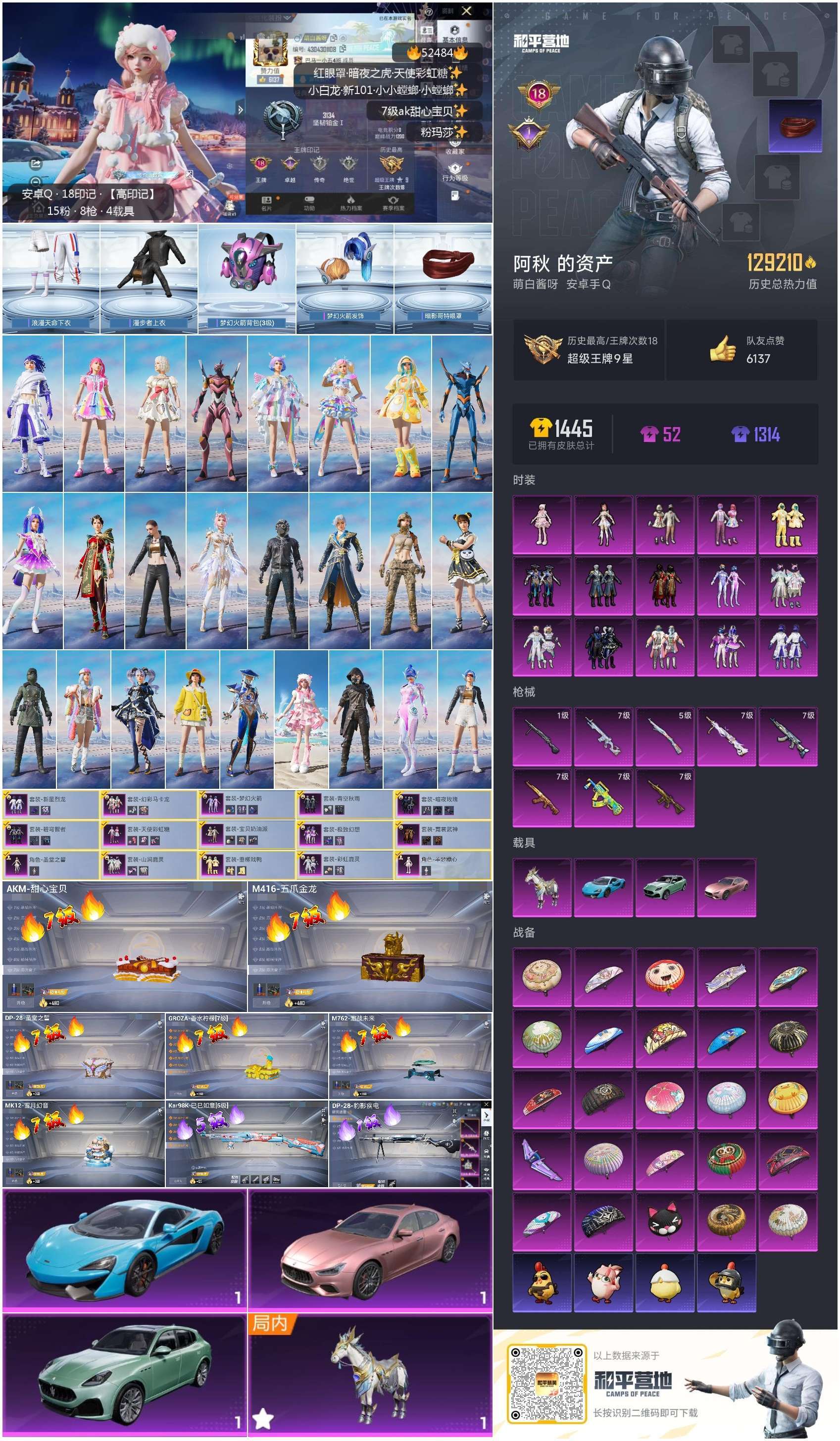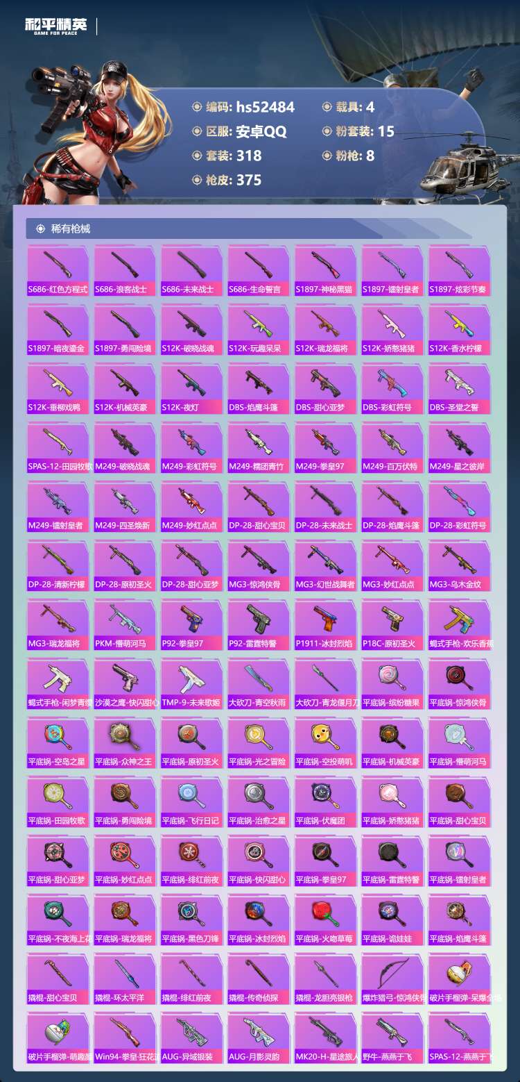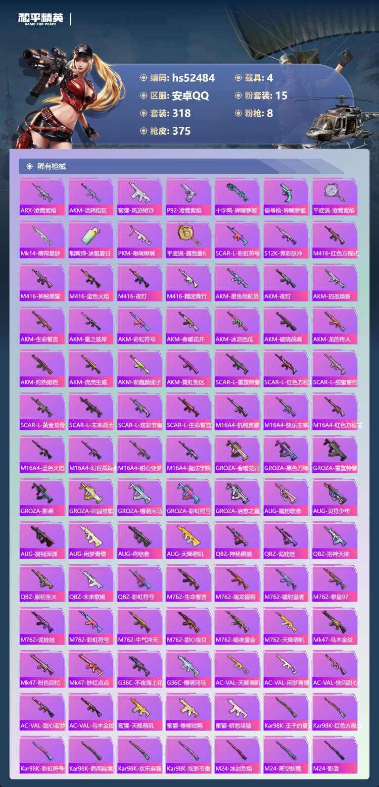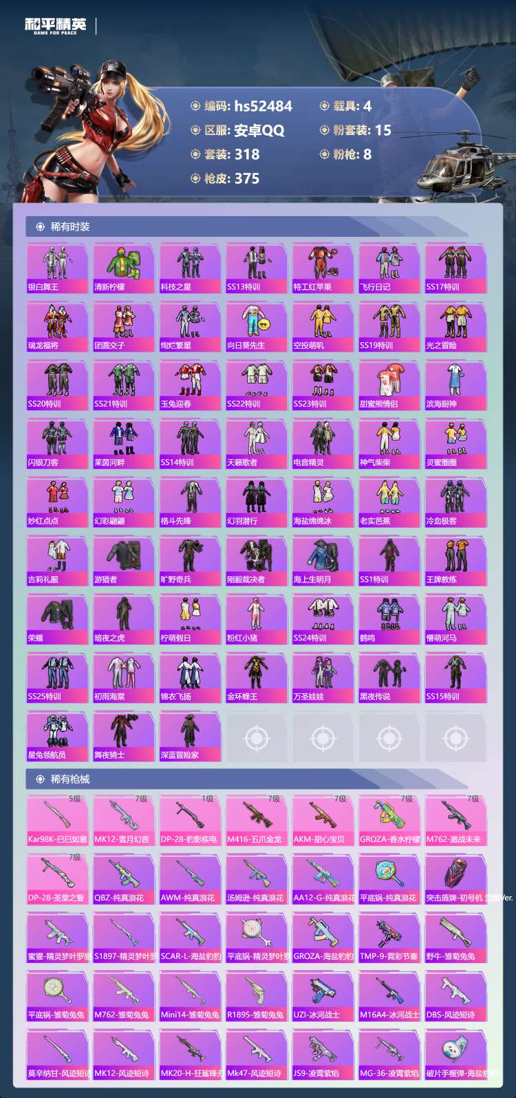 hs52484 安卓手Q-18王牌印记-15粉装-8特效枪-4载具-129511热力值-318套装-