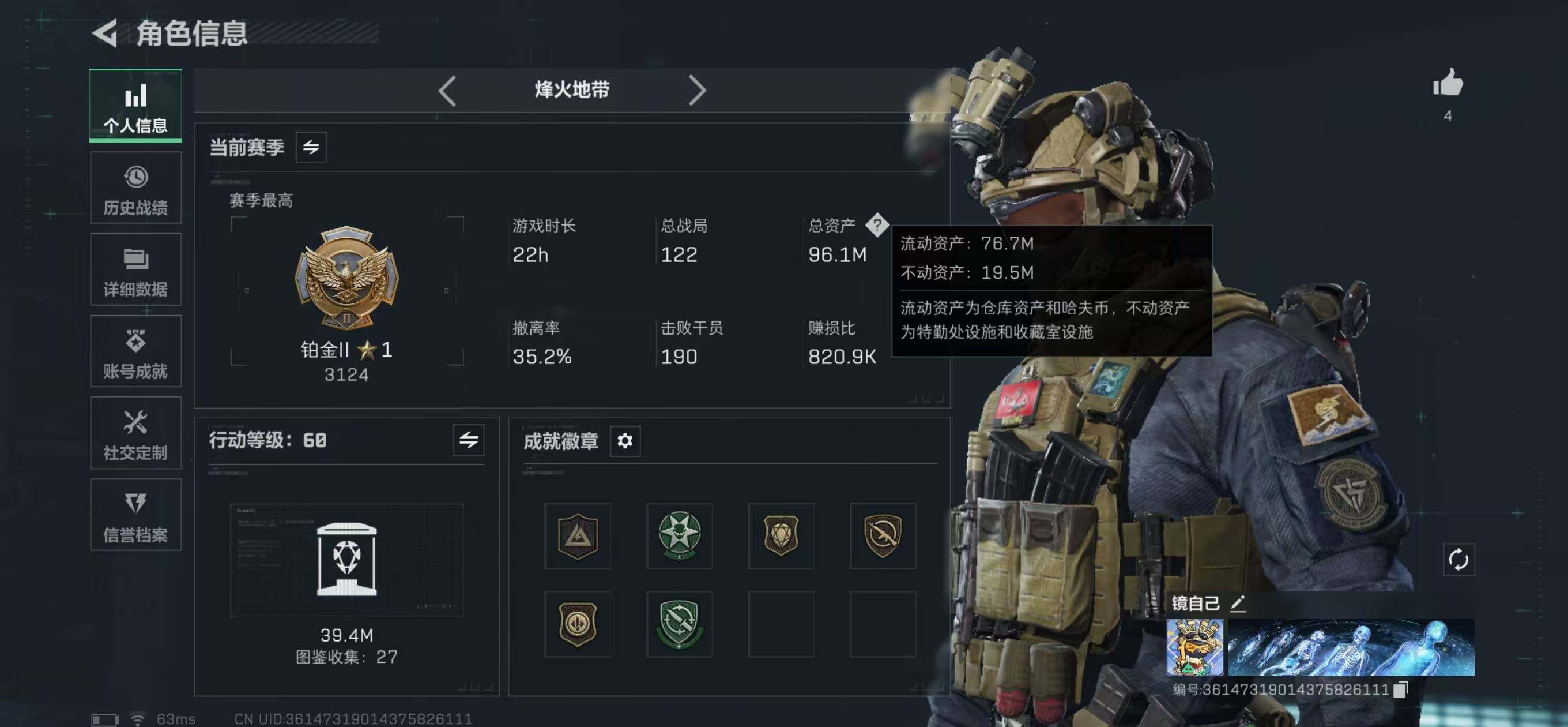 95m总资产-834k哈伏币-60烽火等级-铂金-14战场等级-列兵,YY1613