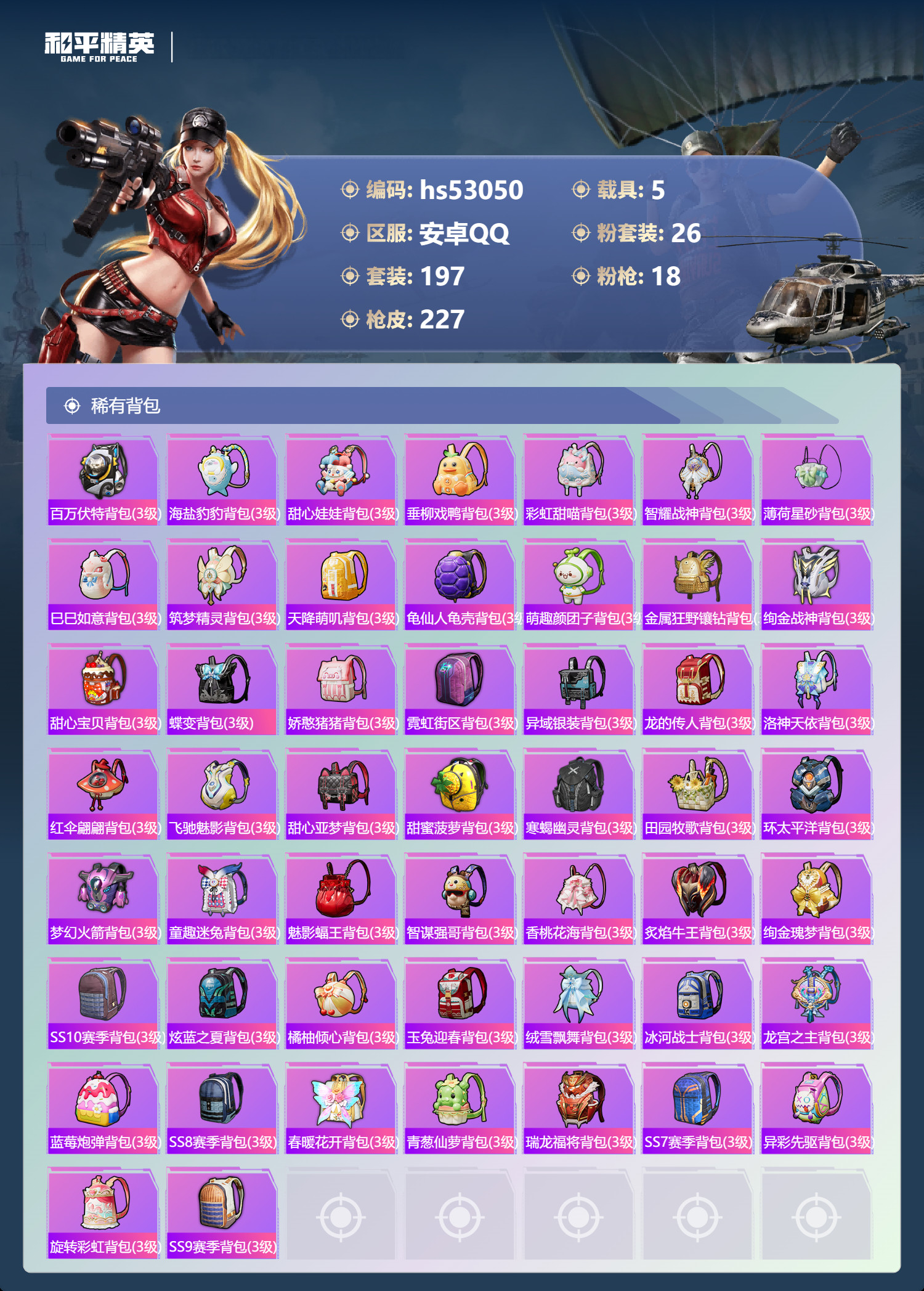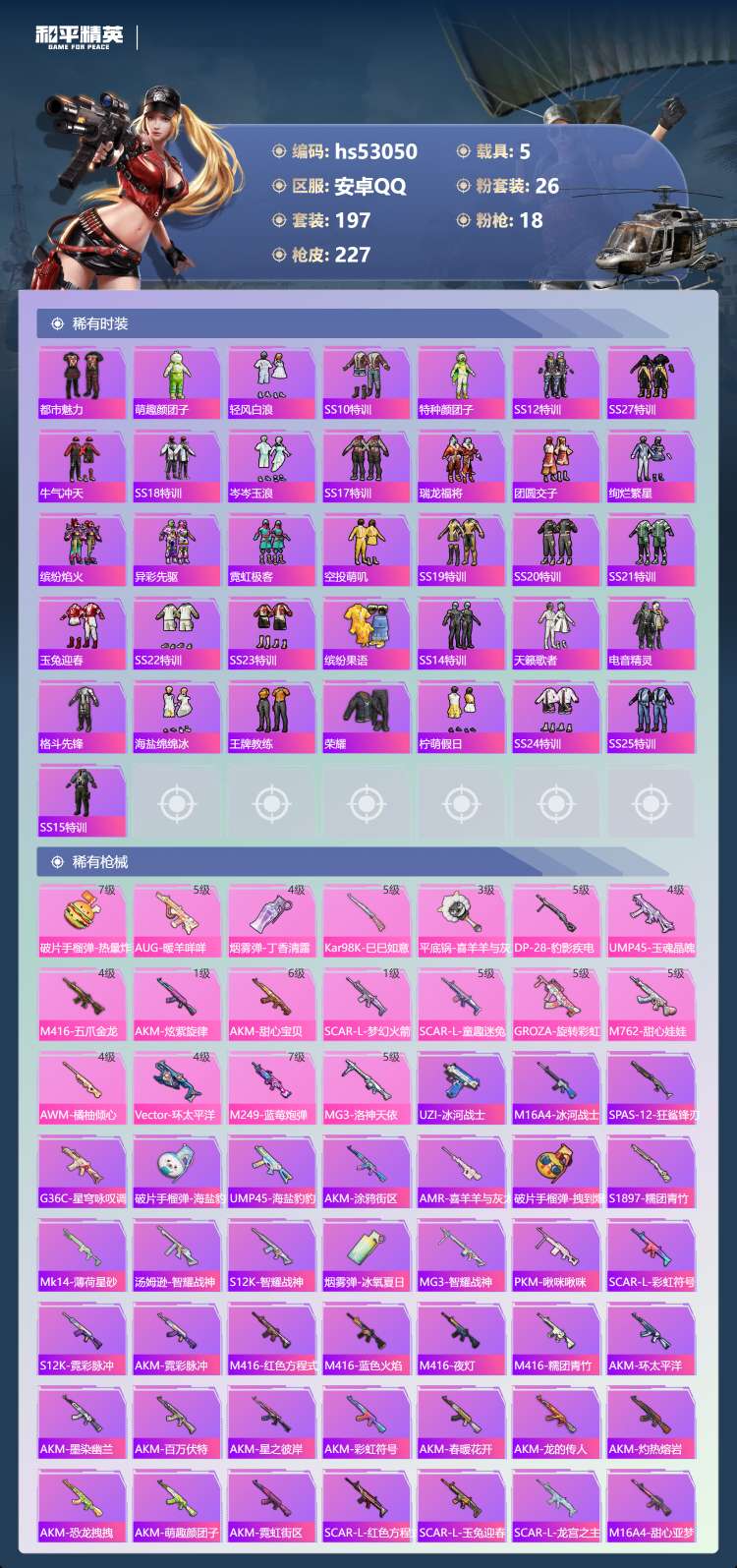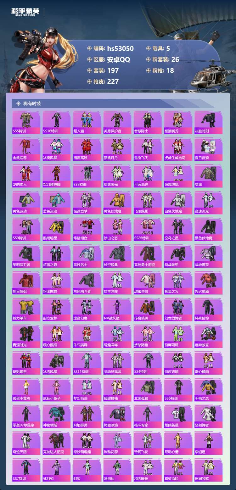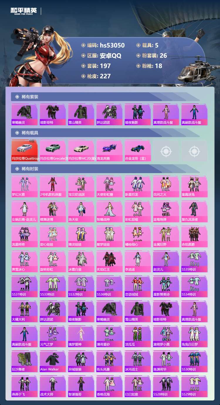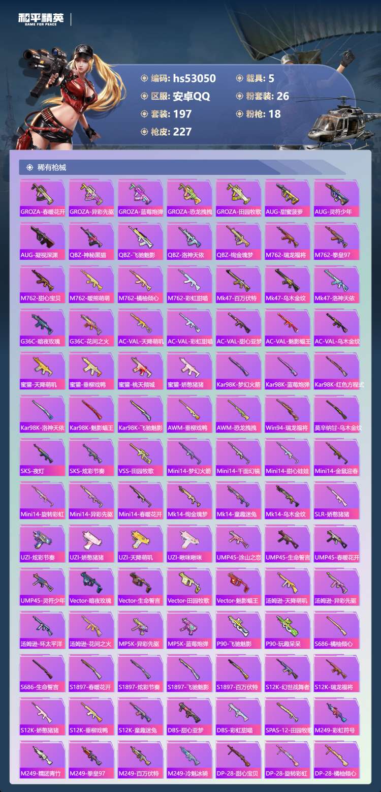 hs53050 安卓手Q-25王牌印记-有战神框-26粉装-18特效枪-5载具-111111热力值-