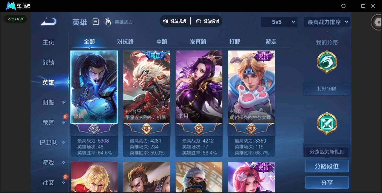实名: 可修改 贵族等级: V6 英雄数: 120 皮肤数: 82 传说皮: 妄想实况 限定皮: 齐天大圣,至美·乘鲤谣,鸣野蒿,陌上桑,映山客