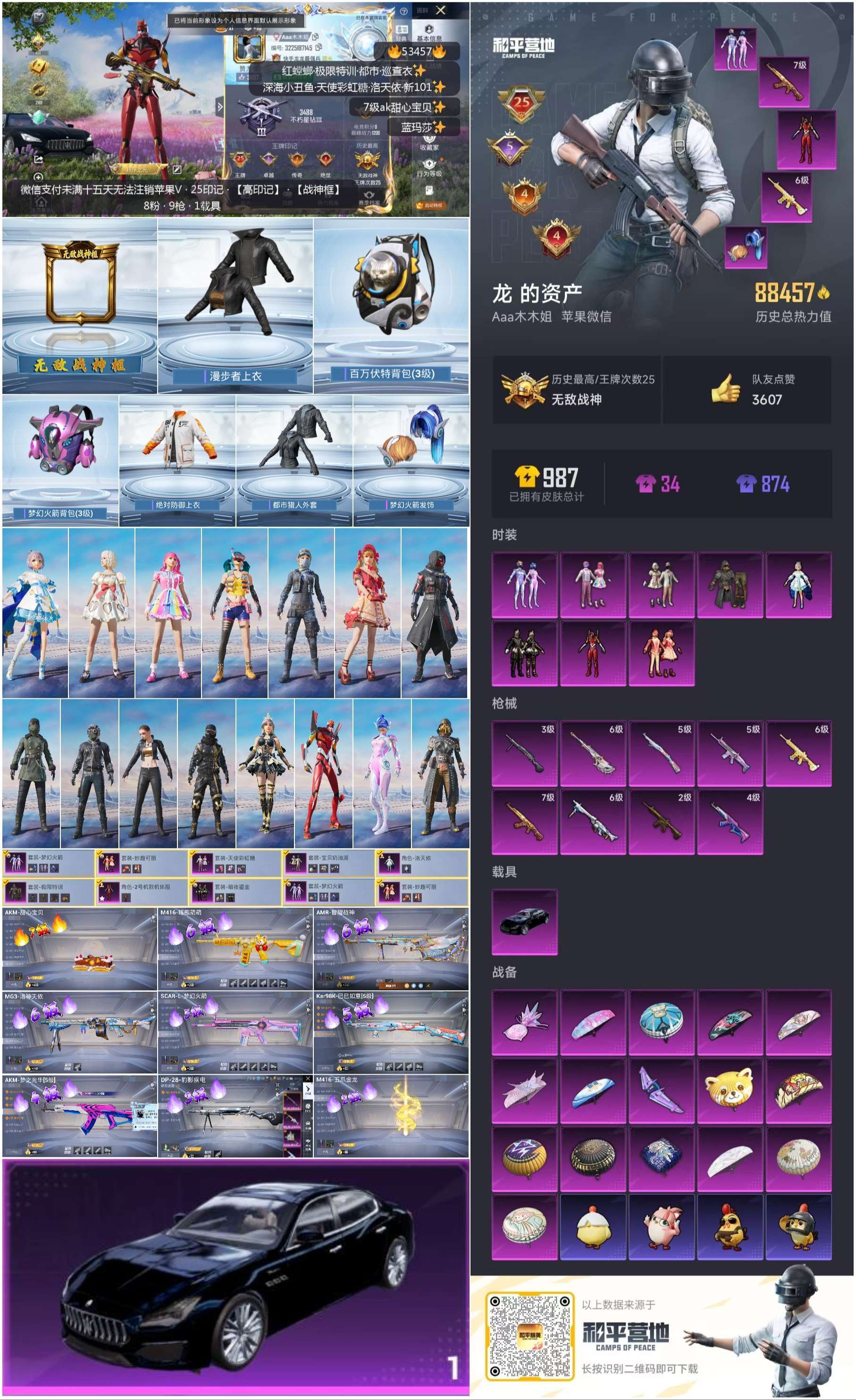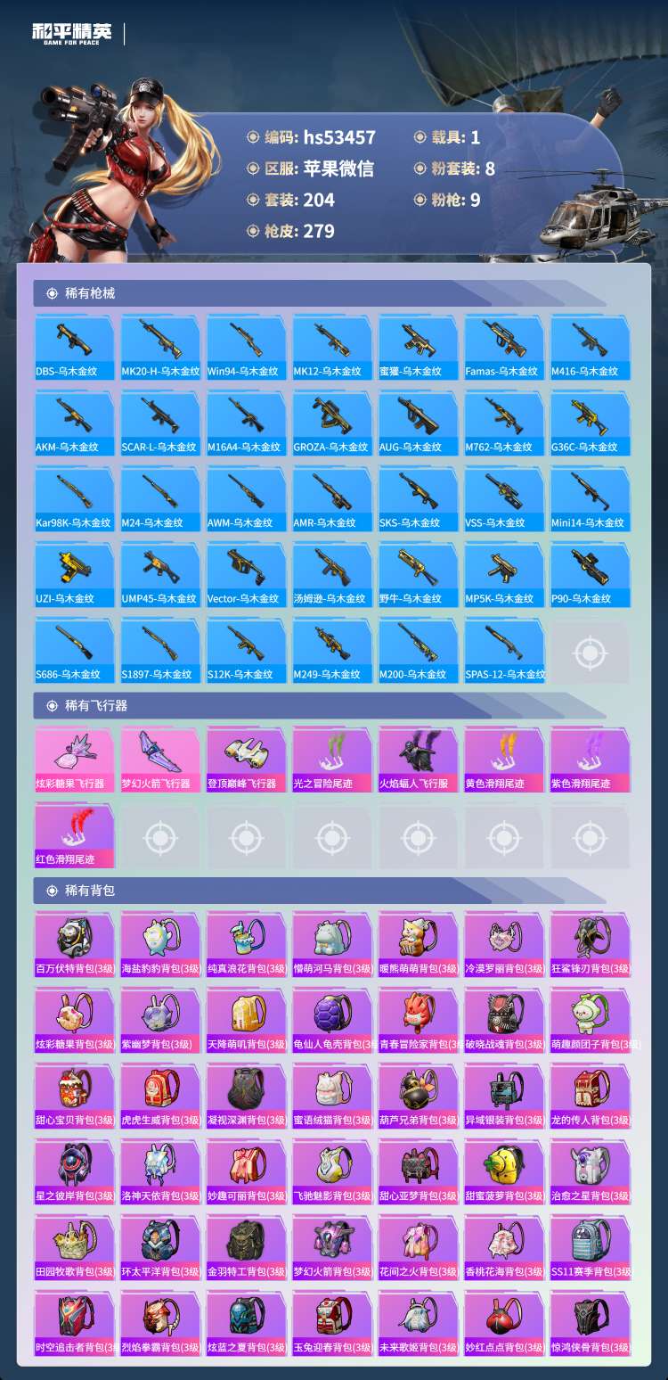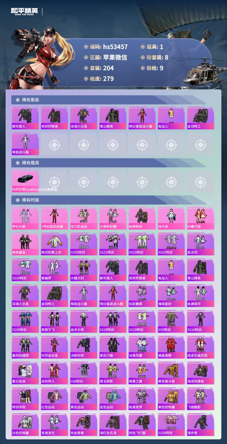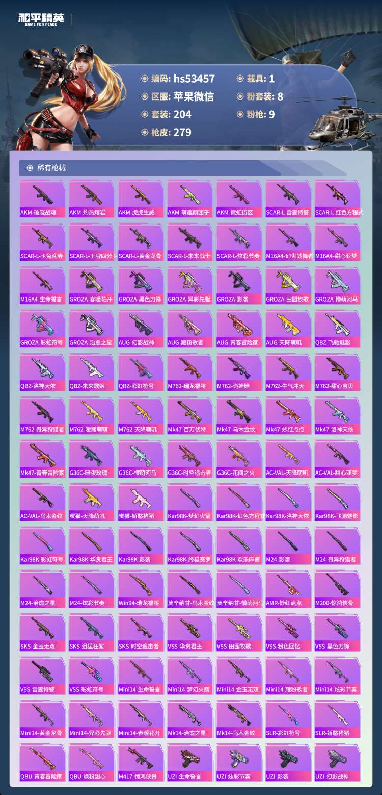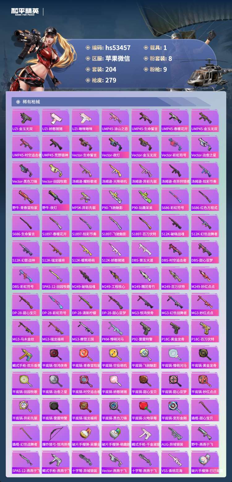 hs53457 苹果v-25王牌印记-有战神框-8粉装-9特效枪-1载具-88457热力值-204
