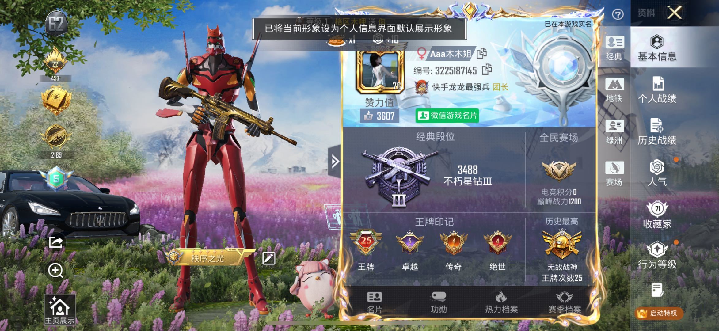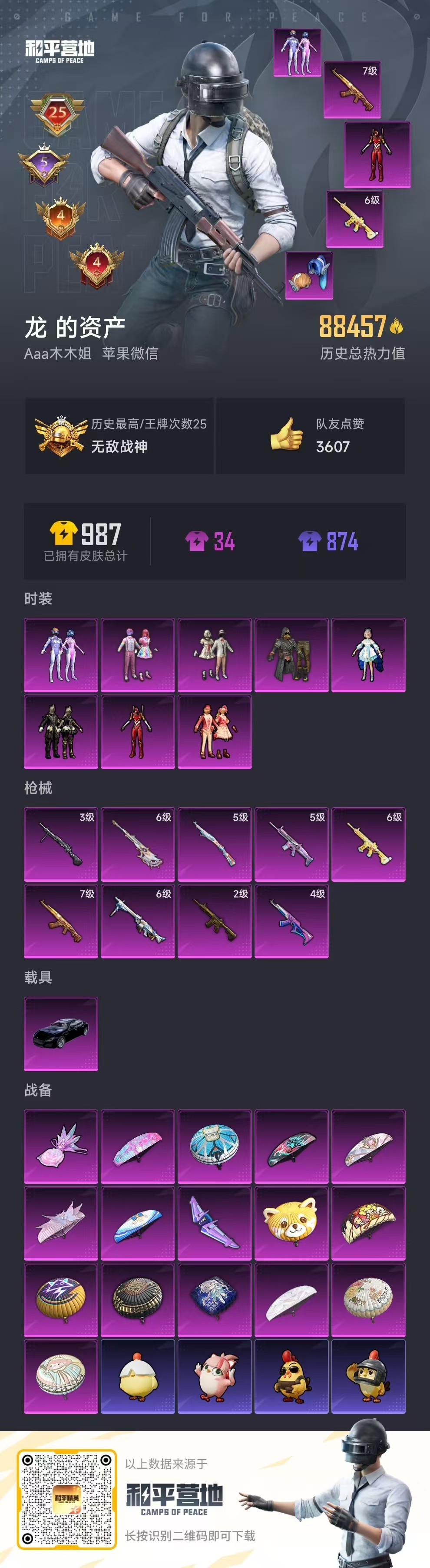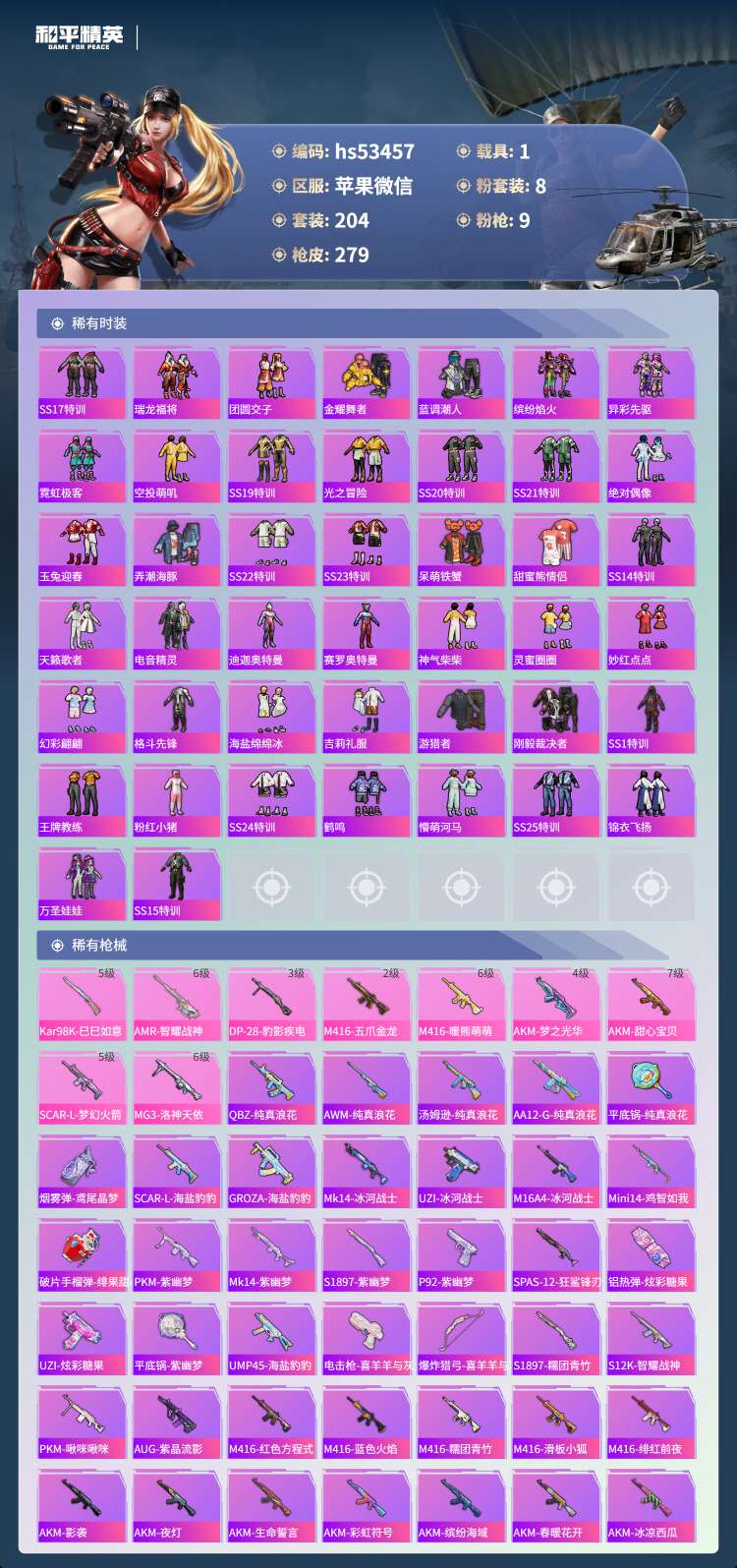 hs53457 苹果微-25王牌印记-有战神框-8粉装-9特效枪-1载具-88457热力值-204
