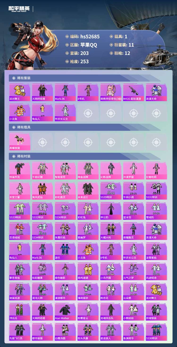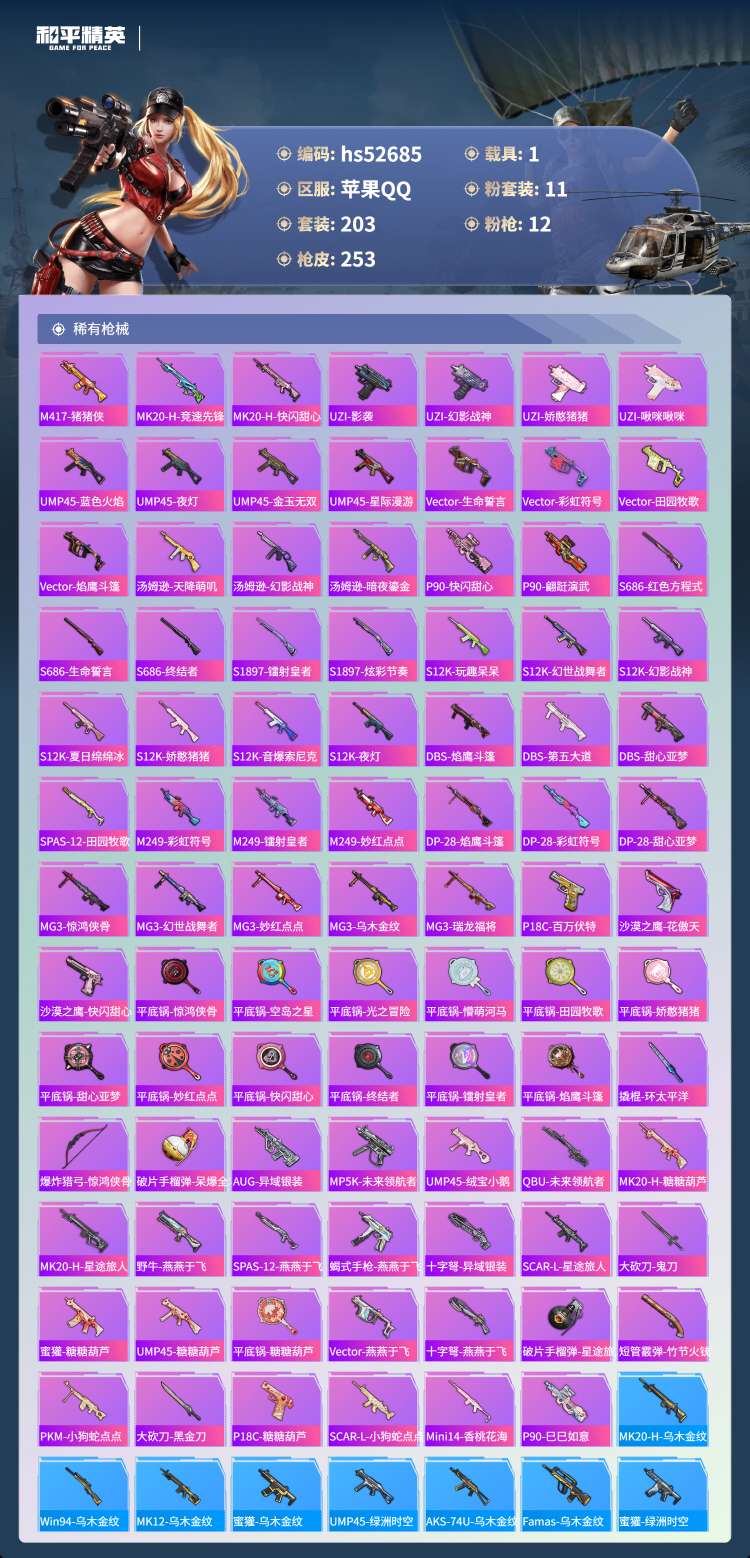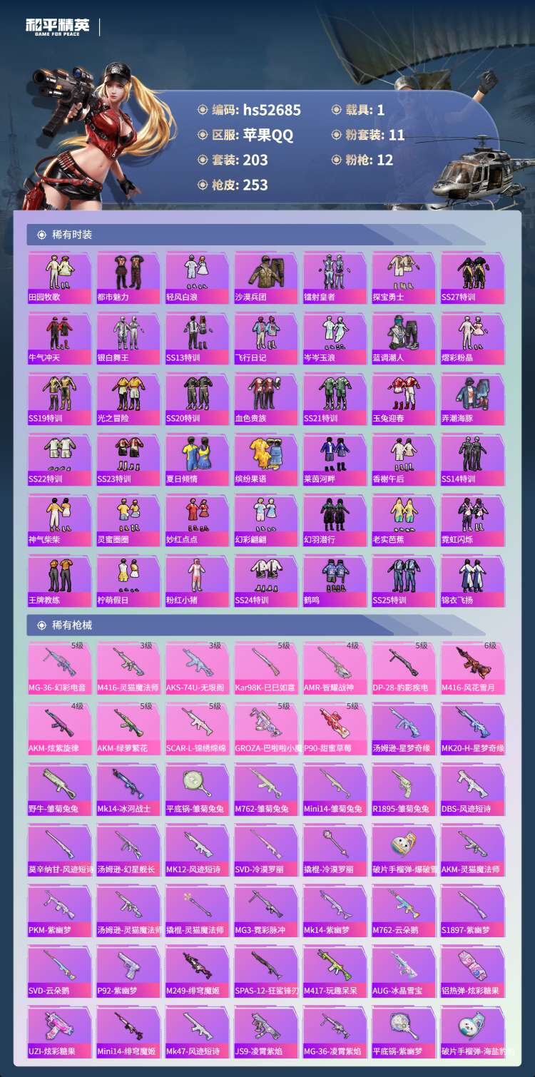 hs52685 苹果手Q-14王牌印记-有战神框-11粉装-12特效枪-1载具-77909热力值-2