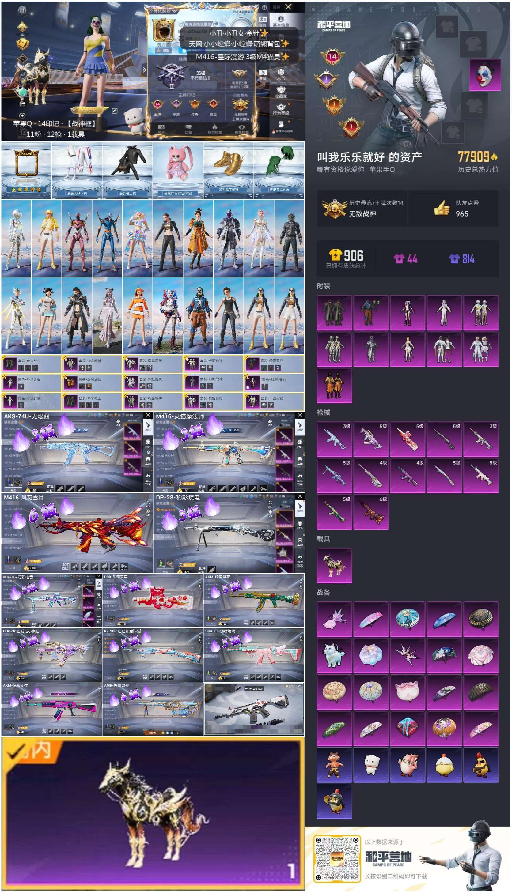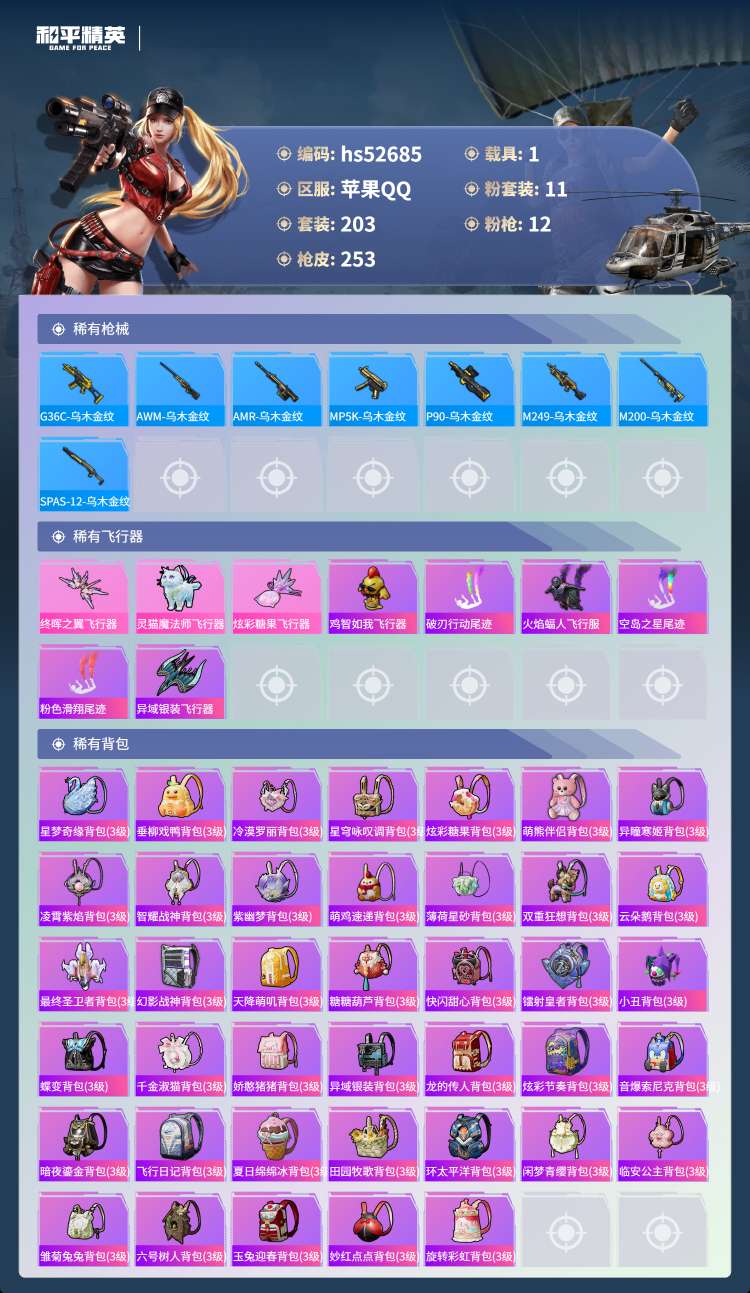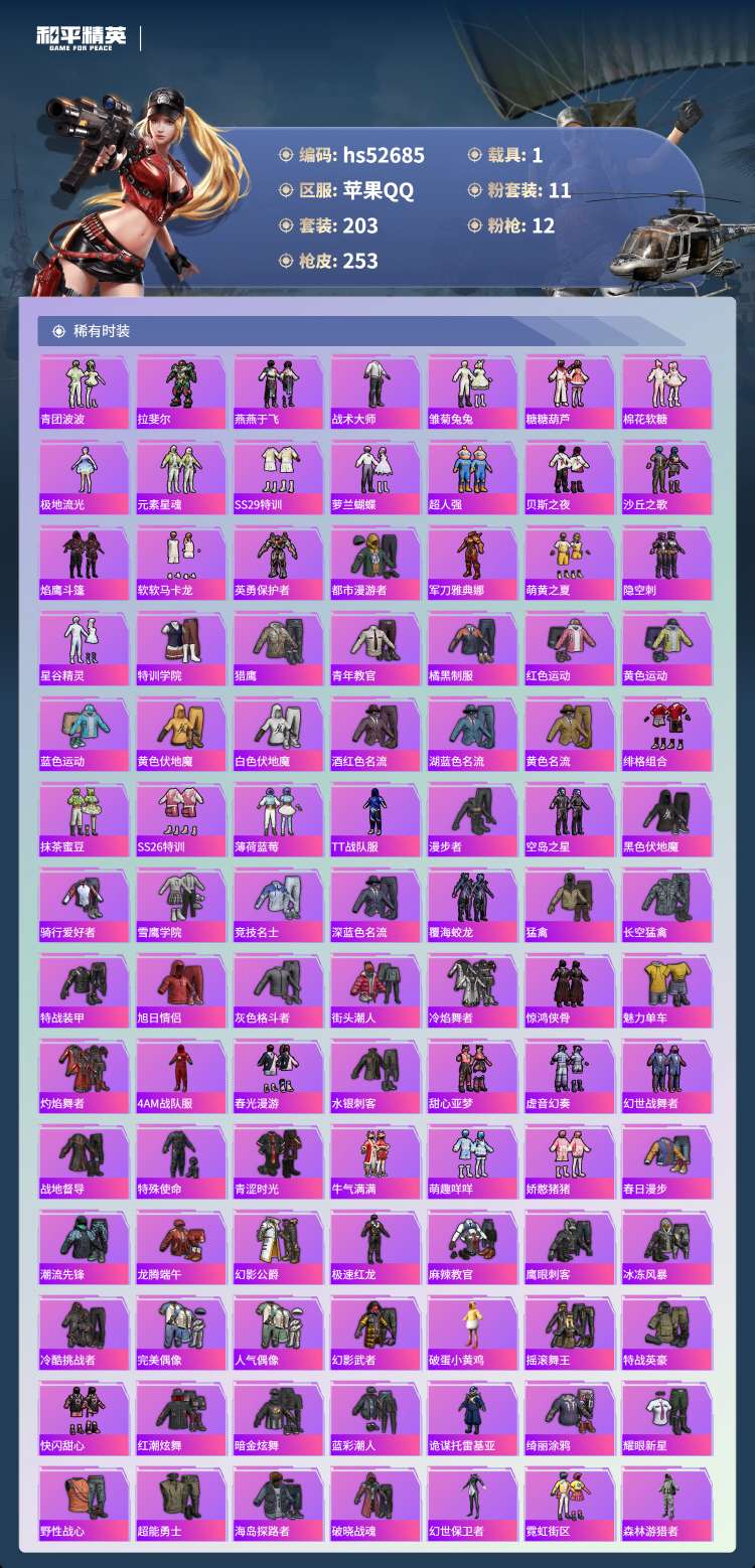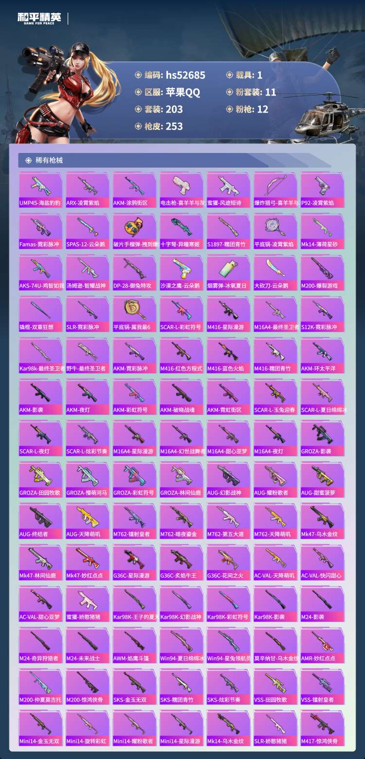 hs52685 苹果手Q-14王牌印记-有战神框-11粉装-12特效枪-1载具-77909热力值-2