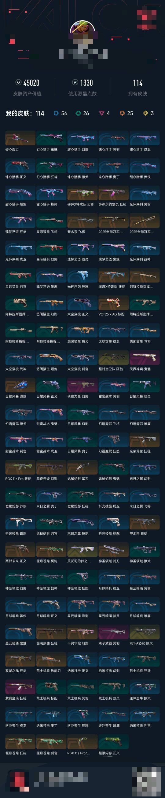 【WWN230】终极*25/传奇*3/卓越*4/皮肤*114/等级*179/段位:钻石/2025全球冠军赛套装/幻棱/炼狱/维斯/暮蝶/钛狐/壹决/铁臂/捷风/雷兹/幽影/不死鸟/贤者/猎枭/蝰蛇/零/芮娜/奇乐/尚勃勒/霓虹/斯凯/夜露/星礈/K/O/海神/盖可/黑梦/钢锁/近战武器-2025全球冠军赛 蝴蝶刀/近战武器-RGX 11z Pro//3.0 爪刀/近战武器-荒土机兵 热能刀/近战武器-诡秘蛇影 军刀/近战武器-神圣领域 战刀/近战武器-日耀风暴 遗器/近战武器-阿特拉斯指挥部 甩
