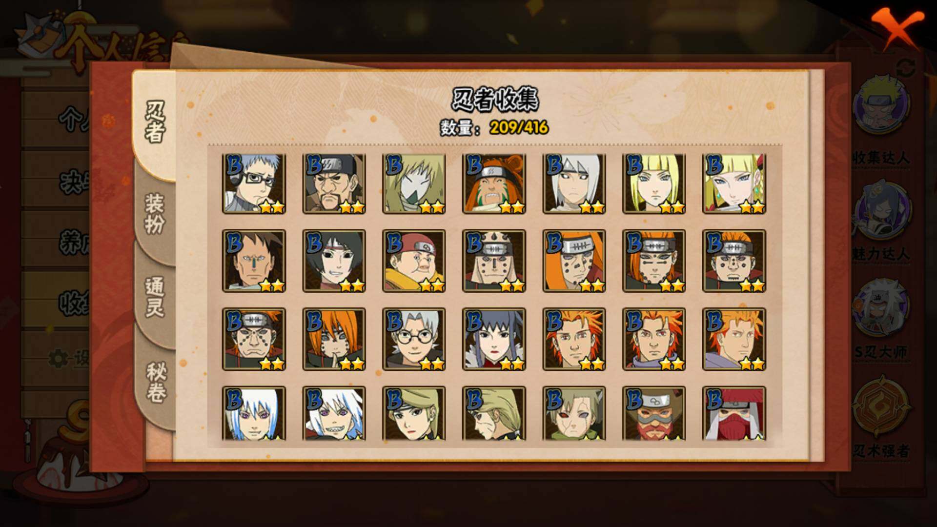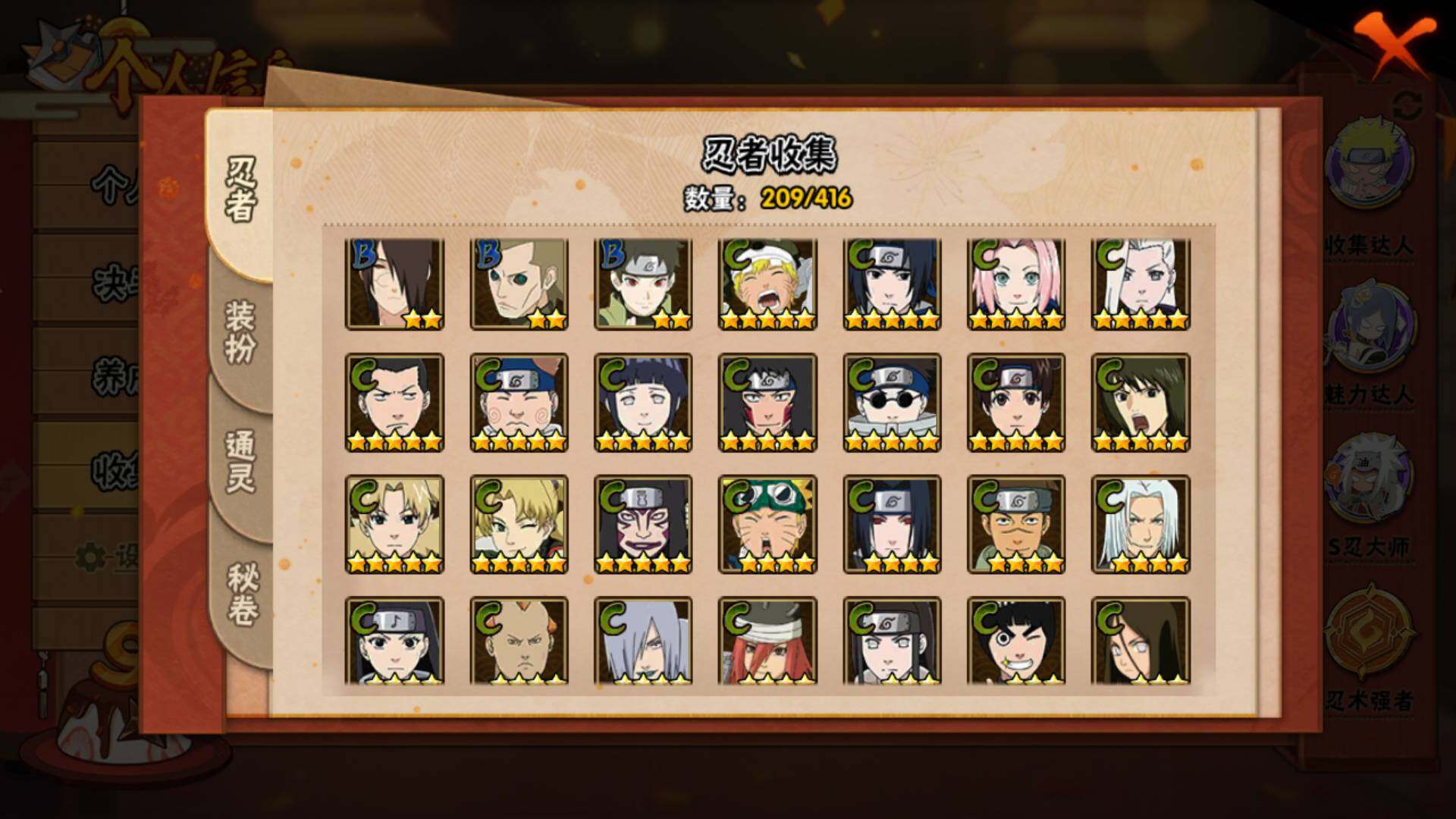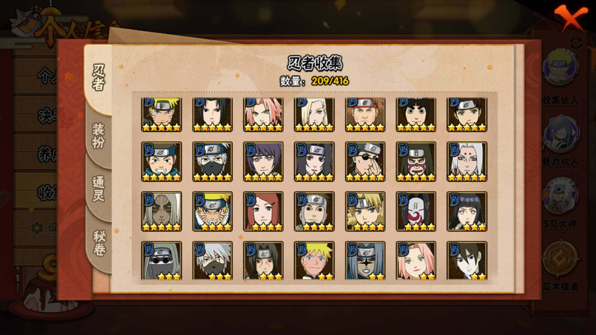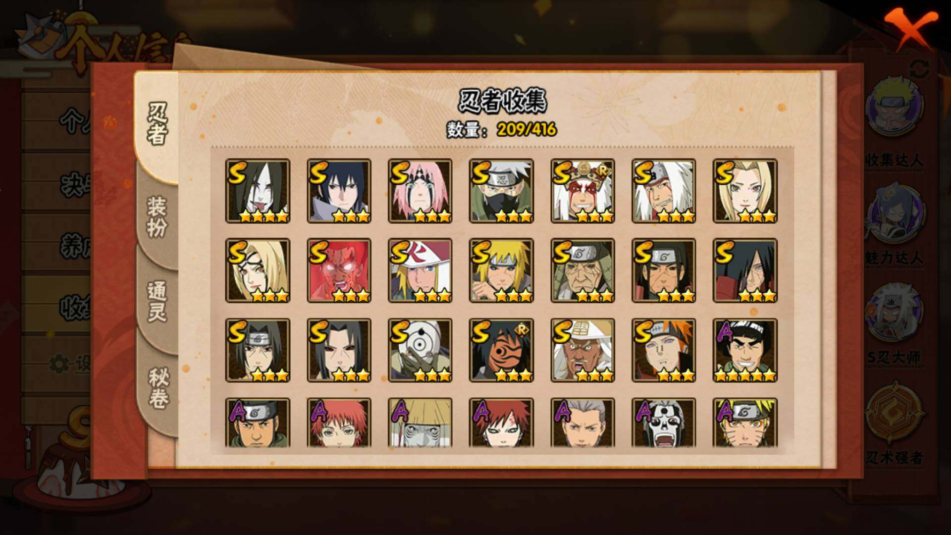 【S级忍者】:猿飞日斩「秽土转生」(3星),波风水门「秽土转生」(3星),千手柱间「秽土转生」(3星),宇智波鼬「秽土转生」(3星),宇智波斑「秽土转生」(3星),春野樱「忍界大战」(3星),宇智波鼬「须佐能乎」(3星),旗木卡卡西