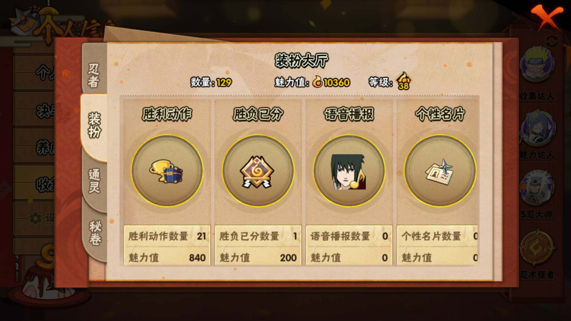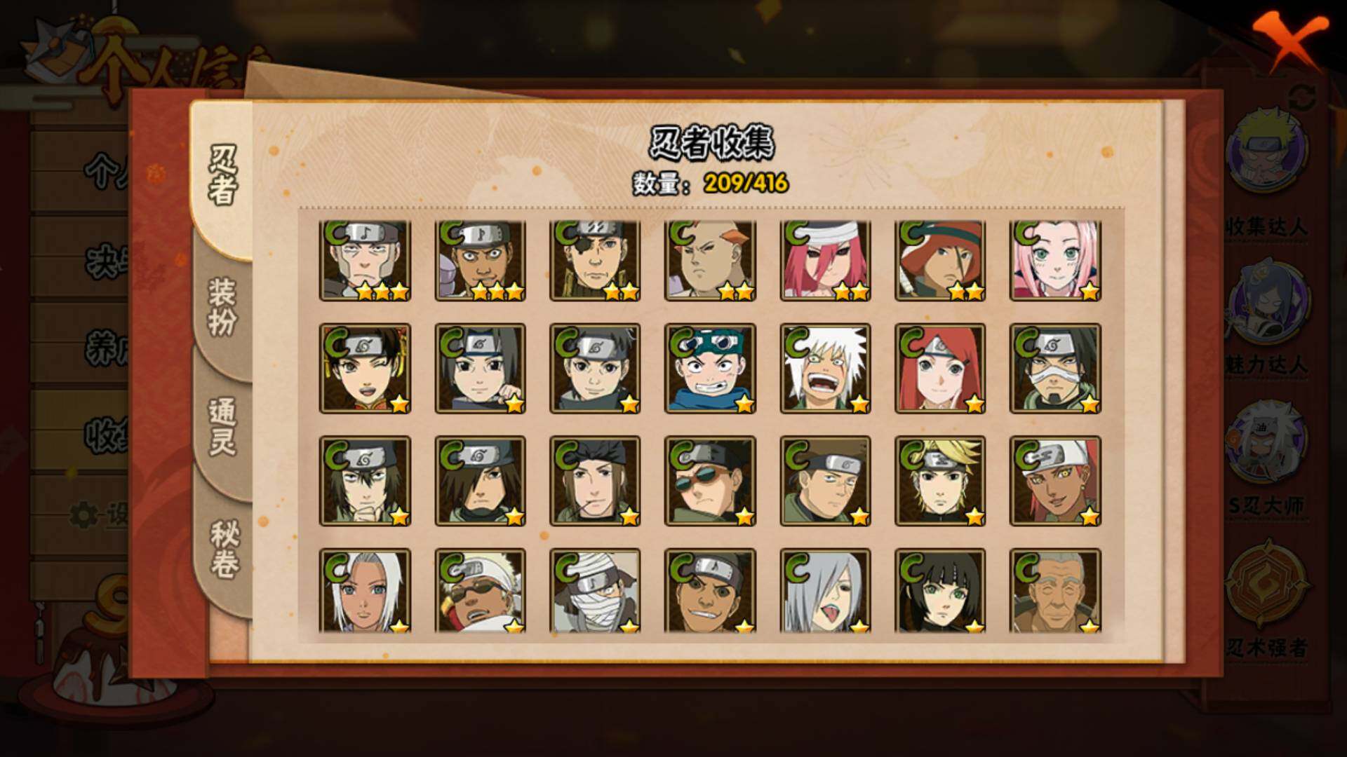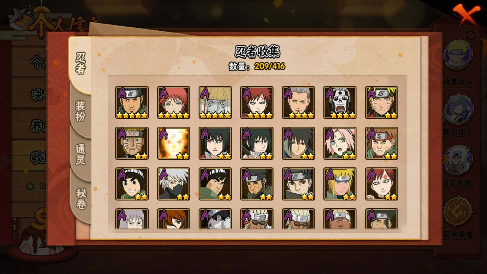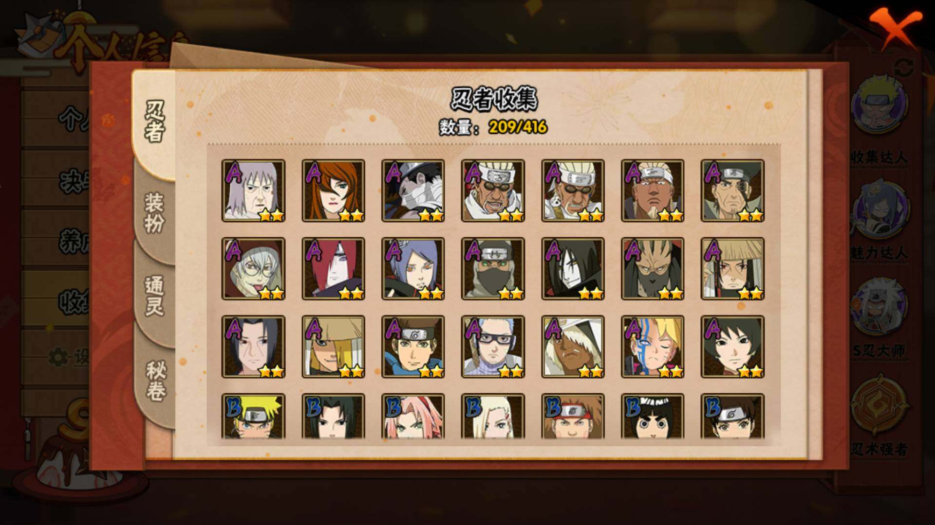 【S级忍者】:猿飞日斩「秽土转生」(3星),波风水门「秽土转生」(3星),千手柱间「秽土转生」(3星),宇智波鼬「秽土转生」(3星),宇智波斑「秽土转生」(3星),春野樱「忍界大战」(3星),宇智波鼬「须佐能乎」(3星),旗木卡卡西