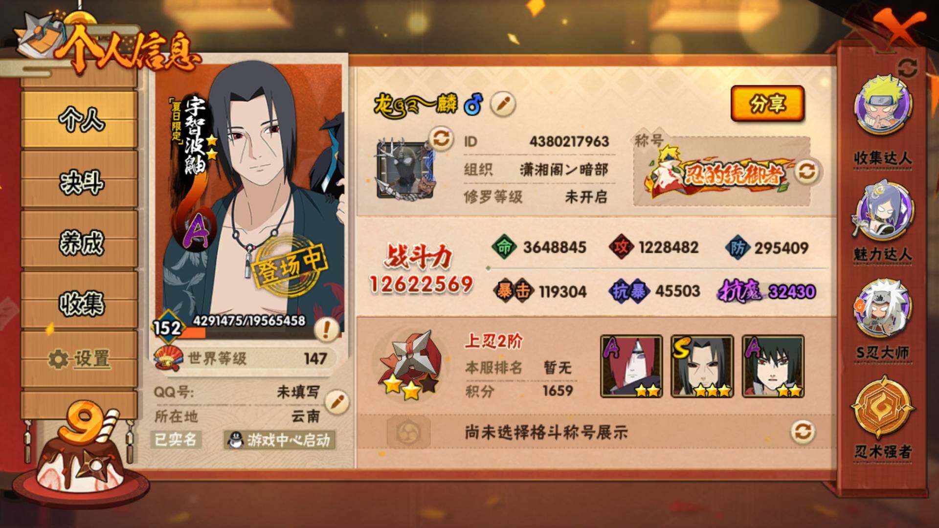 V9 20S 43A 1262万战力 热门A:夏日鼬、百豪樱。秽土扉间44片、