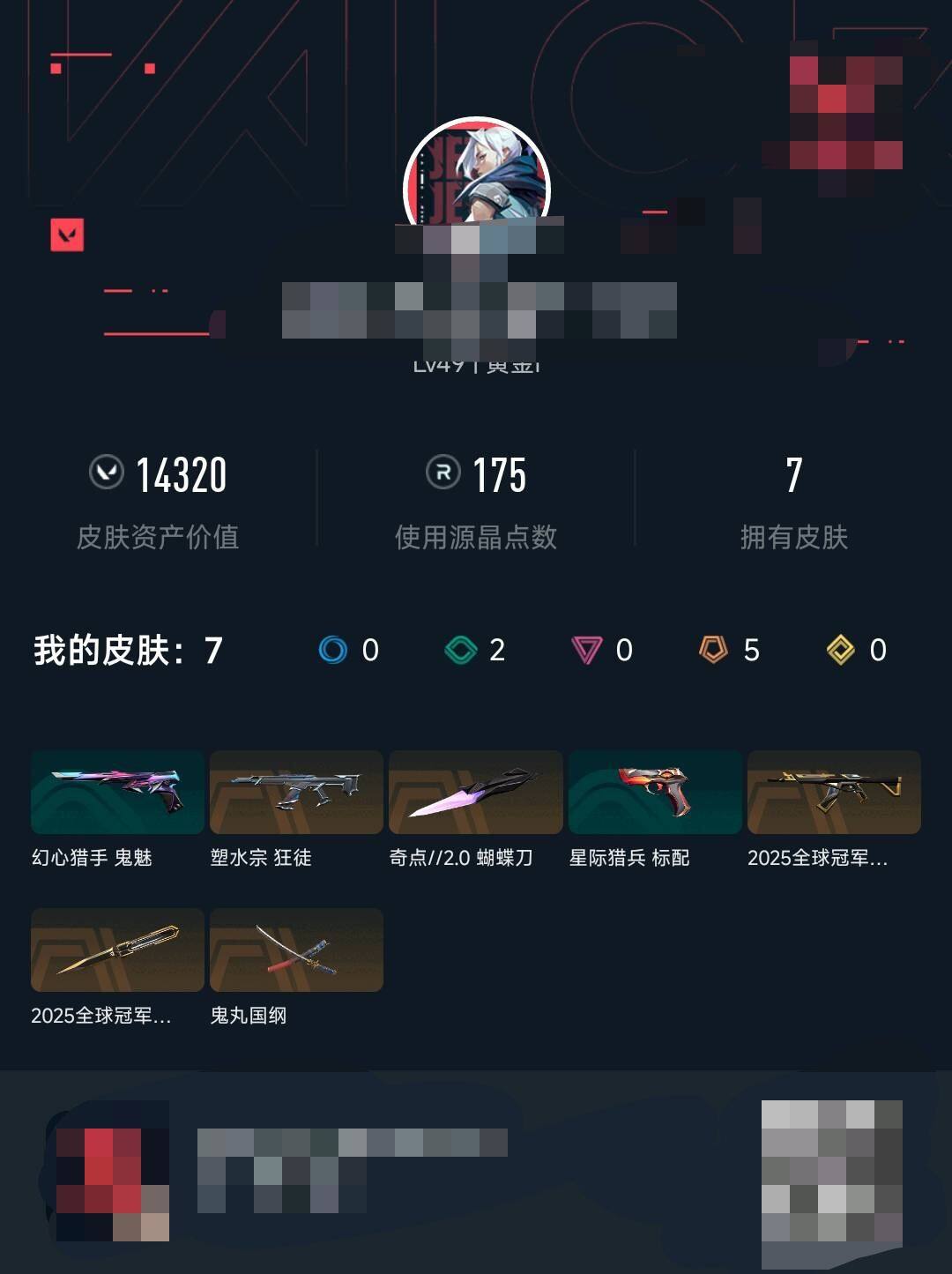 【WWN233】终极*5/皮肤*7/等级*49/段位:黄金/2025全球冠军赛套装/炼狱/暮蝶/壹决/捷风/雷兹/不死鸟/贤者/猎枭/芮娜/尚勃勒/霓虹/近战武器-2025全球冠军赛 蝴蝶刀/近战武器-奇点//2.0 蝴蝶刀/近战武器-鬼丸国纲/狂徒-2025全球冠军赛/狂徒-塑水宗/无畏契约GO!第一卷:芮娜 卡面/无畏契约GO!第一卷:零 卡面/代号红色 卡面/新兵报到 卡面/V契约 卡面/无畏契约 卡面/买装还是存钱 喷漆/胜利属于无畏契约 喷漆/GLHF 喷漆/无畏契约 喷漆/天外飞客