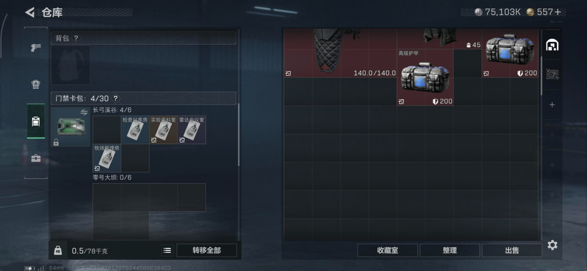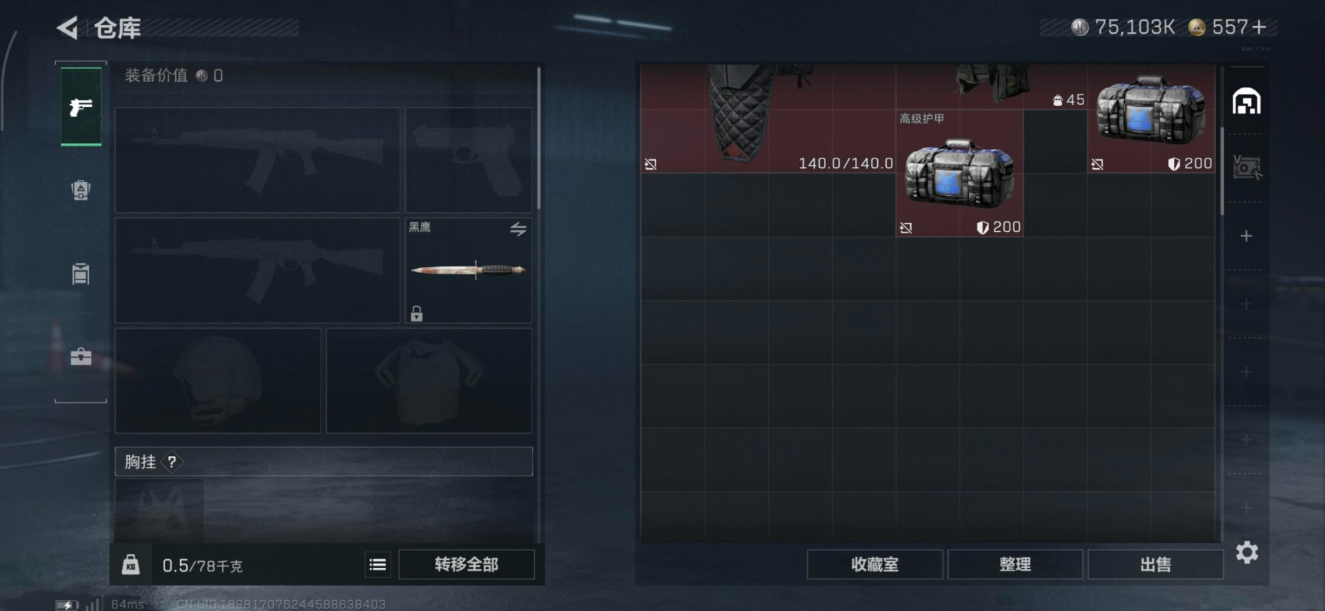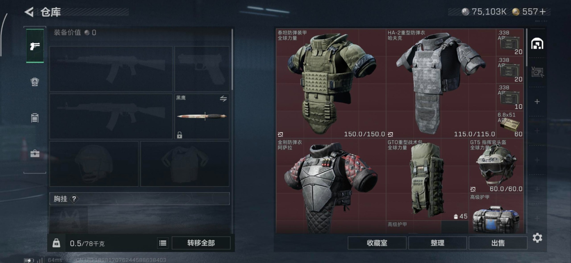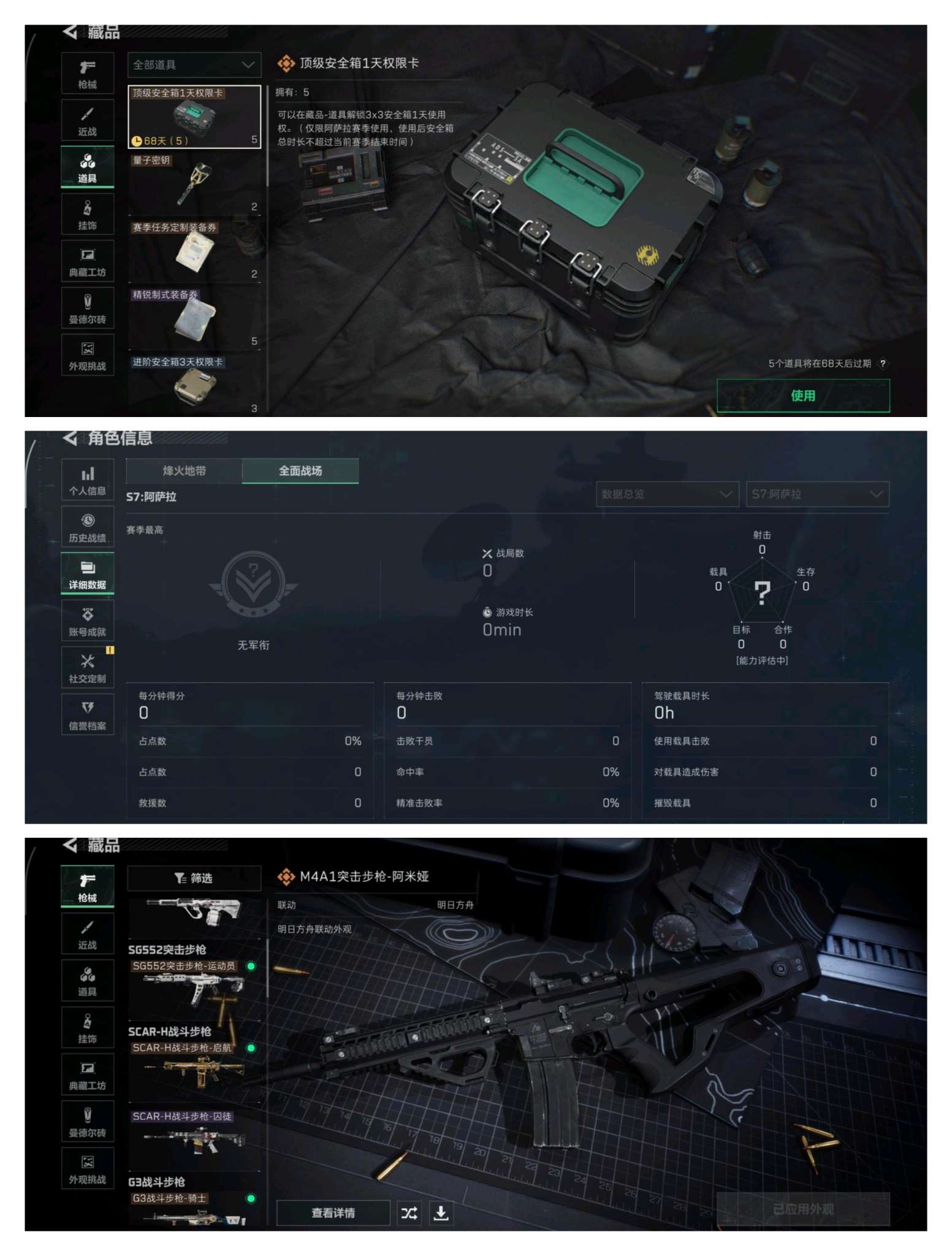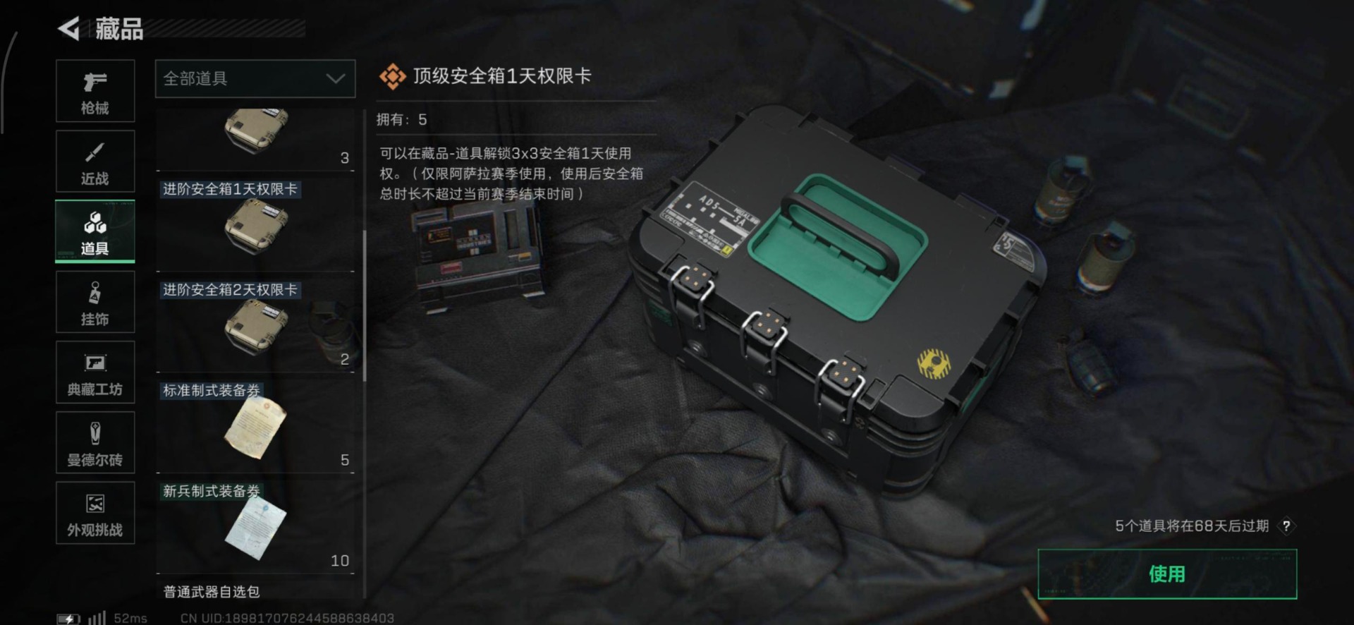 总资产:185.1M 11传说枪械 高级安全箱(2×3)1.28号到期 哈夫币:75.103K 可二
