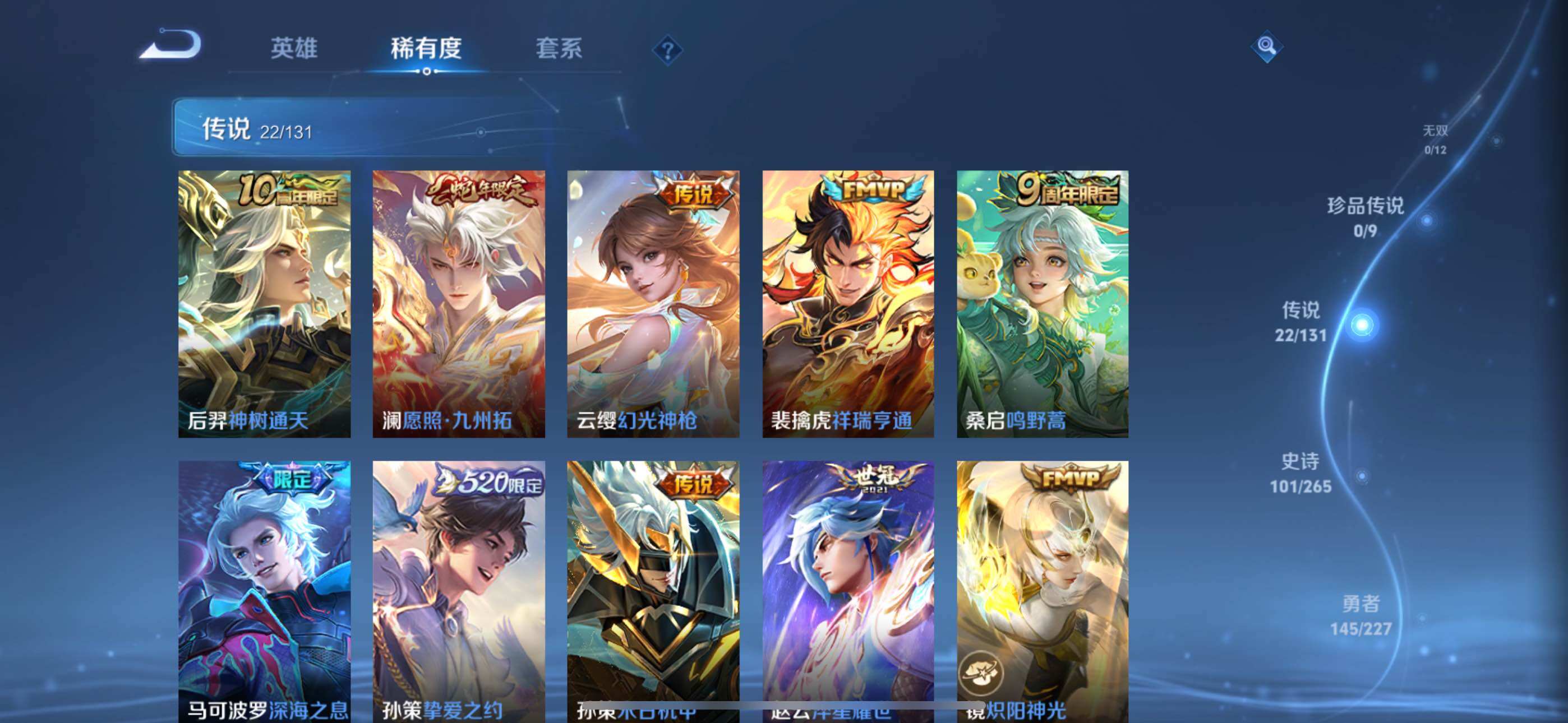 【传说皮肤】:后羿神树通天,澜愿照九州拓,云缨幻光神枪,裴擒虎祥瑞亨通,桑启鸣野蒿,马可波罗深海之息,孙策挚爱之约,孙策末日机甲,赵云淬星耀世,镜炽阳神光,虞姬启明星使,李信一念神魔,刘备时之恋人,貂蝉猫影幻舞,干将莫邪久胜战神,百