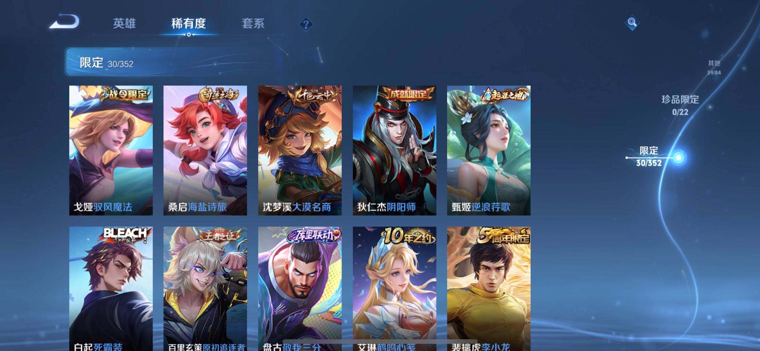 【限定皮肤】:姜子牙天穹之誓,狄仁杰阴阳师,赵云皇家上将,高渐离玩趣恶龙,项羽海滩派对,兰陵王金