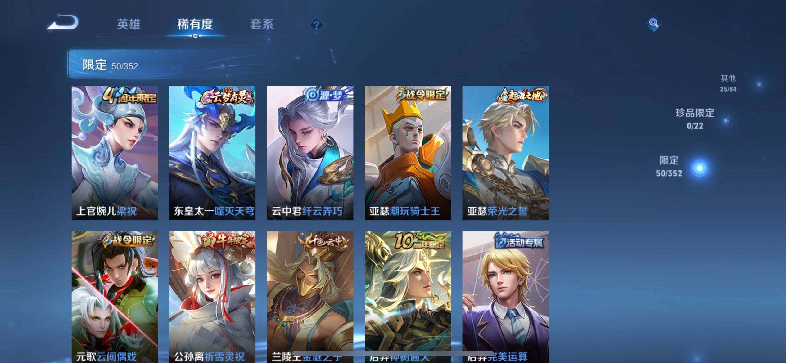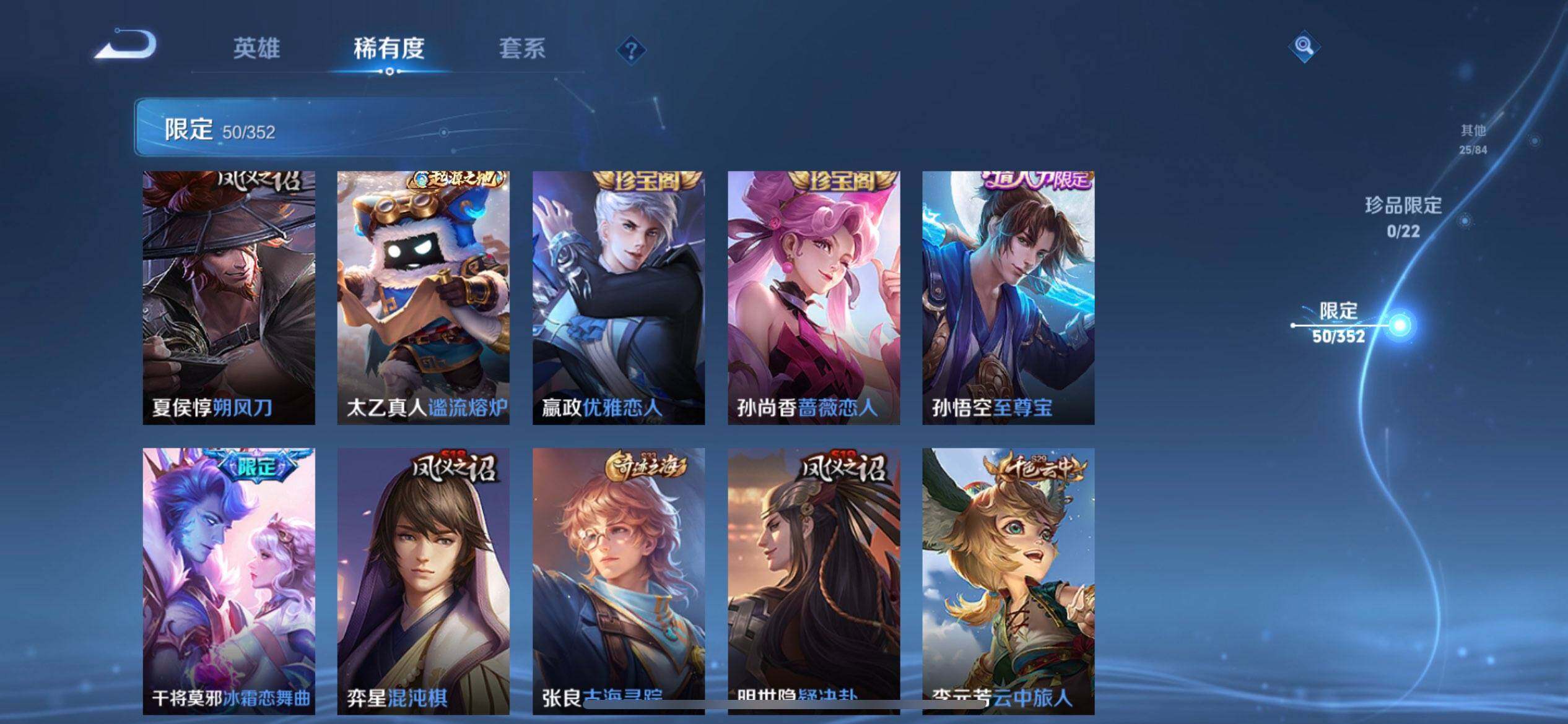 【限定皮肤】:狄仁杰阴阳师,赵云皇家上将,嬴政优雅恋人,孙尚香蔷薇恋人,元歌云间偶戏,夏侯惇朔风刀,狄仁杰魔