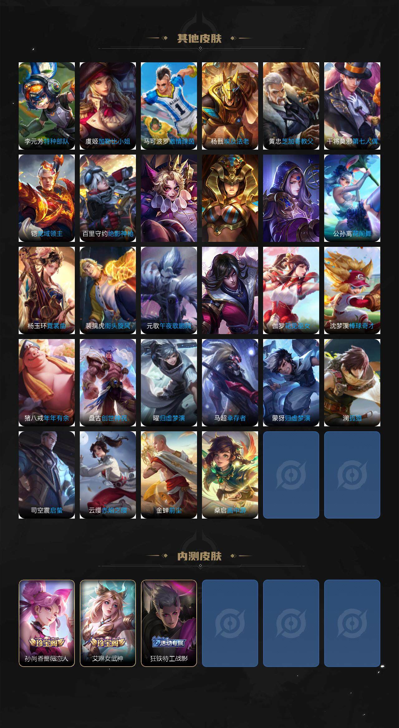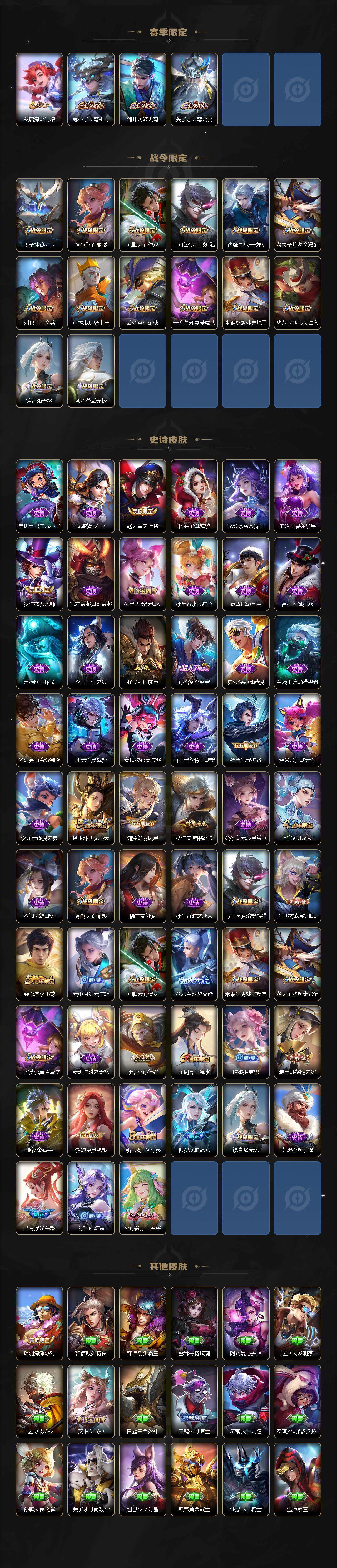 【限定皮肤】:姜子牙天穹之誓,狄仁杰阴阳师,赵云皇家上将,墨子神迹守卫,孙尚香蔷薇恋人,庄周高山流水,阿轲迷踪丽影,芈月重明,元歌云间偶戏,夏侯惇朔风刀,曹操烛