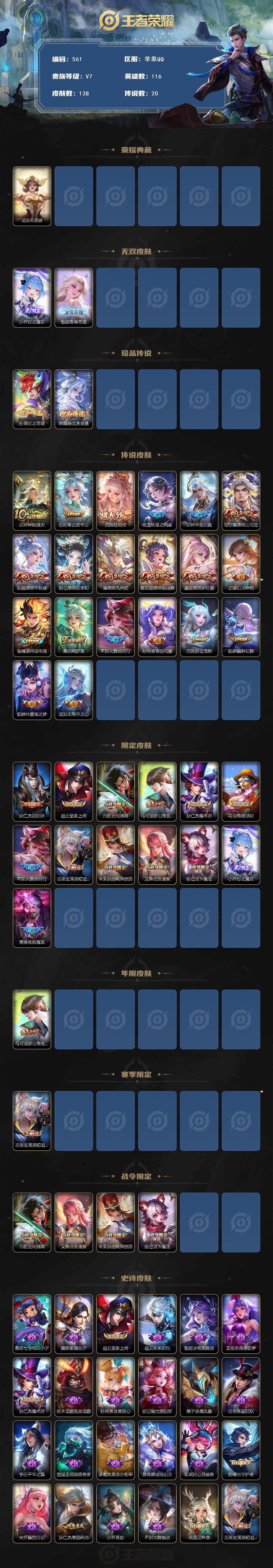 1786975 纯女号 一套蛇年 苹果Q-V7-最强王者段位-116英雄-138皮肤-1典藏英雄-2无双-2珍品传说-20传说-47史诗