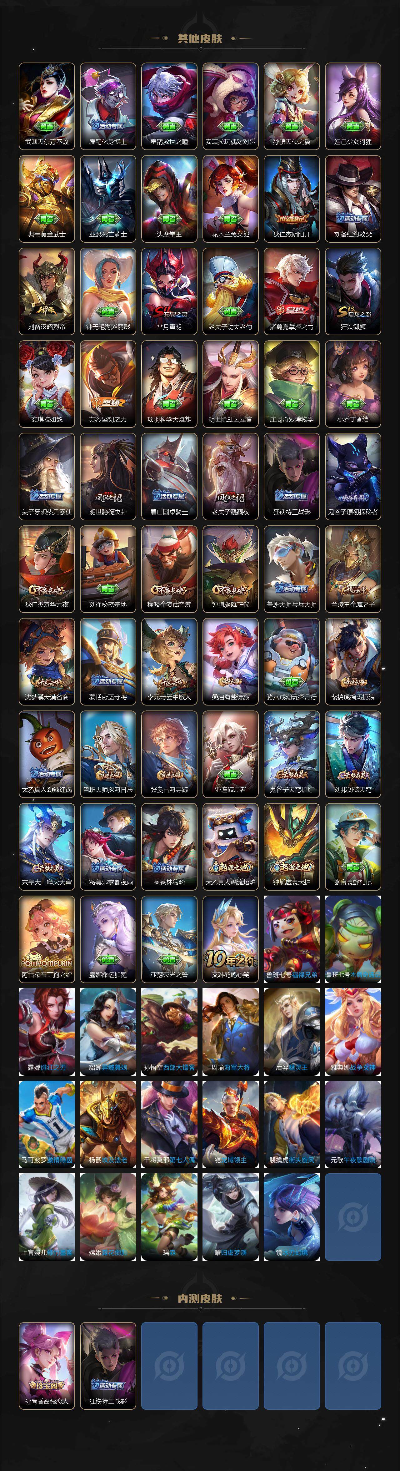 【限定皮肤】:狄仁杰阴阳师,赵云皇家上将,孙尚香蔷薇恋人,芈月重明,元歌无心,甄姬游园惊梦,狄仁杰魔术师,狄仁杰万华元夜,项羽海滩派对,老夫子醍醐杖,程咬金演武夺筹,兰陵王金庭之子,孙悟空至尊宝,