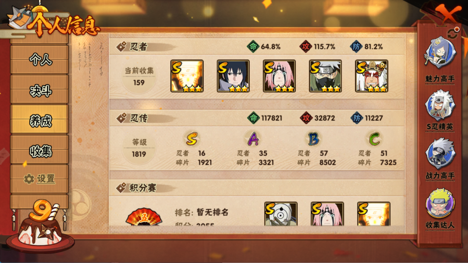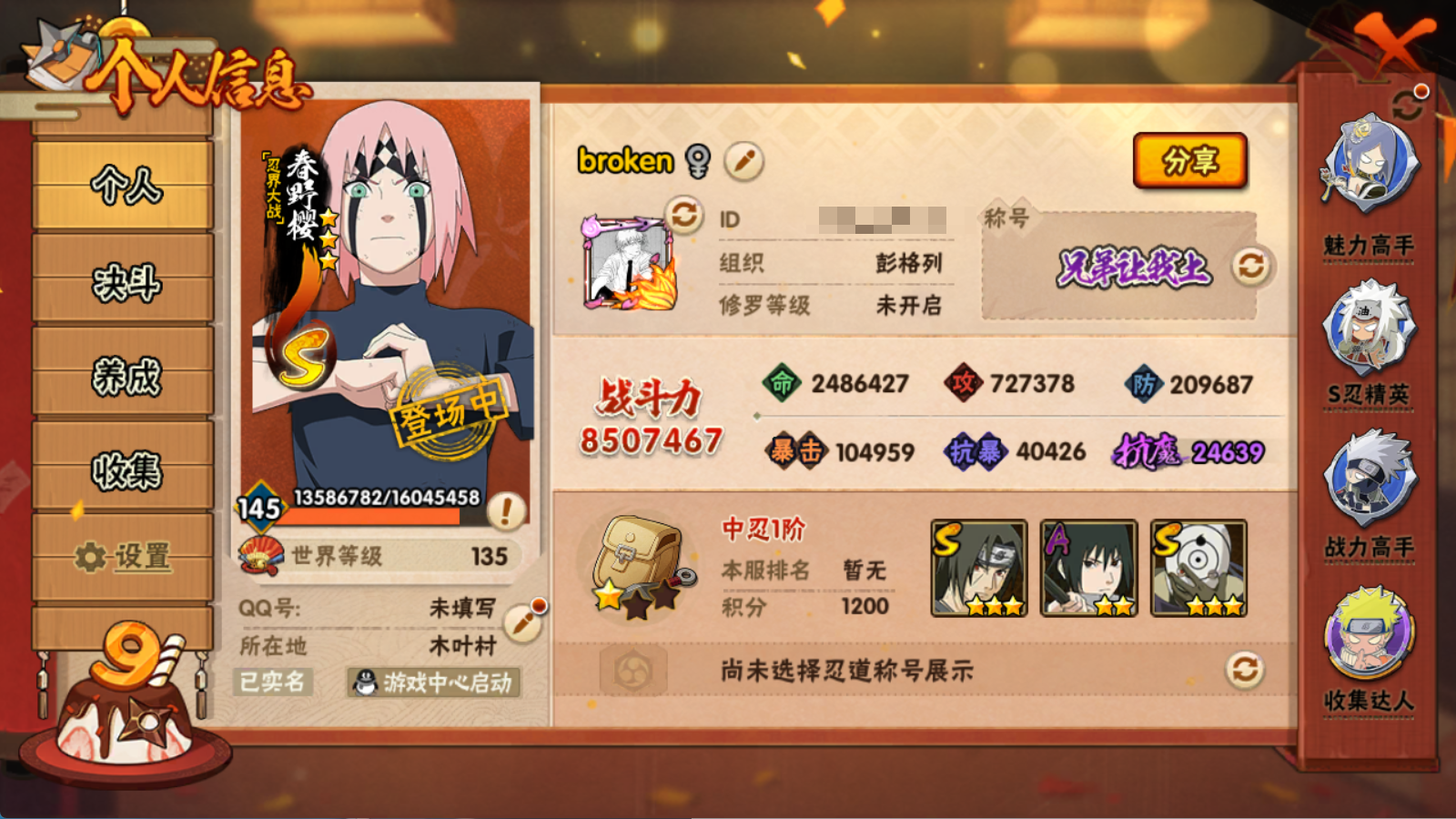 850W战力 白面 死水 红夜带土16S+面麻 侠隐纲手 漂泊小南3个198直购35A+双百战+90片金水