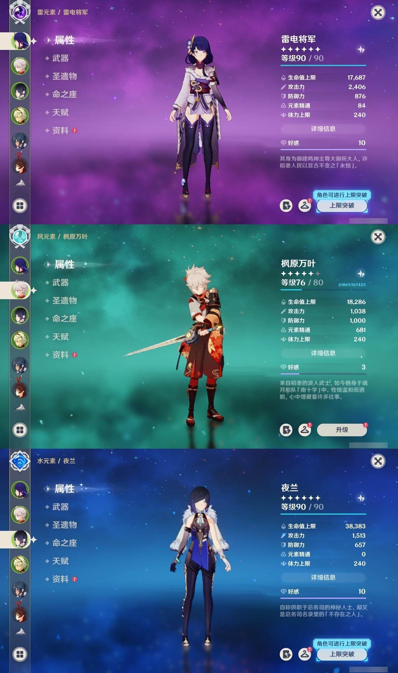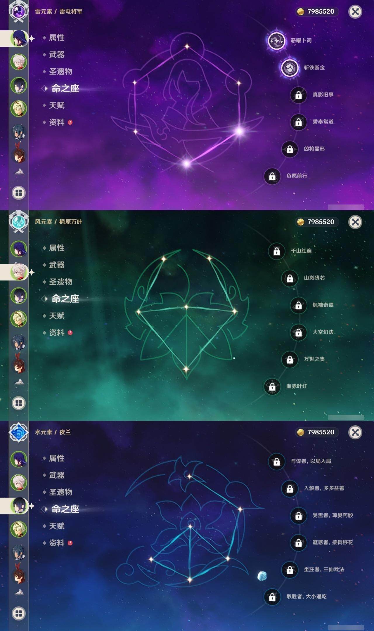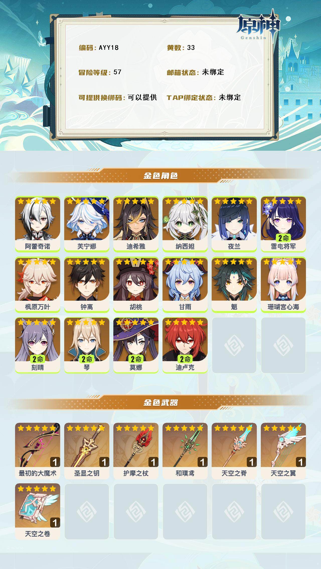 0命阿蕾奇诺,0命芙宁娜,0命迪希雅,0命纳西妲,0命夜兰,2命雷电将军,0命枫原万叶,0命钟离,0命胡桃,0命甘雨,0命魈,0命珊瑚宫心海,2命刻晴,2命琴,2命莫娜,2命迪卢克,精1最初的大魔术,精1圣显之钥,精1护摩之杖,精1和璞鸢,精1天空之脊,精1天空之翼,精1天空之卷
