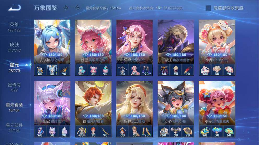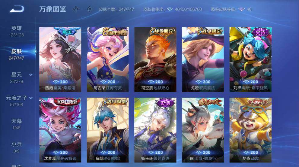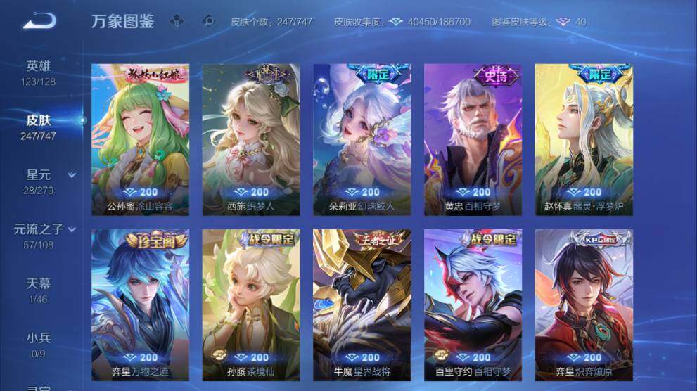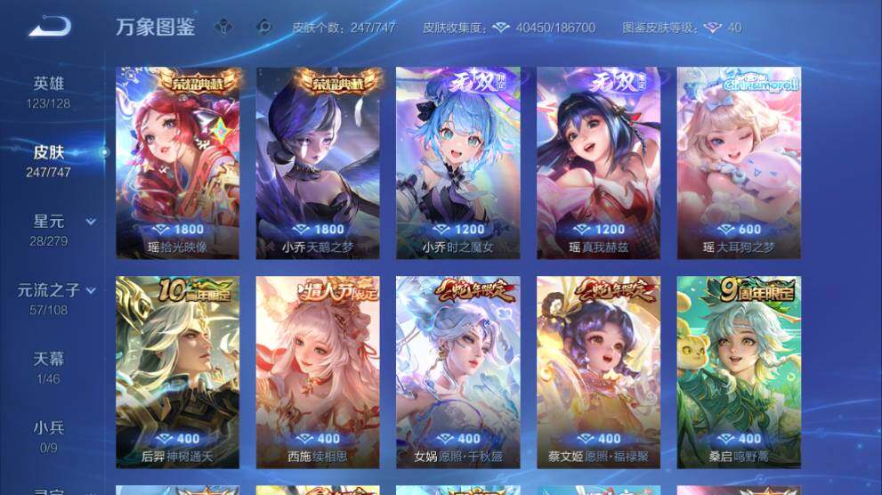 女号瑶全皮-苹果Q-V8-247皮肤-2典藏皮肤-2无双-1珍品传说-14传说-77史诗-1星传说-1天幕-14按键