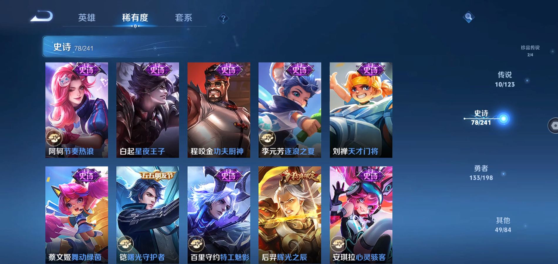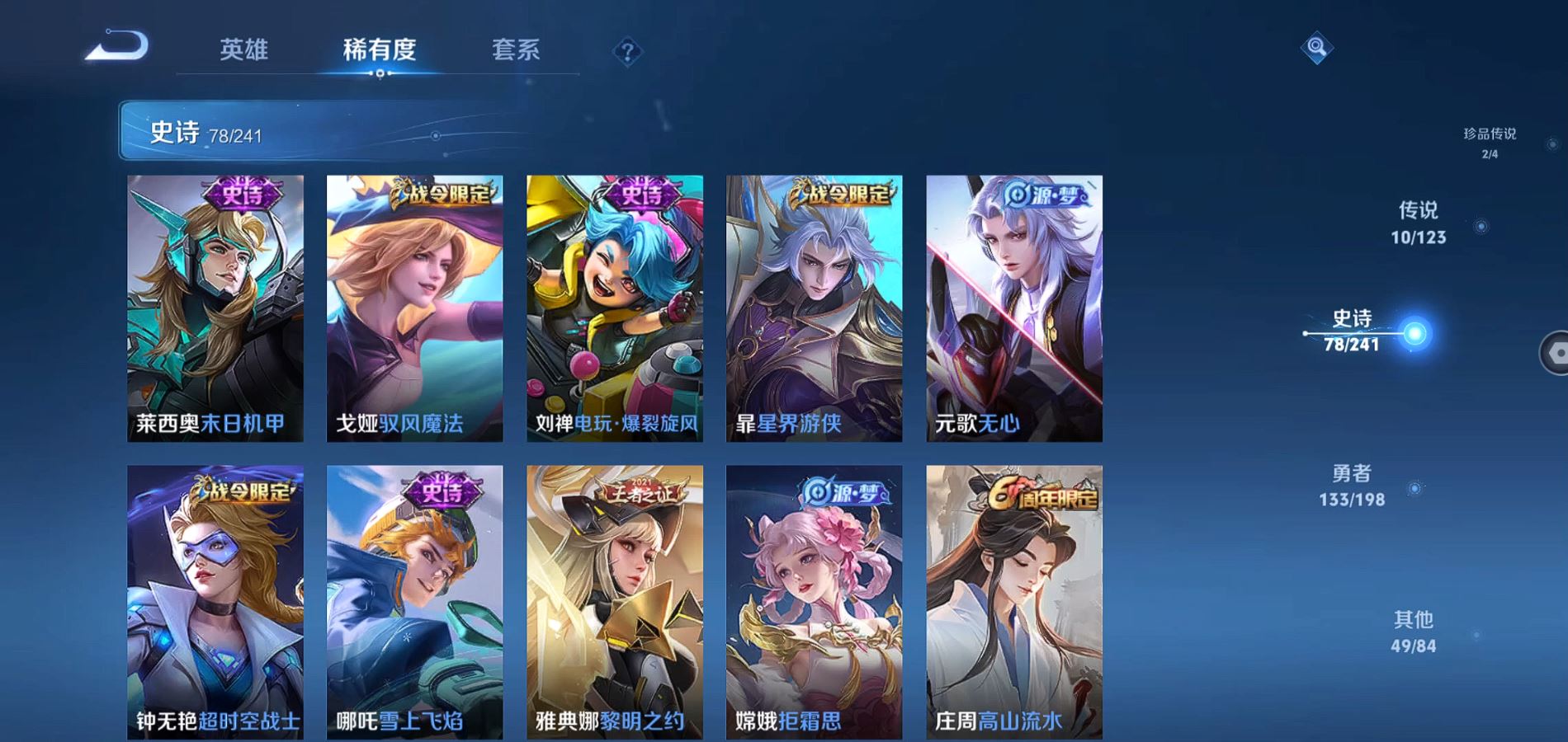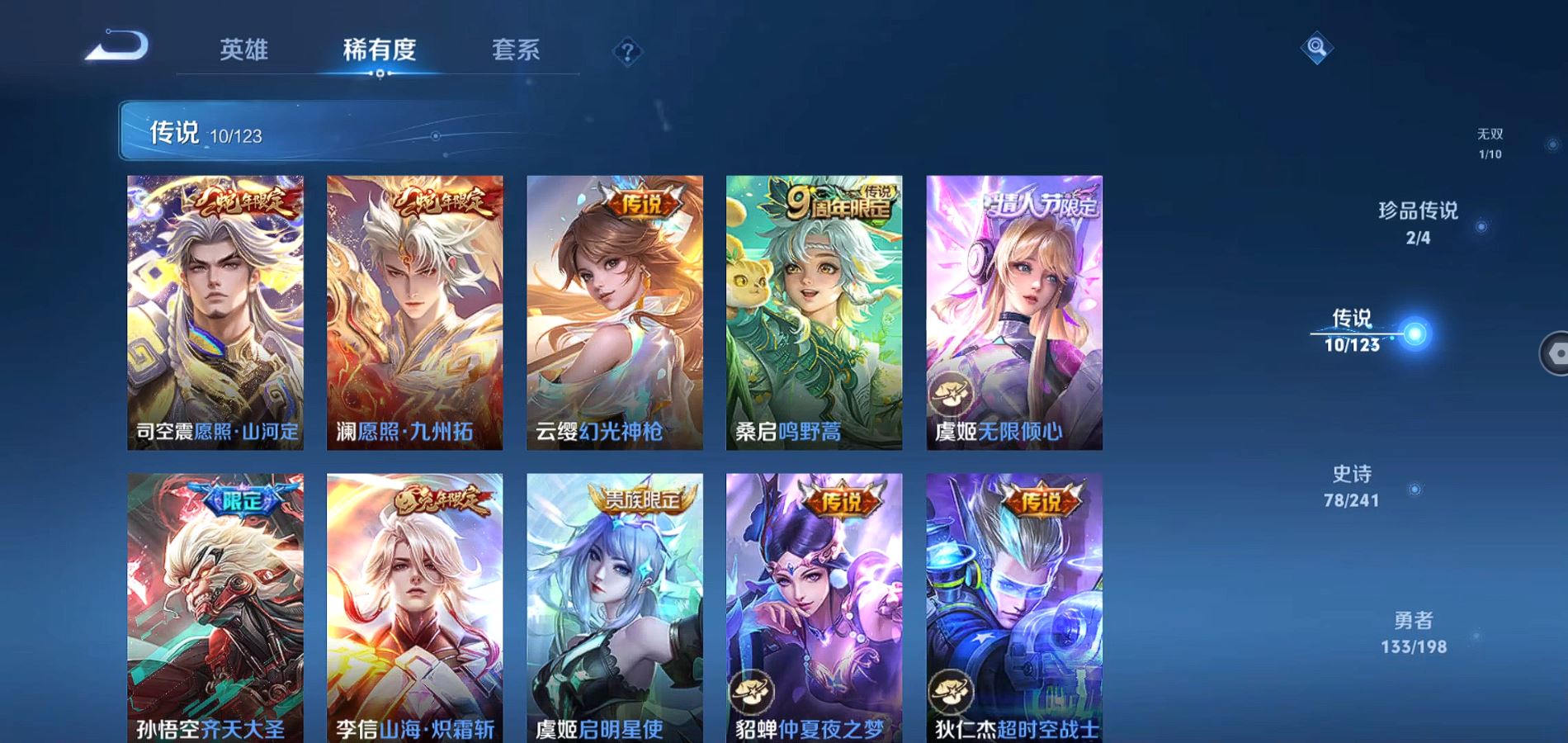 275皮肤2典藏1无双2珍品传说10传说【全皮英雄】司空震全皮 苍全皮【典藏】杀手不太冷 九霄神辉【