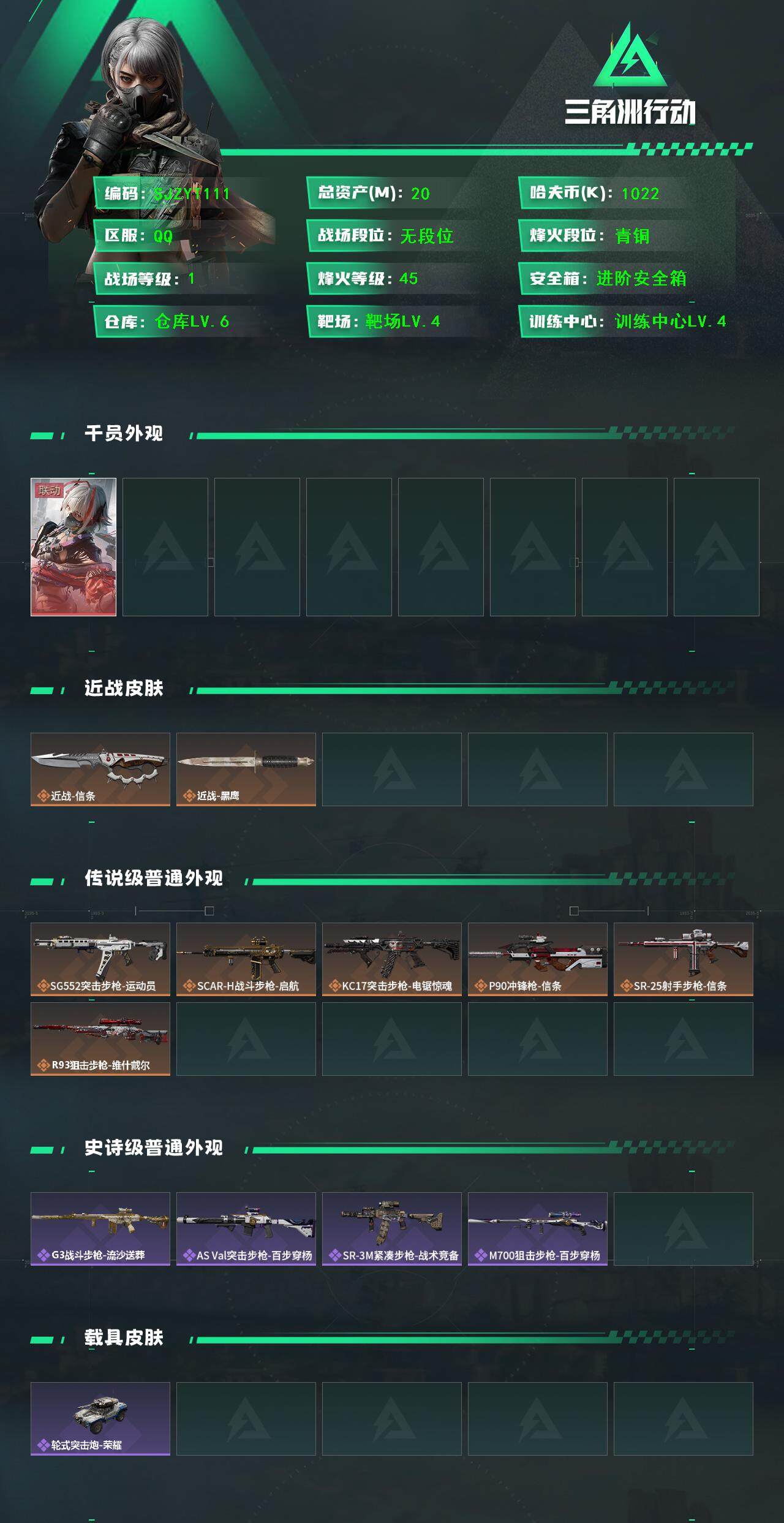 【SJZYT111】总资产(M):20M/哈夫币(K):1022K/哈夫币(K):1022K/全面战场等级:1_段位:无段位/烽火地带等级:45_段位:青铜/骇爪-维什戴尔/近战-信条/近战-黑鹰/SG552突击步枪-运动员/SCAR-H战斗步枪-启航/KC17突击步枪-电锯惊魂/P90冲锋枪-信条/SR-25射手步枪-信条/R93狙击步枪-维什戴尔/G3战斗步枪-流沙送葬/AS Val突击步枪-百步穿杨/SR-3M紧凑突击步枪-战术竞备/M700狙击步枪-百步穿杨/M4A1突击步枪-繁盛/AS