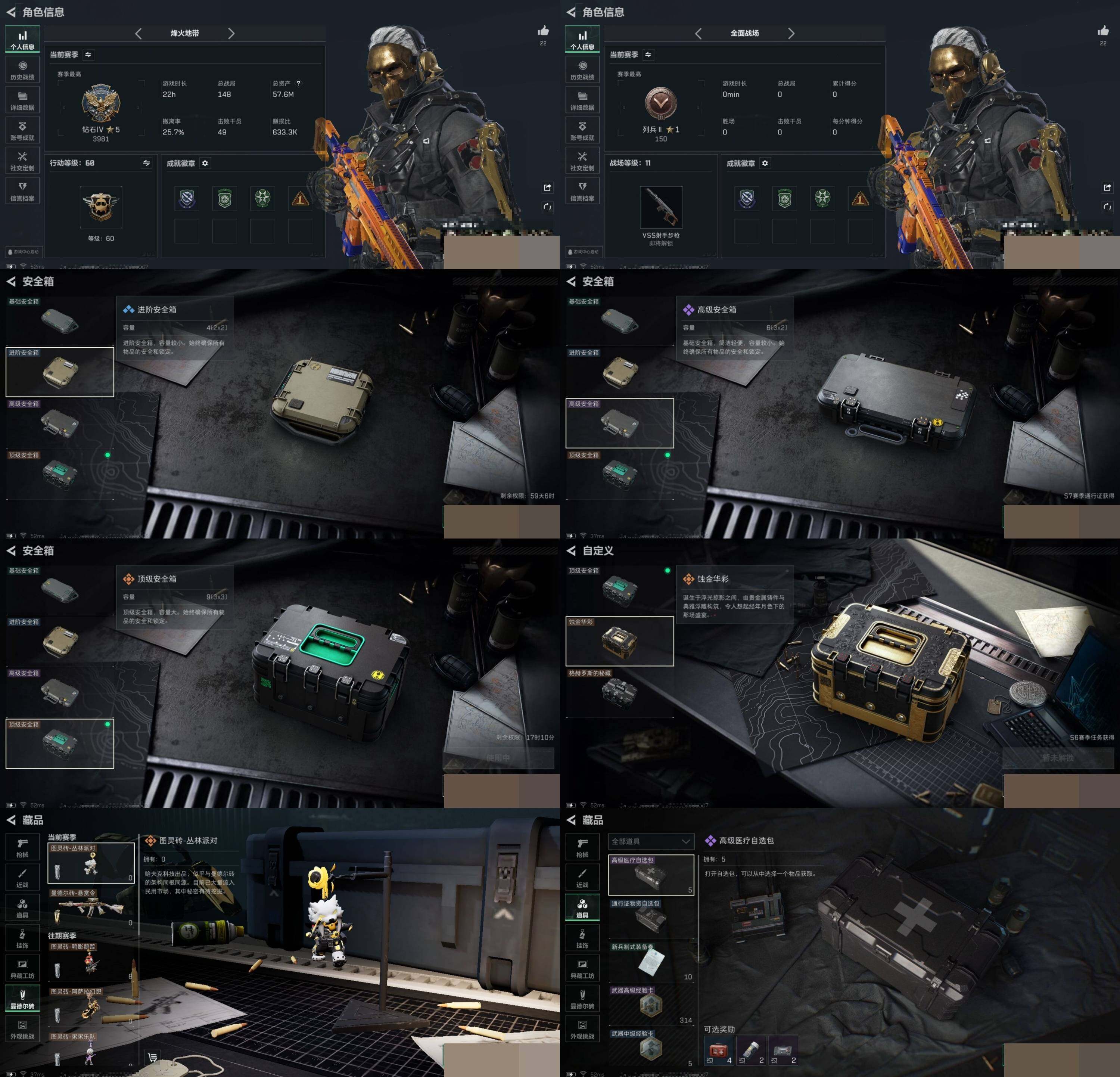 【sjs5521】57.8m总资产 蚀金玫瑰+天际线=北极星 烽火地带段位: 钻石 全面战场段位: 列兵 总资产: 57000000 哈夫币: 96000 sjs5521 传说武器皮肤: M4A1突击步枪-蚀金玫瑰,SCAR-H战斗步枪-水墨云图,AK-12突击步枪-夜鹰,近战-北极星,K437突击步枪-北极星,QCQ171冲锋枪-北极星,725双管霰弹枪-送葬人-无题密令,M4A1突击步枪-阿米娅,CAR-15突击步枪-阿米娅,复合弓-黑-天际线,Vector冲锋枪-狩猎时刻,G3战斗步枪-