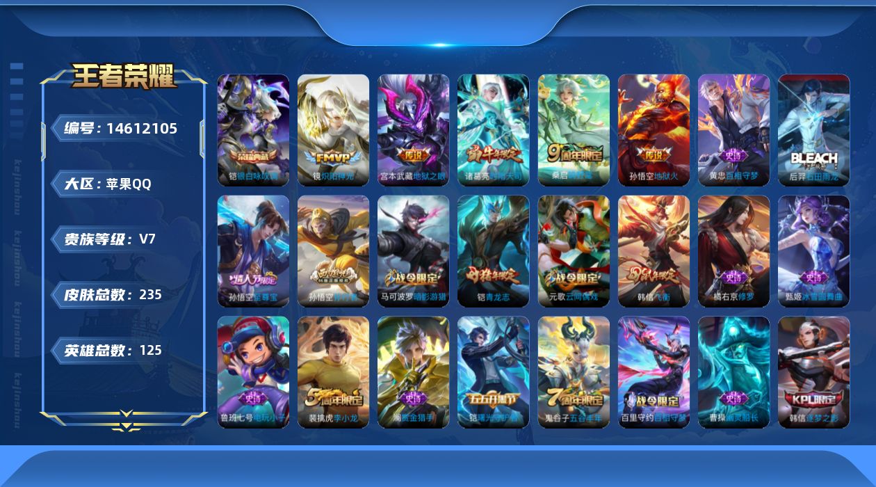【14612105】[14612105]实名: 可修改 贵族等级: V7 英雄数: 125 皮肤数: 235 荣耀水晶: 银白咏叹调 传说皮: 炽阳神光,地狱火,地狱之眼,神树通天 限定皮: 李小龙,梁祝,时雨天司,飞衡,逐梦之影,青龙志,至尊宝,孙行者,五谷丰年,鸣野蒿,逐霄战戟 亮点: 【精品号手慢无】1典藏银白咏叹调,热门炽阳神光,至尊宝,时雨天司,飞衡,逐梦