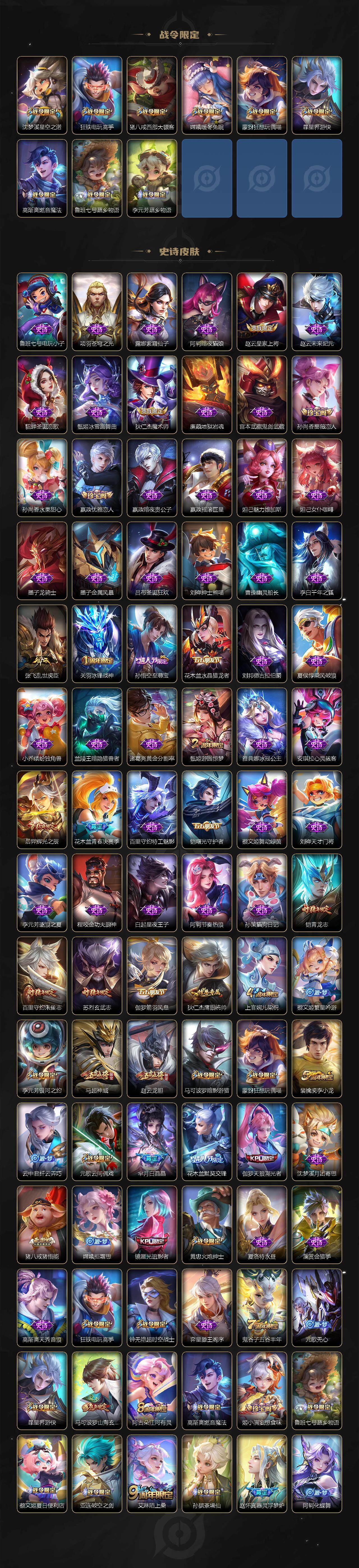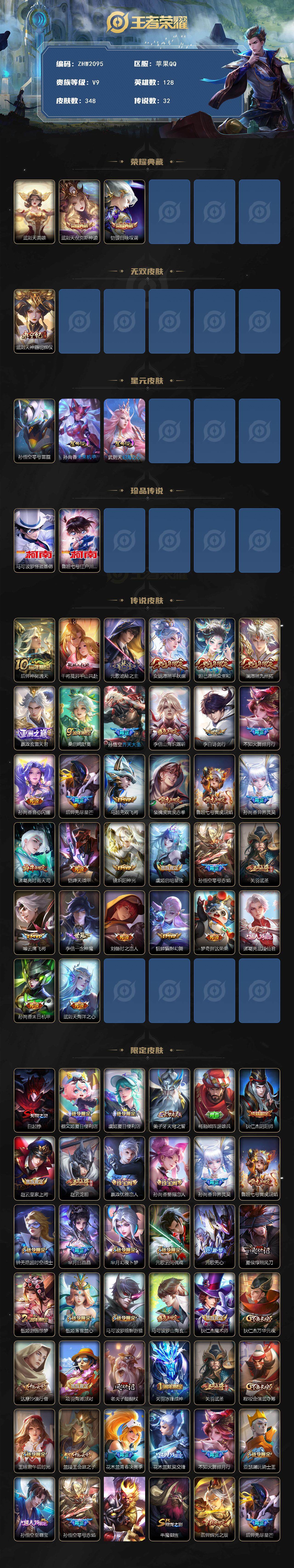 苹果Q-V9-最强王者段位-128英雄-348皮肤-2典藏皮肤-1典藏英雄-1无双-2珍品传说-32传说-96史诗