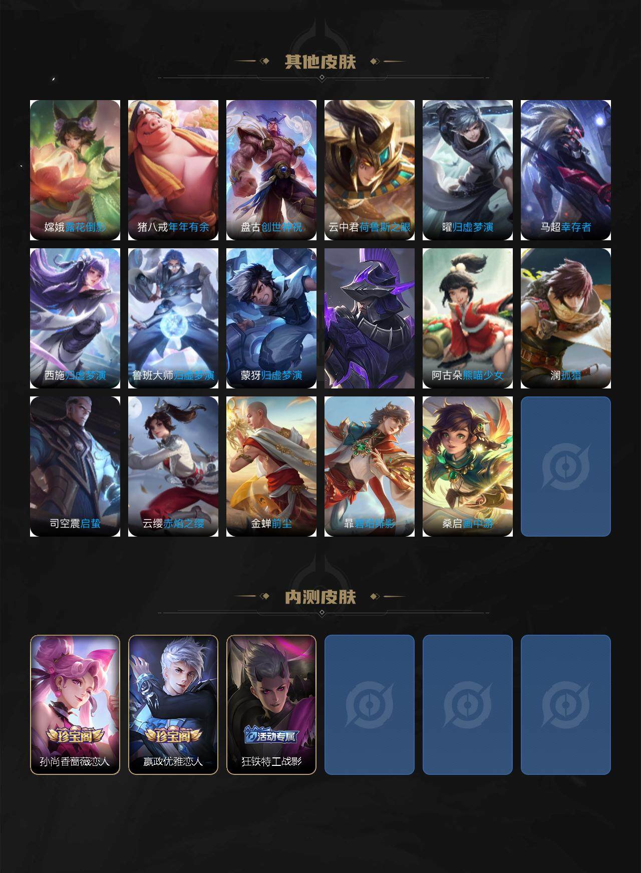 【传说皮肤】:后羿神树通天,干将莫邪千山共赴,元歌诡秘之主,女娲愿照千秋盛,妲己愿照众生和,澜愿照九州拓,嬴政玄雷天君,桑启鸣野蒿,孙悟空齐天大