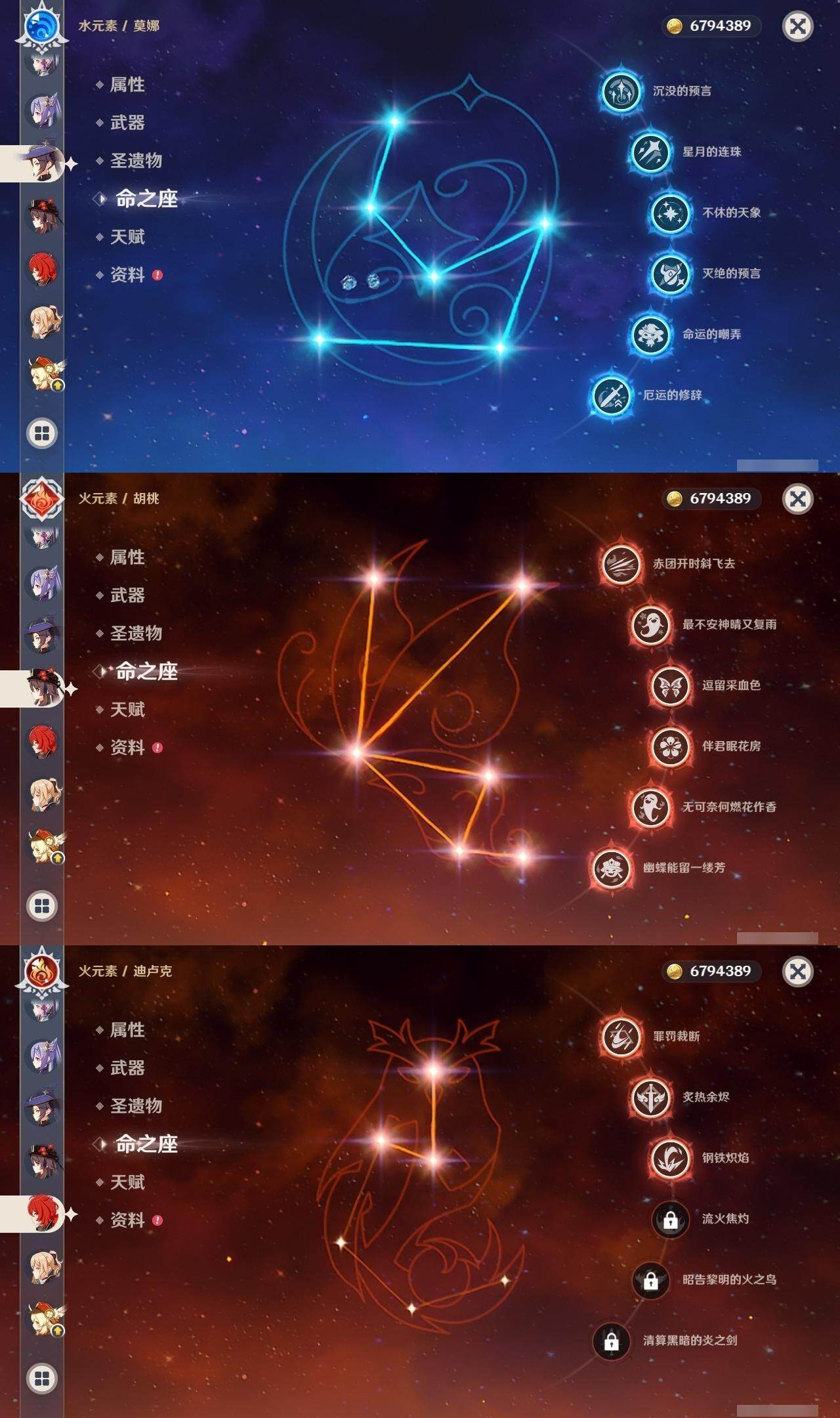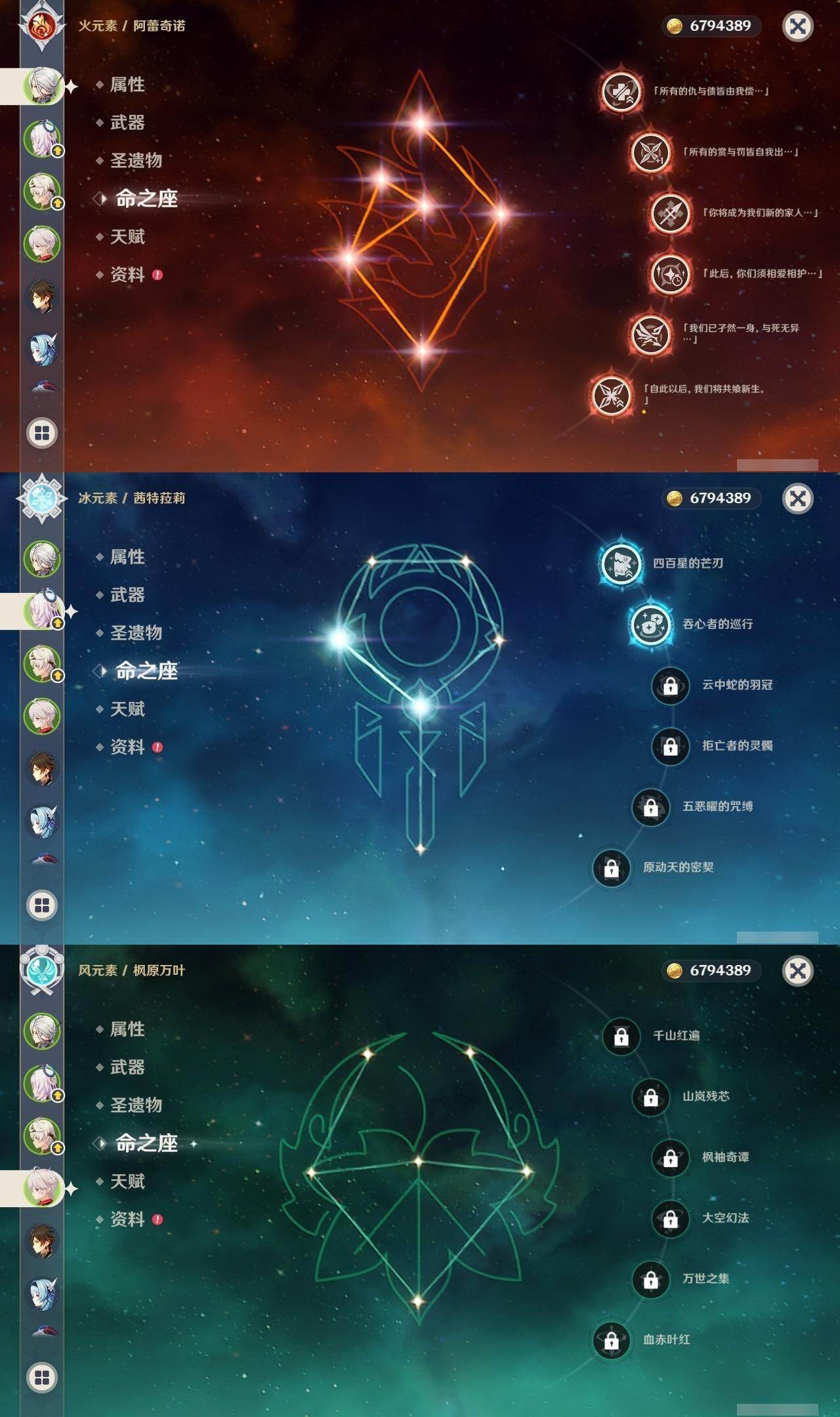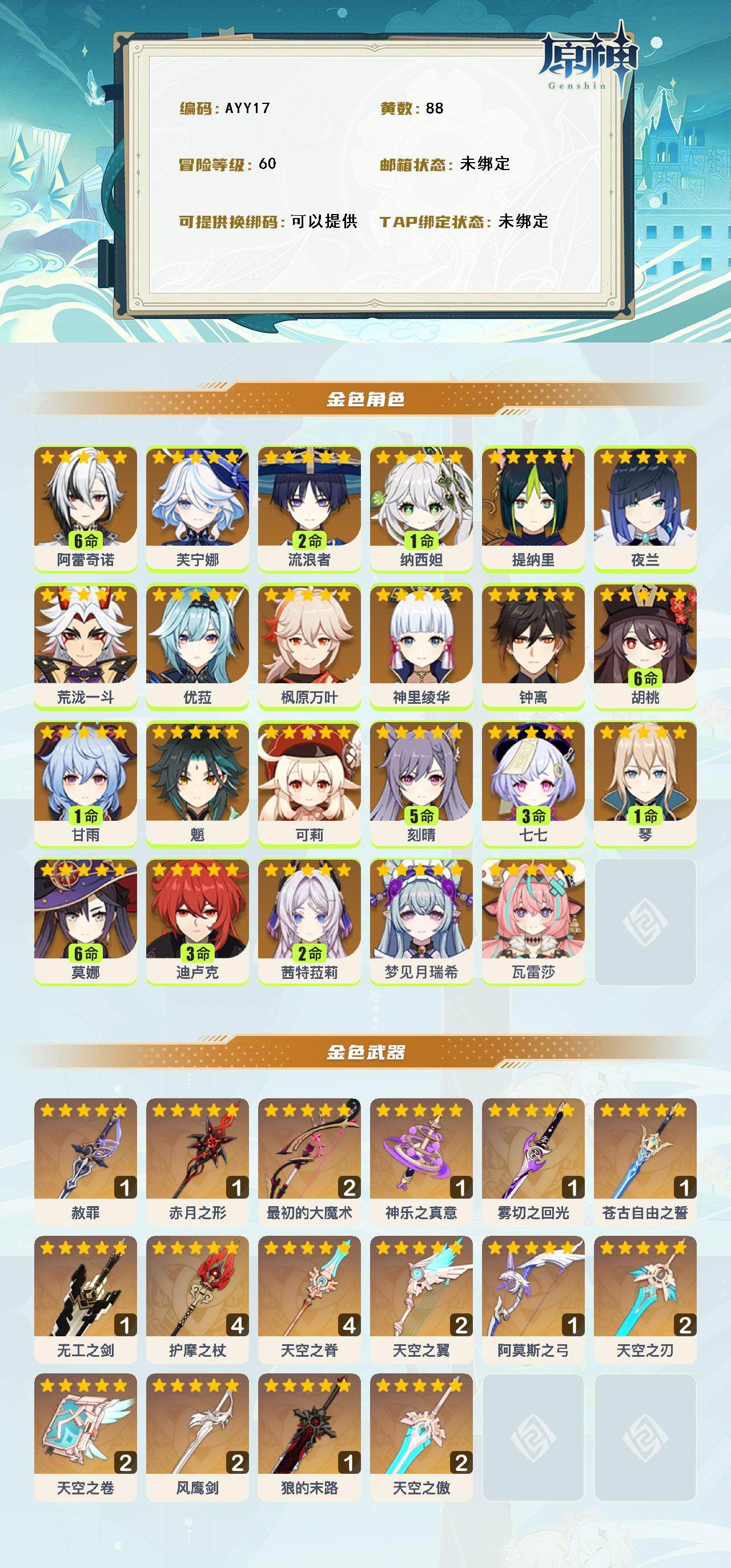 满命阿蕾奇诺,满命莫娜,0命芙宁娜,2命流浪者,1命纳西妲,0命提纳里,0命夜兰,0命荒泷一斗,0命优菈,0命枫原万叶,0命神里绫华,0命钟离,满命胡桃,1命甘雨,0命魈,0命可莉,5命刻晴,3命七七,1命琴,3命迪卢克,2命茜特菈莉,0命梦见月瑞希,0命瓦雷莎,精1赦罪,精1赤月之形,精2最初的大魔术,精1神乐之真意,精1雾切之回光,精1苍古自由之誓,精1无工之剑,精4护摩之杖,精4天空之脊,精2天空之翼,精1阿莫斯之弓,精2