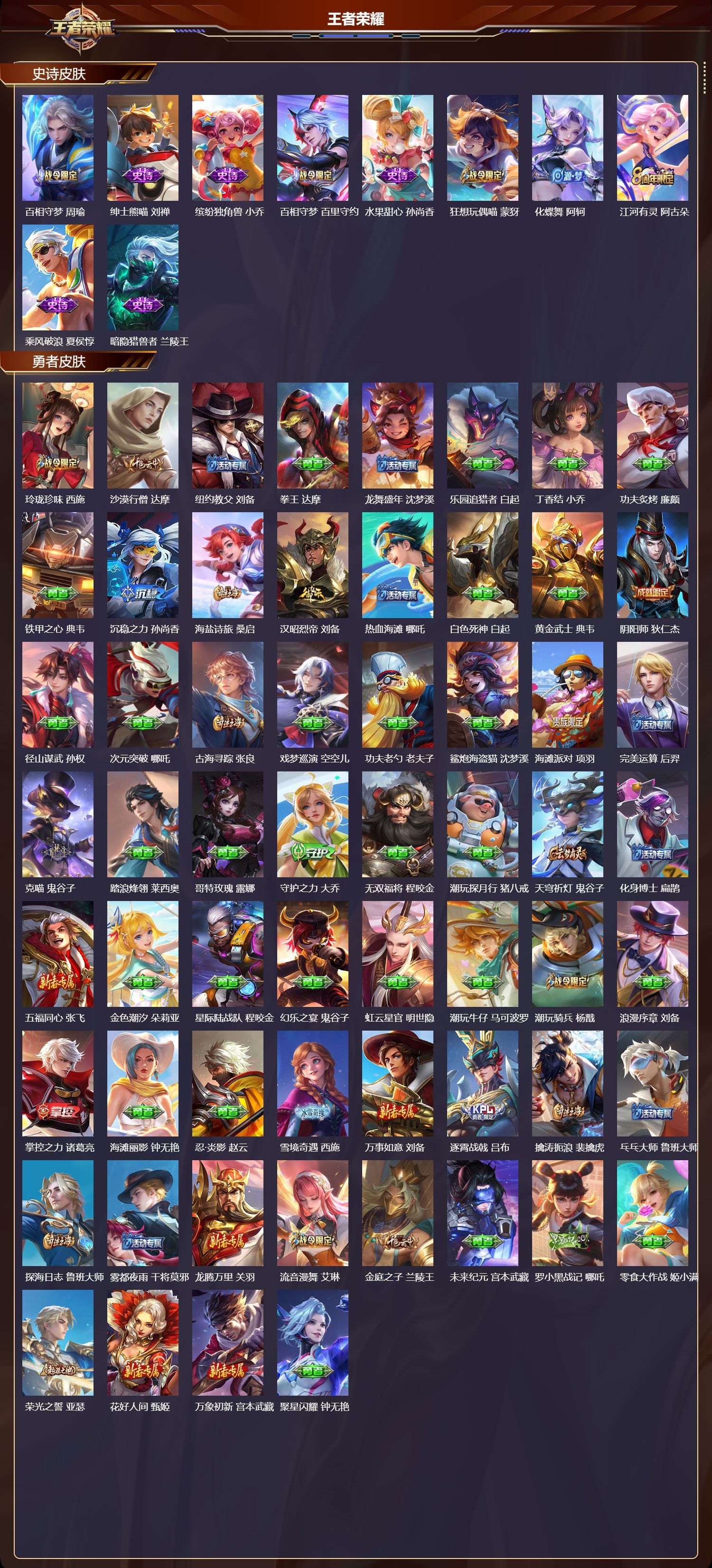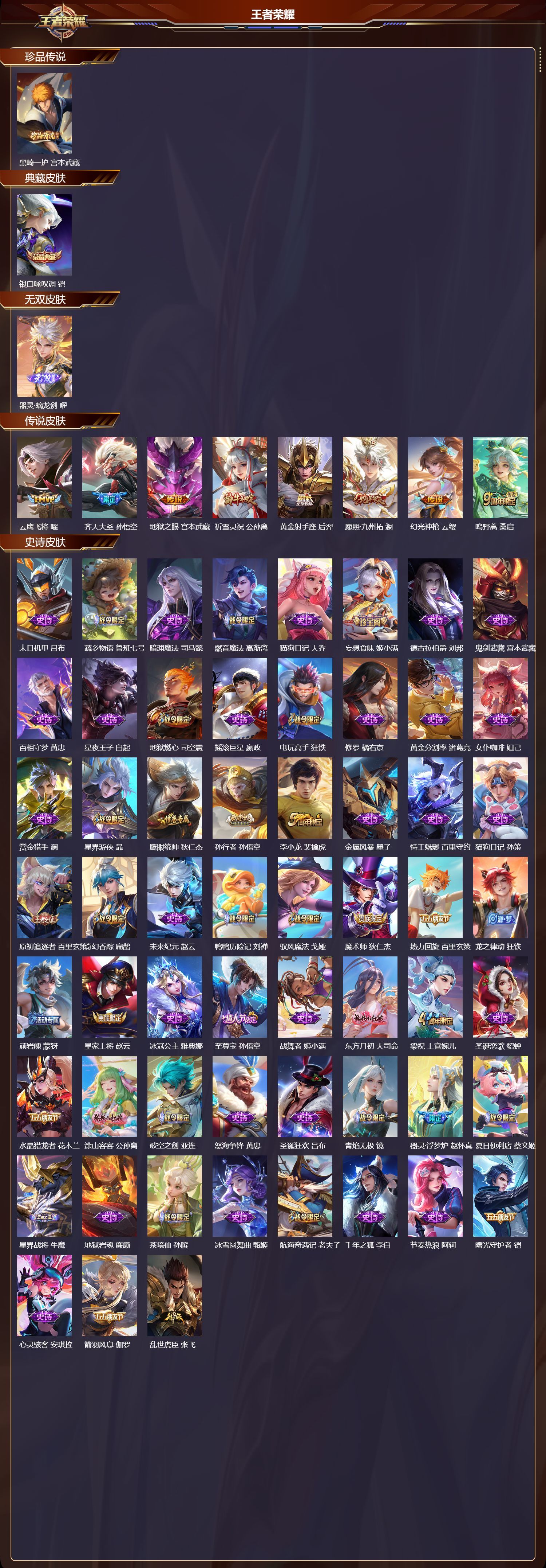 安卓QQ/绝世王者/225皮肤/126英雄/1典藏/0珍品无双/1无双/1珍品传说/8传说/69史诗