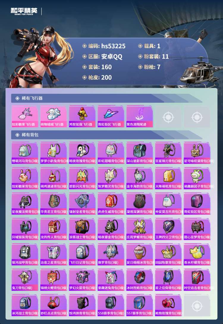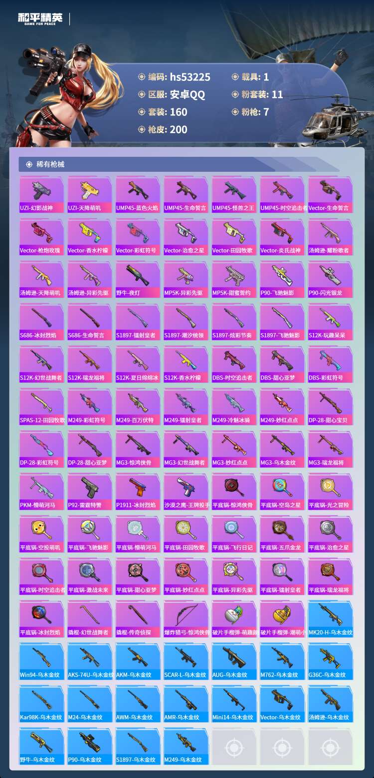 hs53225 安卓手Q-3王牌印记-11粉装-7特效枪-1载具-69913热力值-160套装-20