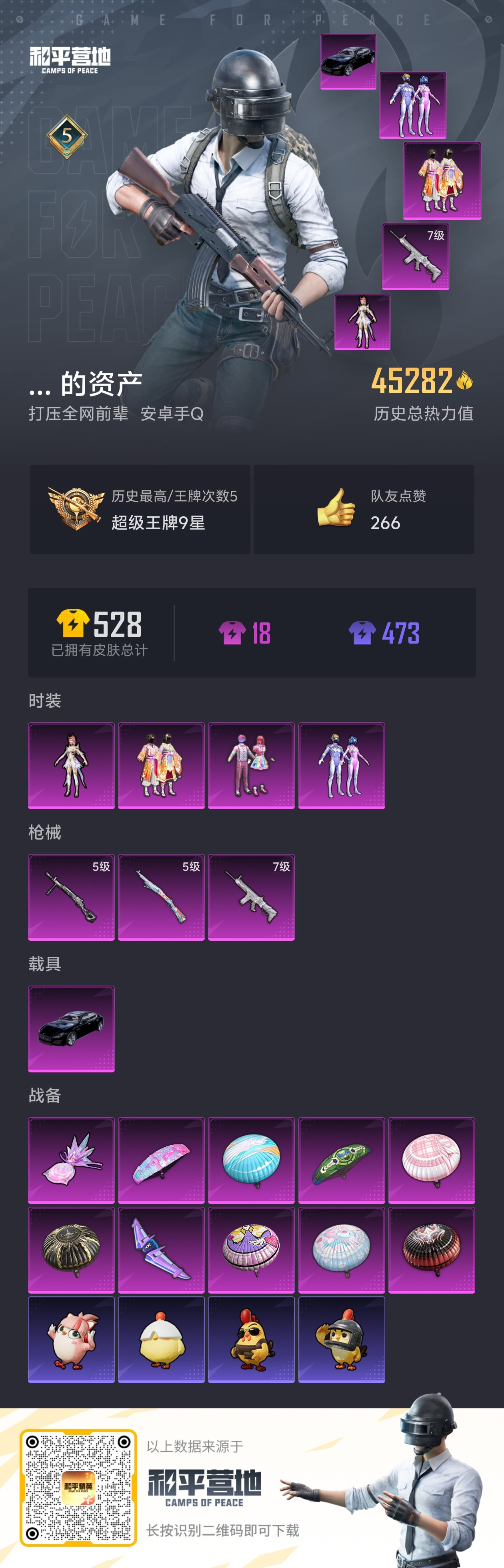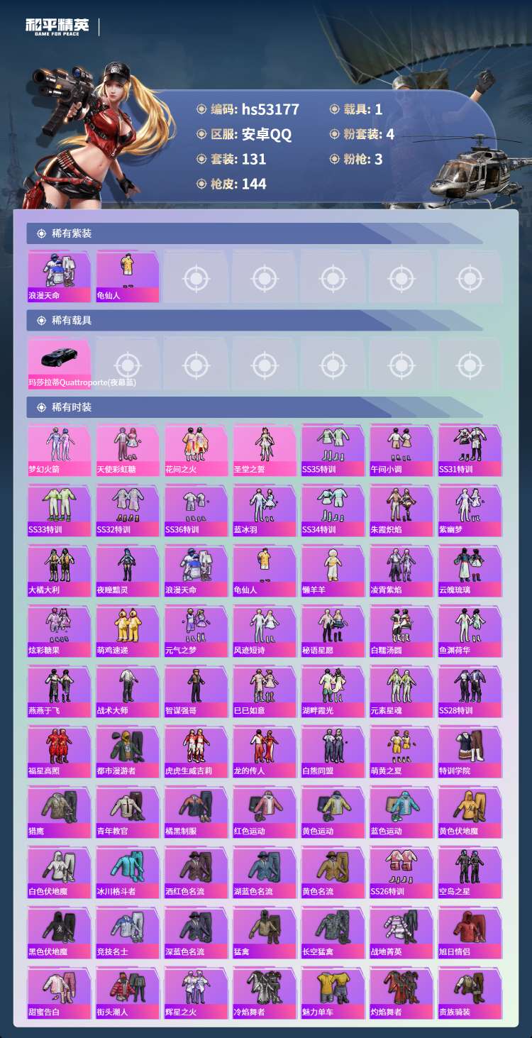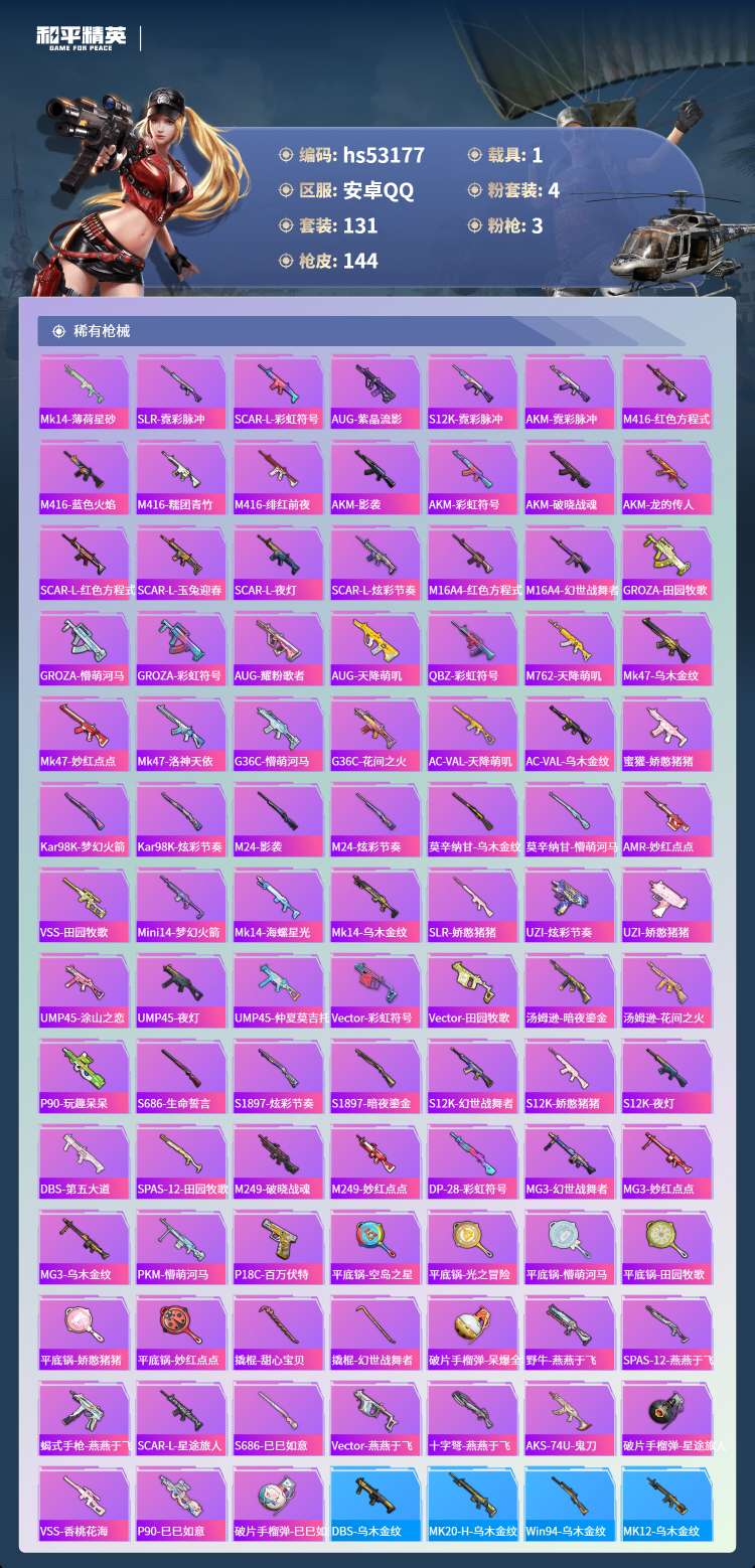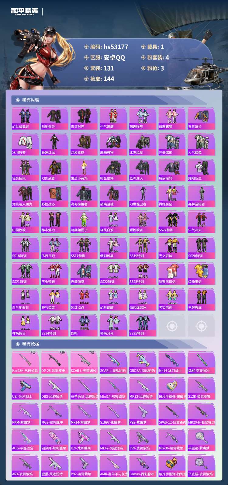 hs53177 安卓手Q-5王牌印记-4粉装-3特效枪-1载具-45352热力值-131套装-144
