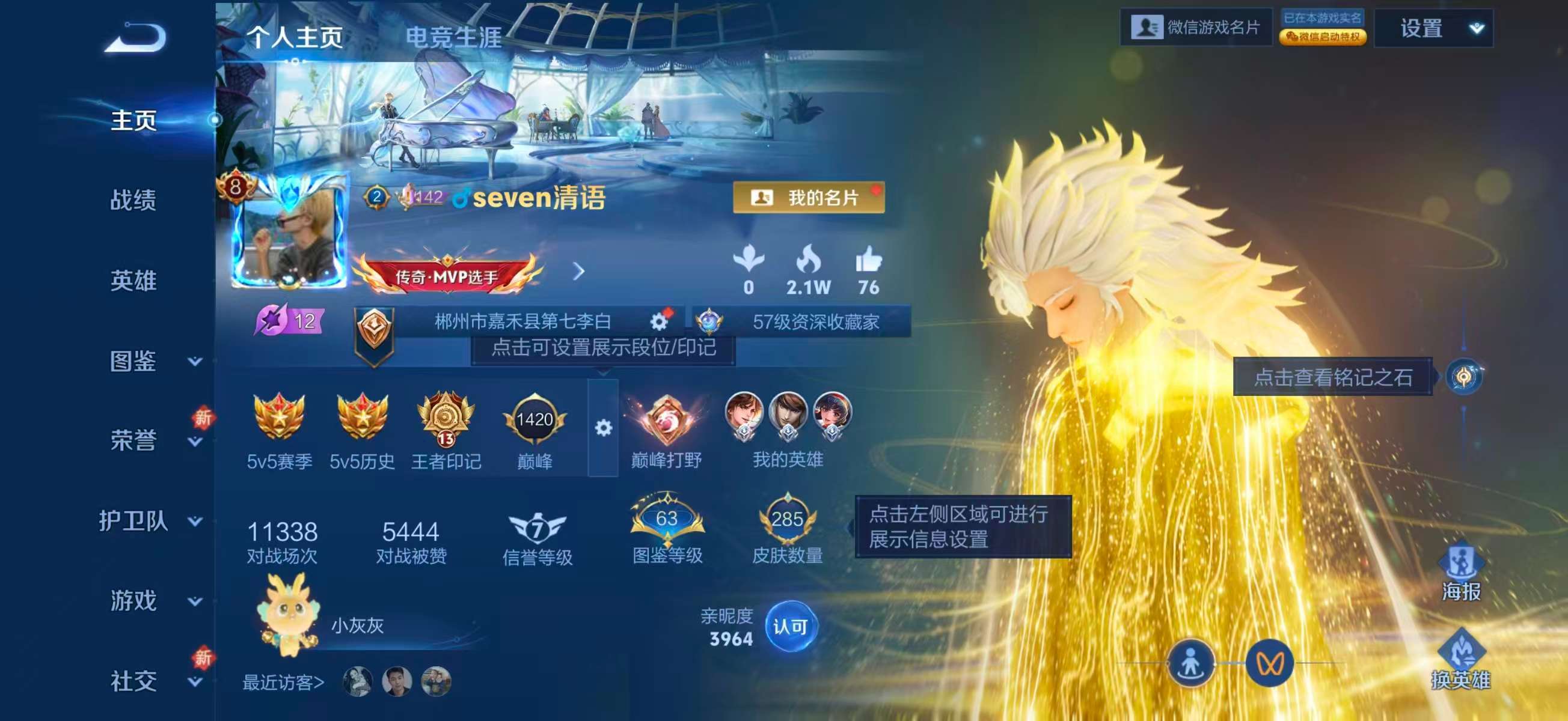 安卓微/传奇王者/285皮肤/127英雄/2典藏/0珍品无双/1无双/0珍品传说/15传说/81史