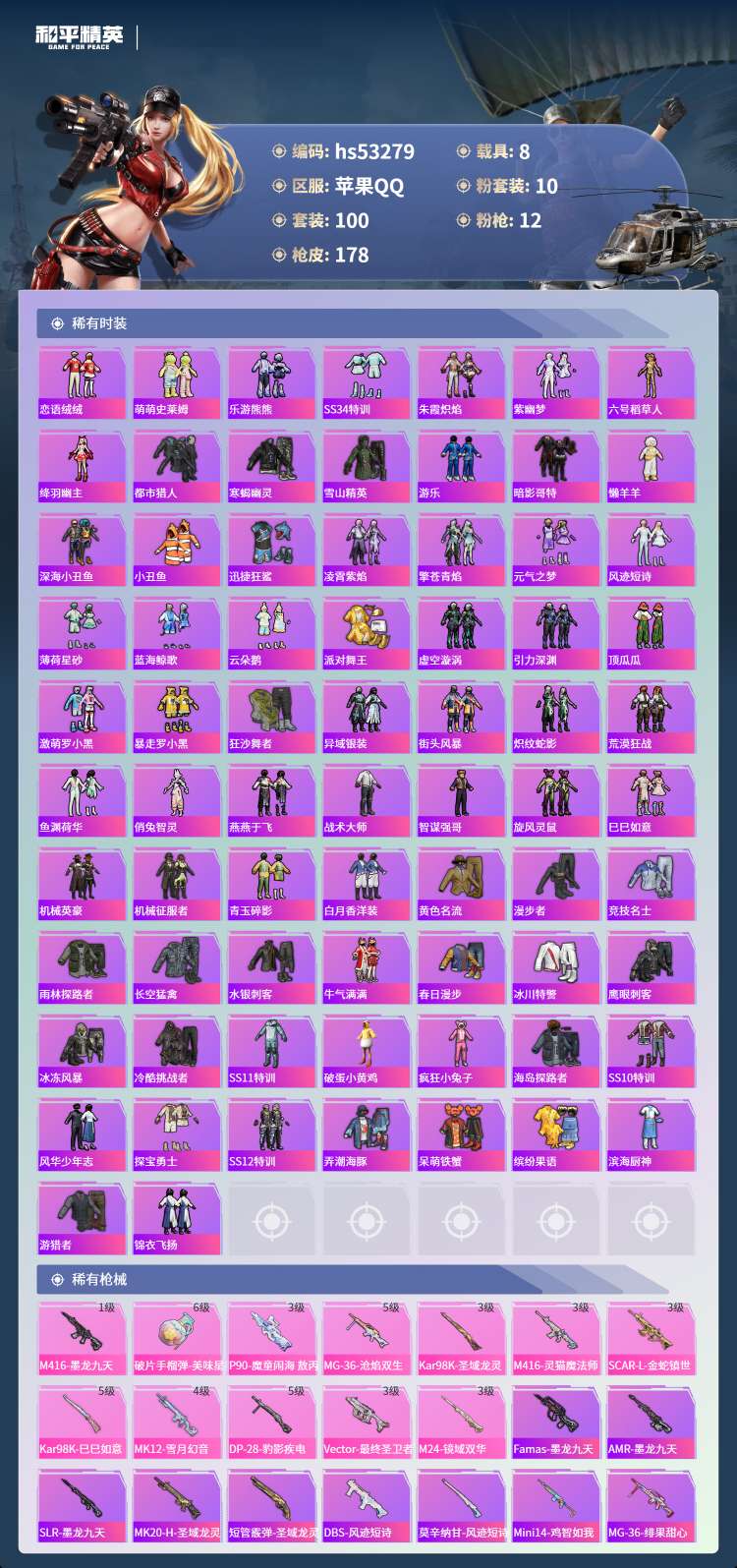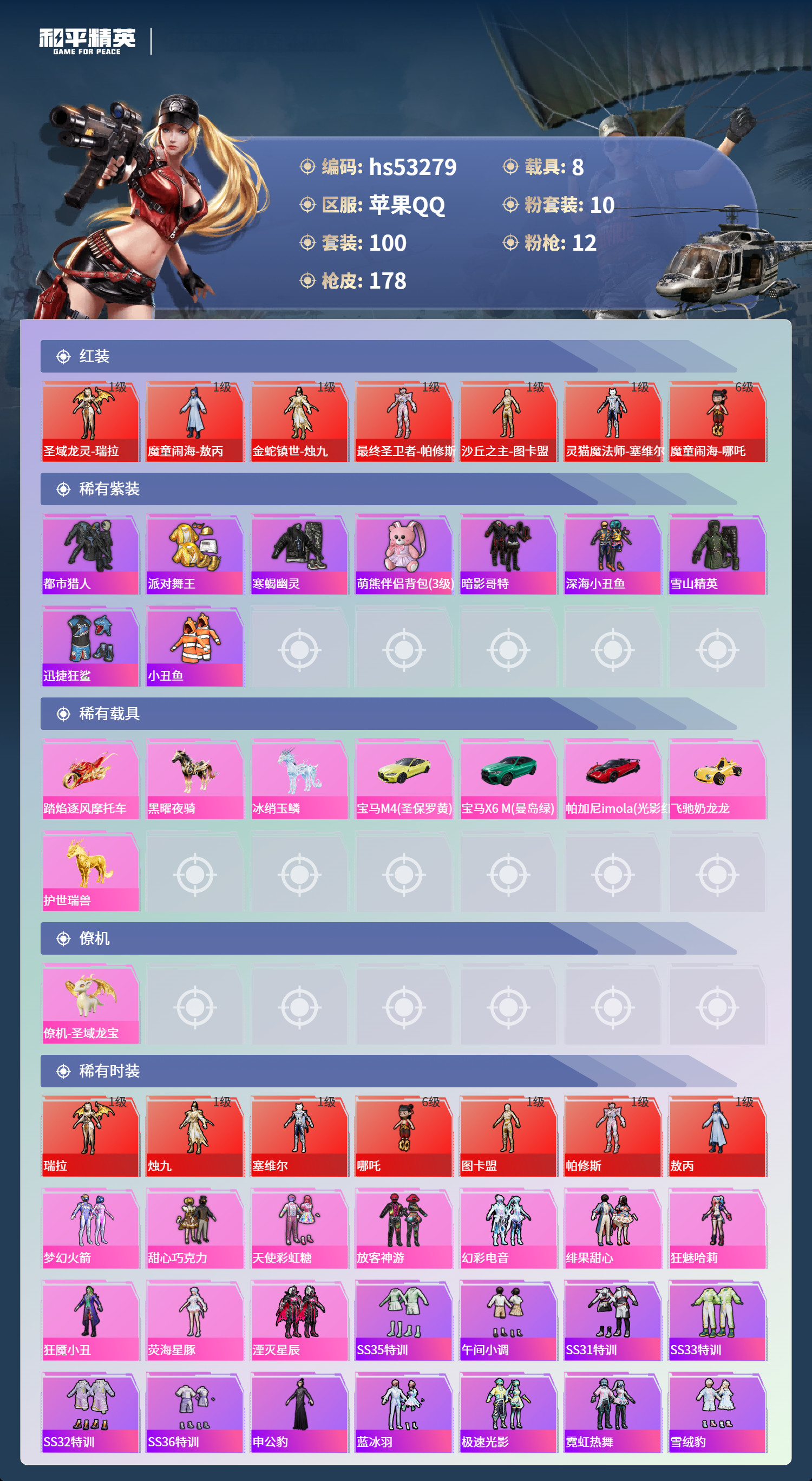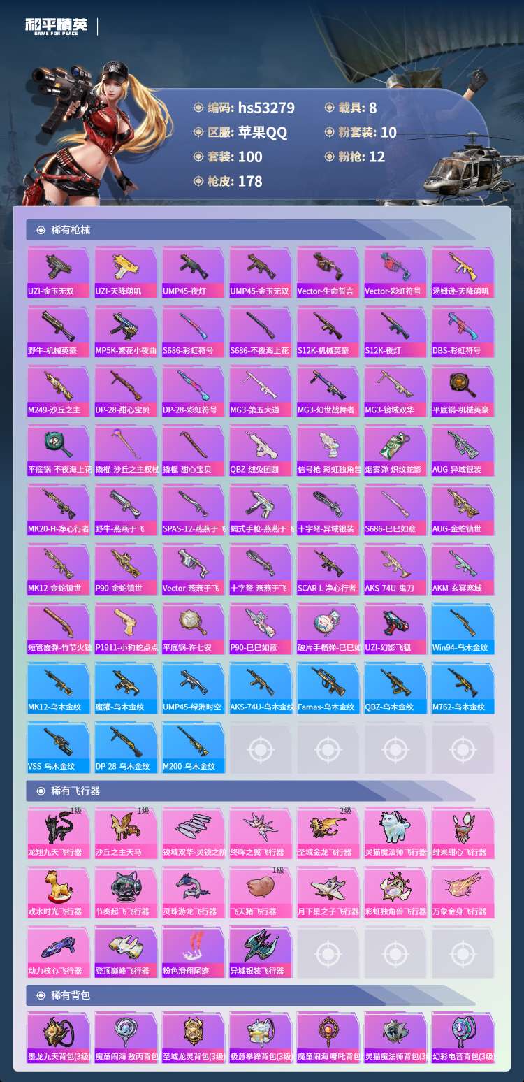hs53279 苹果手Q-6王牌印记-7红装-10粉装-12特效枪-8载具-86982热力值-100
