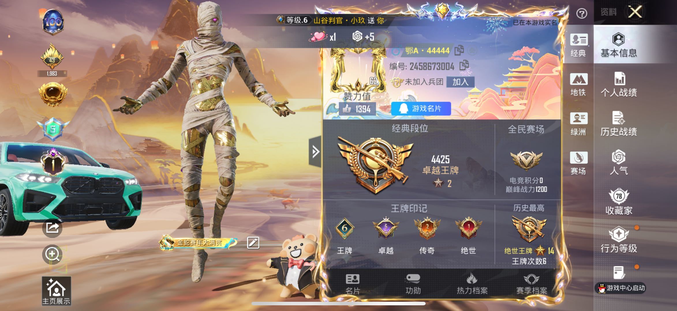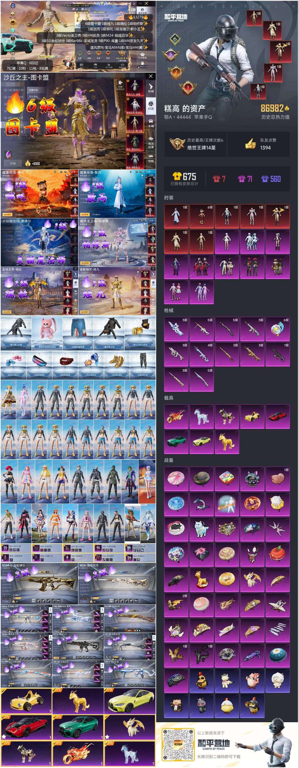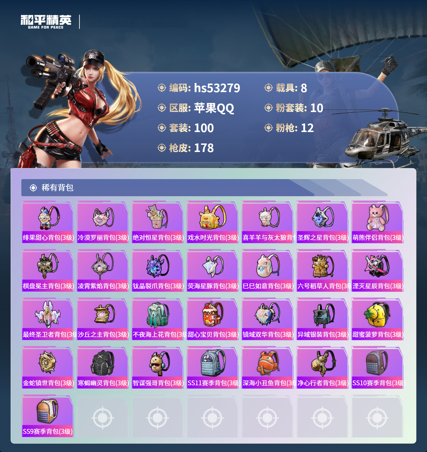 hs53279 苹果手Q-6王牌印记-7红装-10粉装-12特效枪-8载具-86982热力值-100