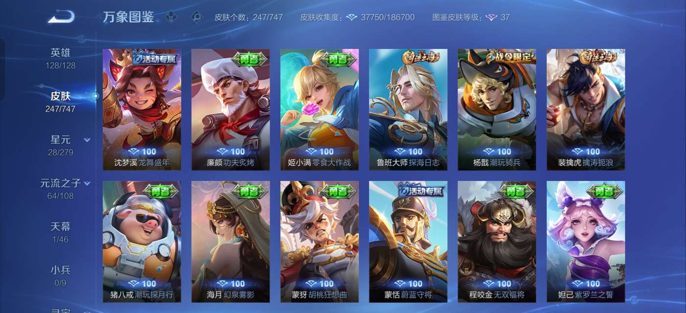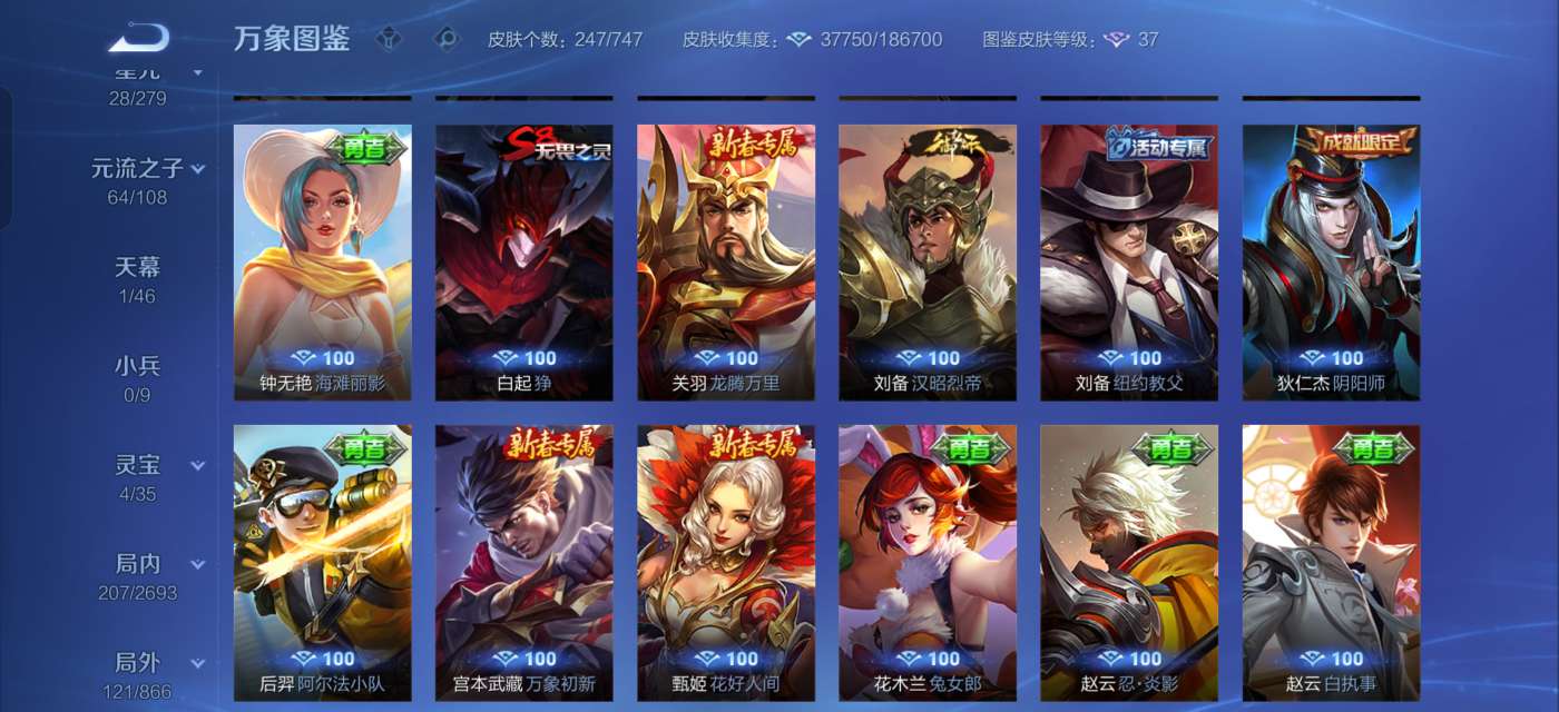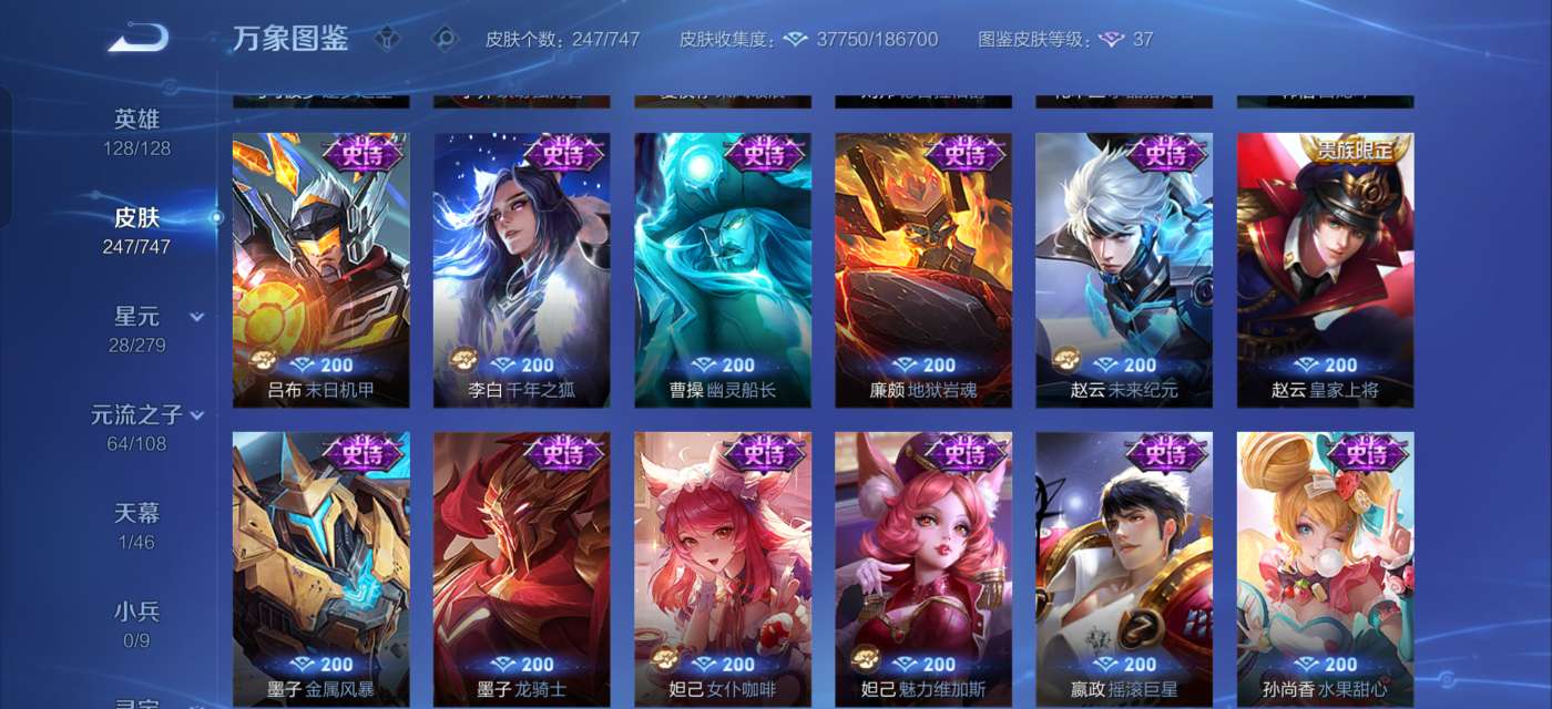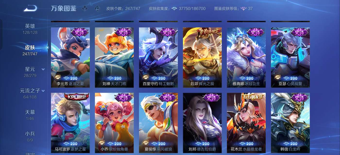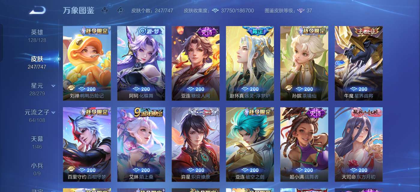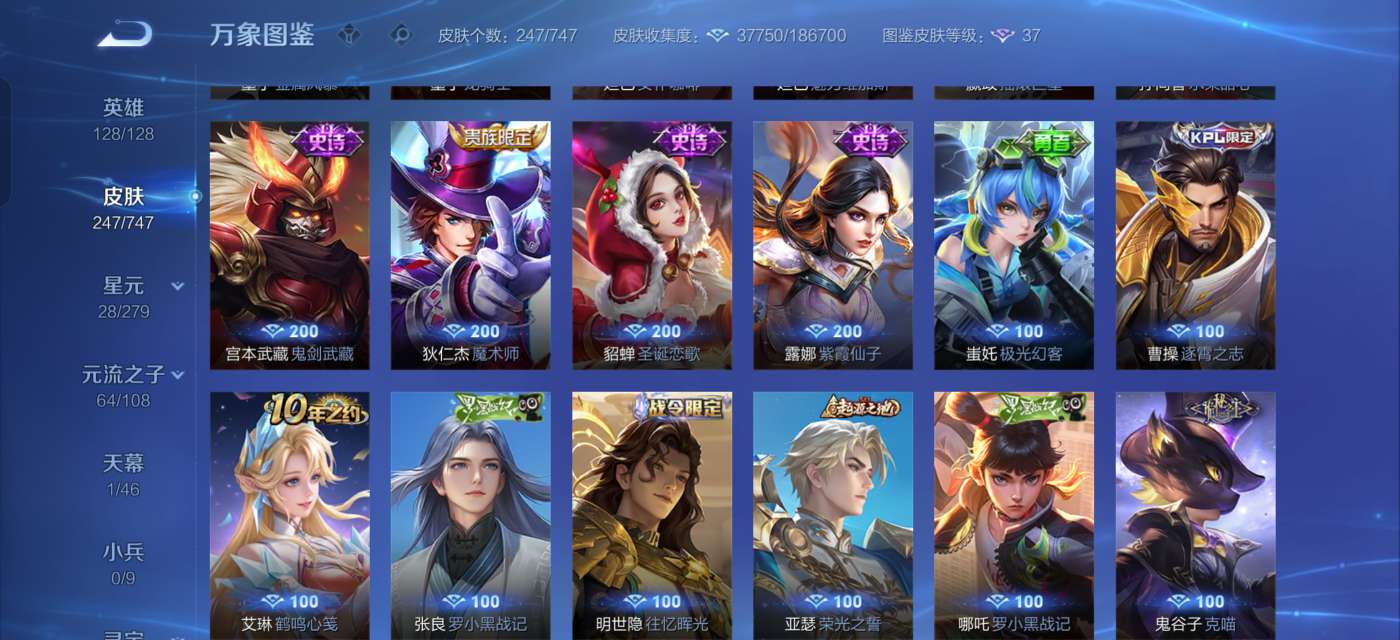 全英雄,244个皮肤,3荣耀典藏,2珍品,12传说,73史诗。连着三角洲金铲铲,