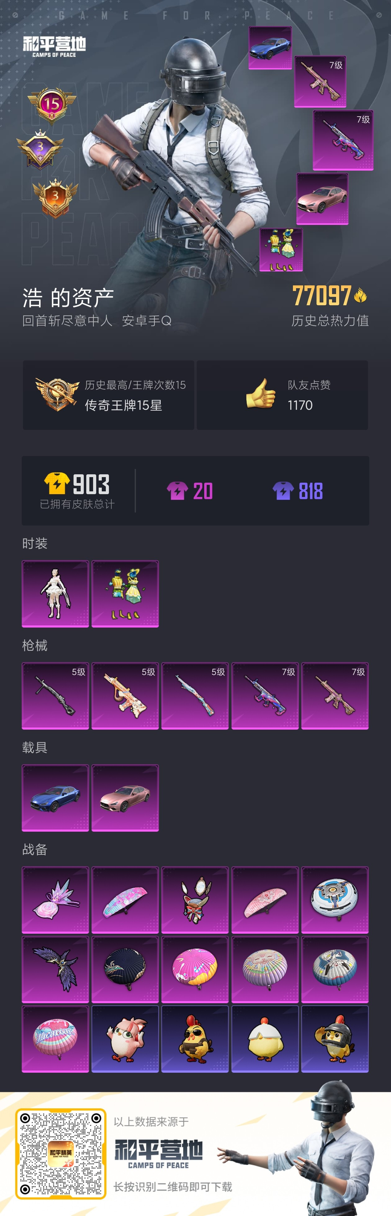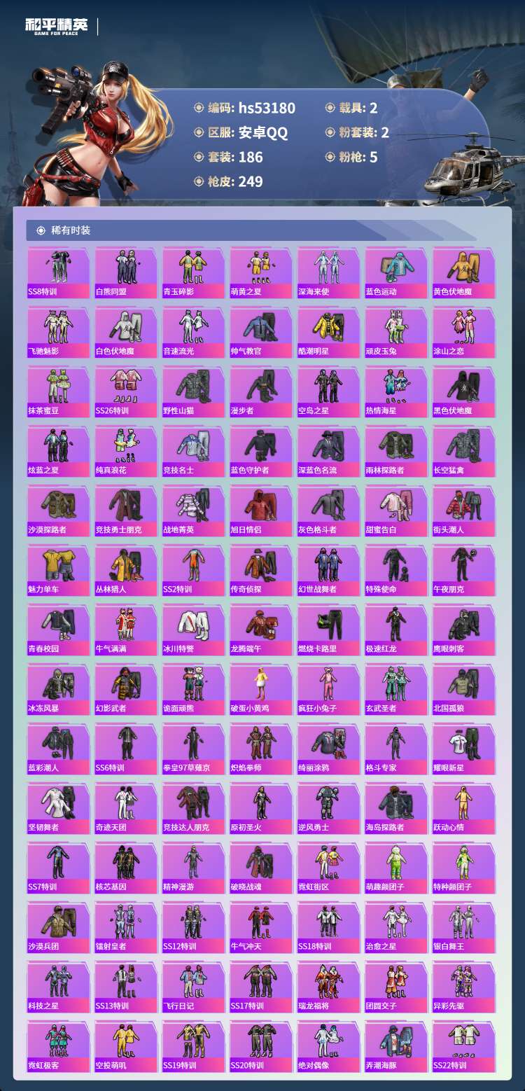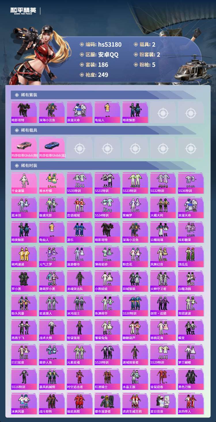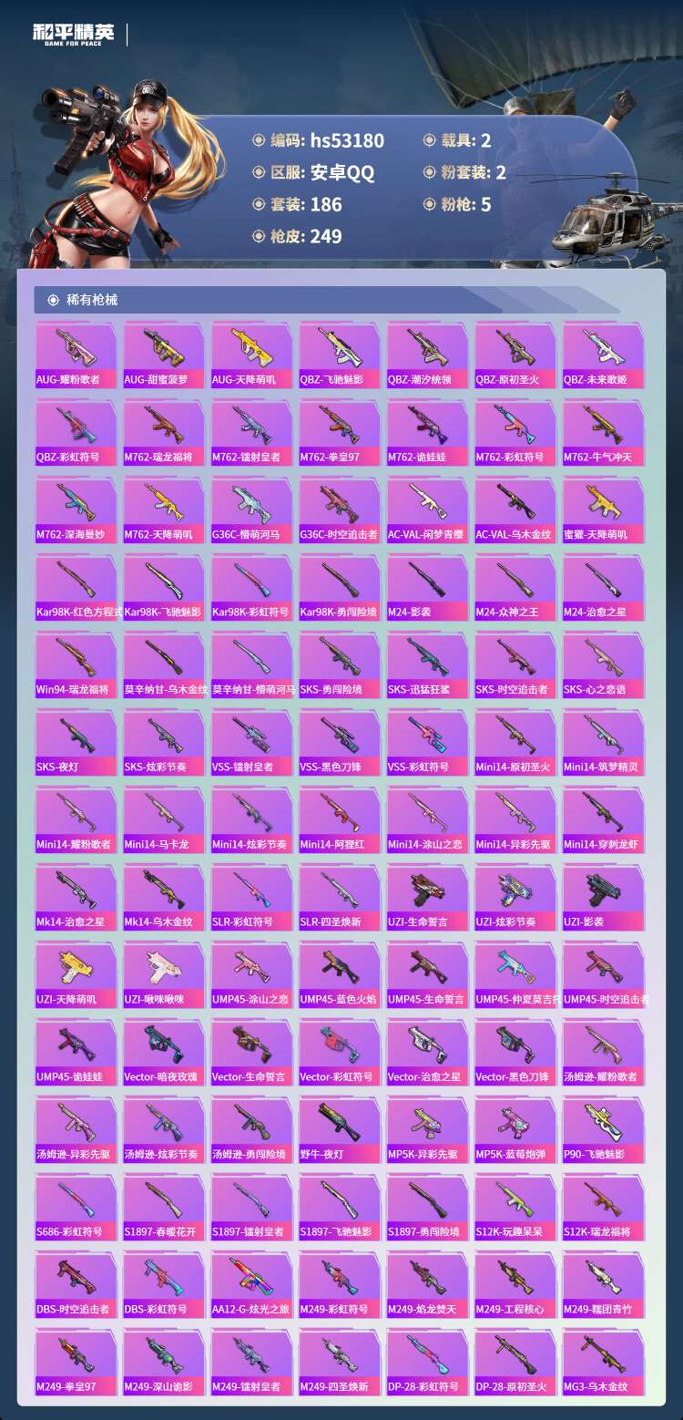 hs53180 安卓手Q-15王牌印记-2粉装-5特效枪-2载具-77097热力值-186套装-24