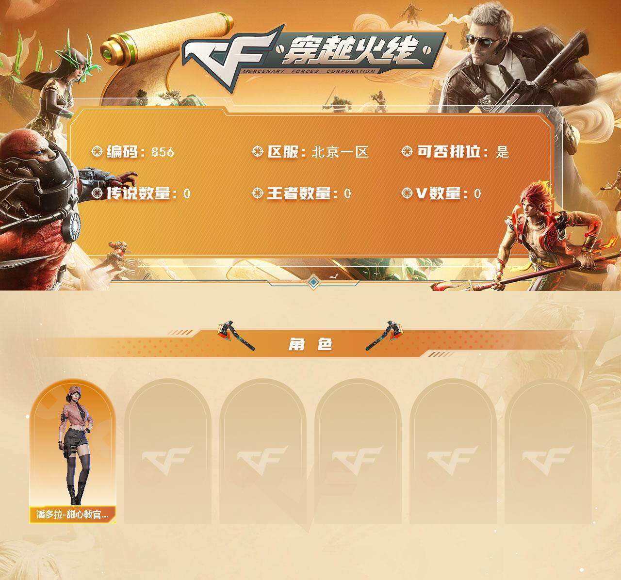 北京一区-0V-0王者-0炫金【角色】:潘多拉-甜心教官【道具】:绿色巨人