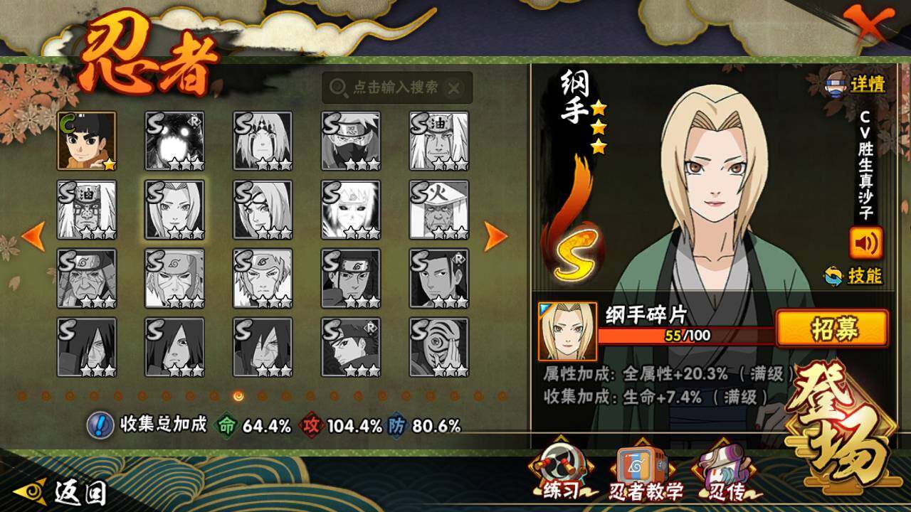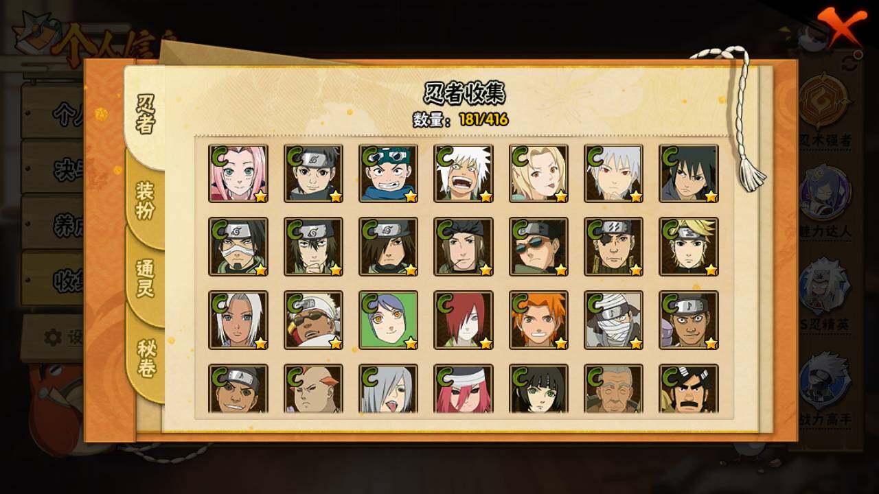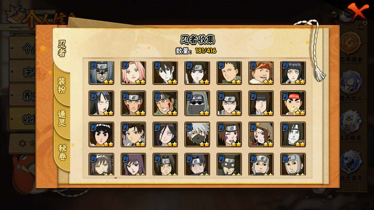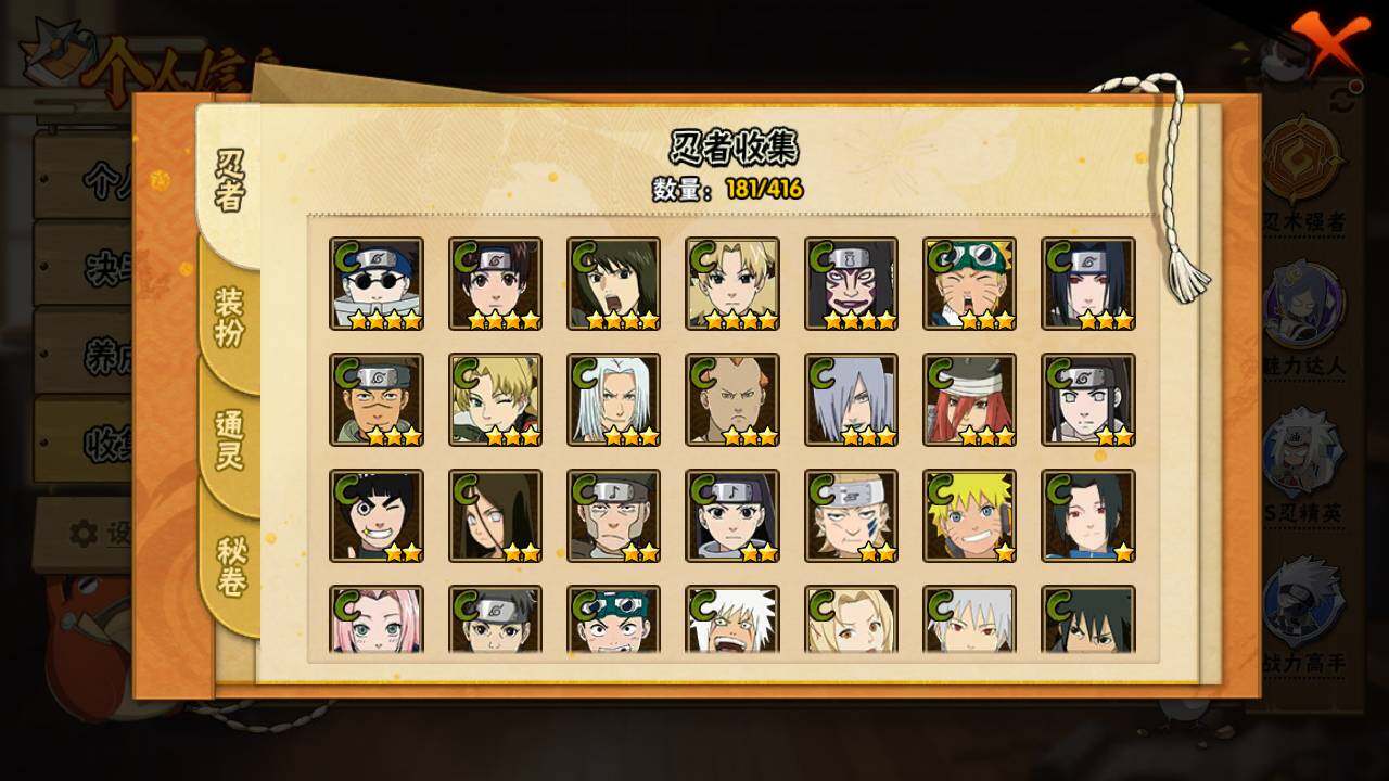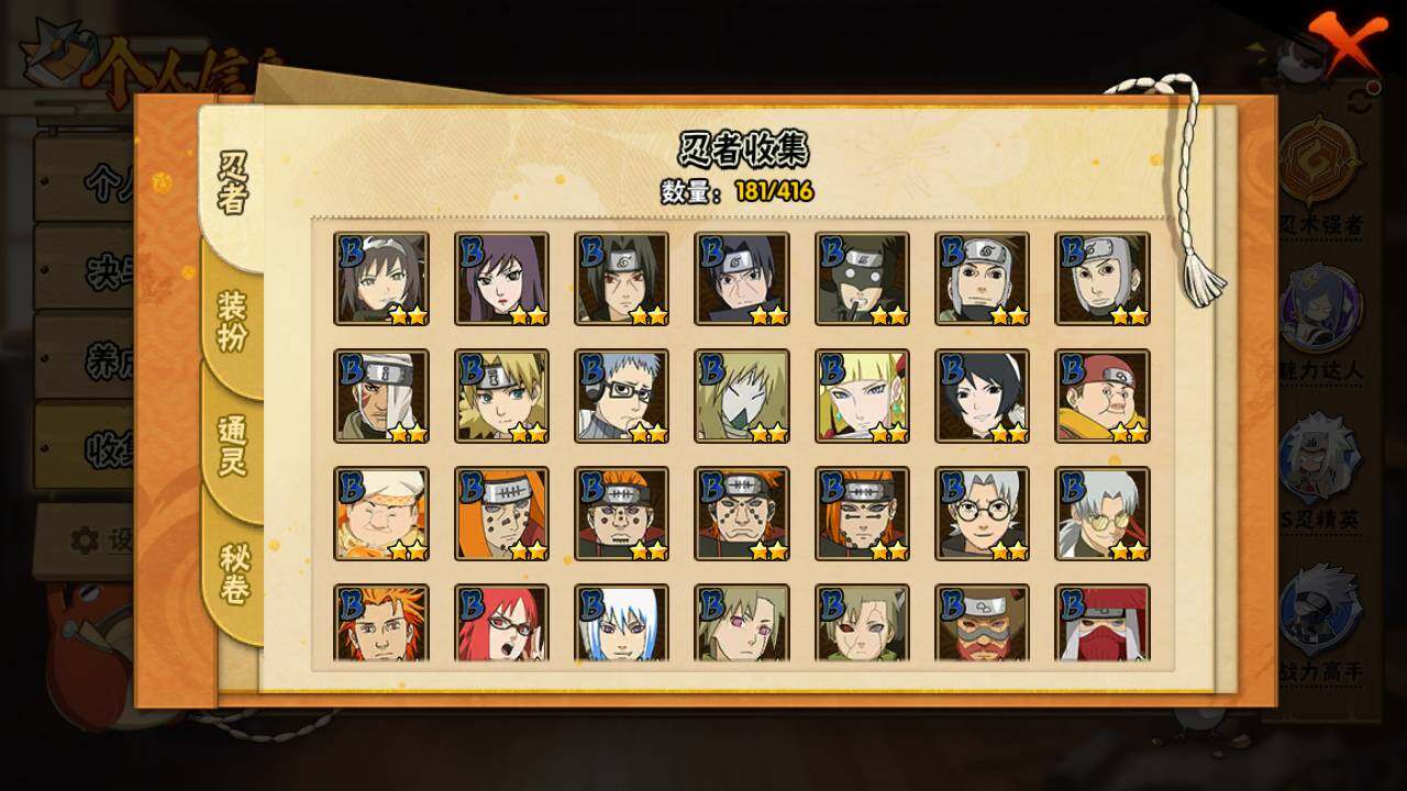 【S级忍者】:波风水门「秽土转生」(3星),千手柱间「秽土转生」(3星),宇智波鼬「秽土转生」(3星),宇智波带土「忍界大战」(3星),宇智波鼬「须佐能乎」(3星),宇智波斑「木叶创立」(3星),自来也「舞之豪杰」(3星),大蛇丸(3星),自来也「传说中的三忍」(3星),波风水门(3星),漩涡鸣人「九喇嘛连结」(3