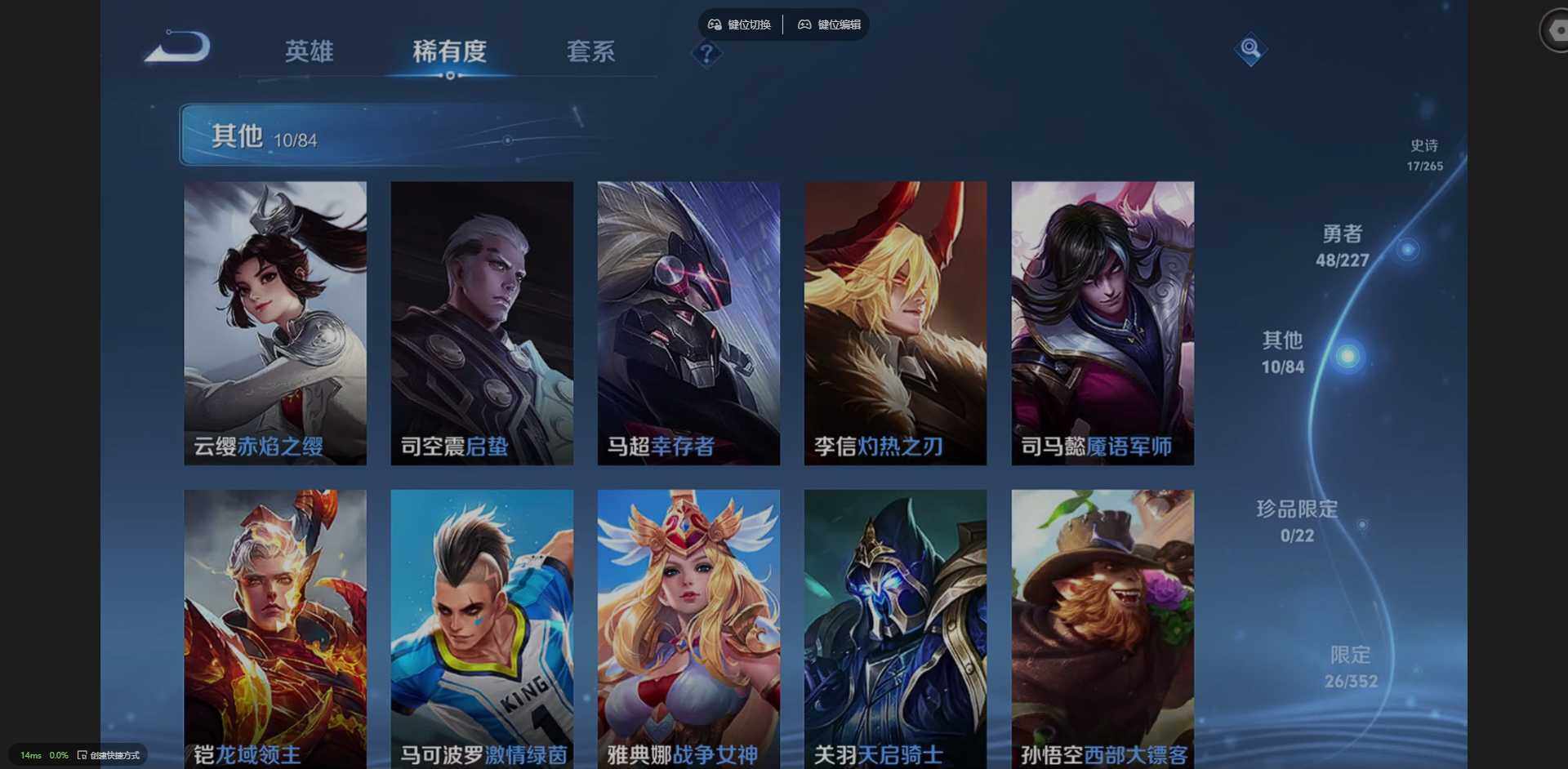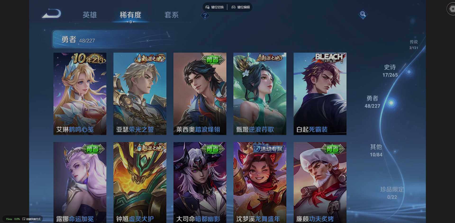 贵族等级: V4 英雄数: 113 皮肤数: 77 星传说: 幽冥火 限定皮: