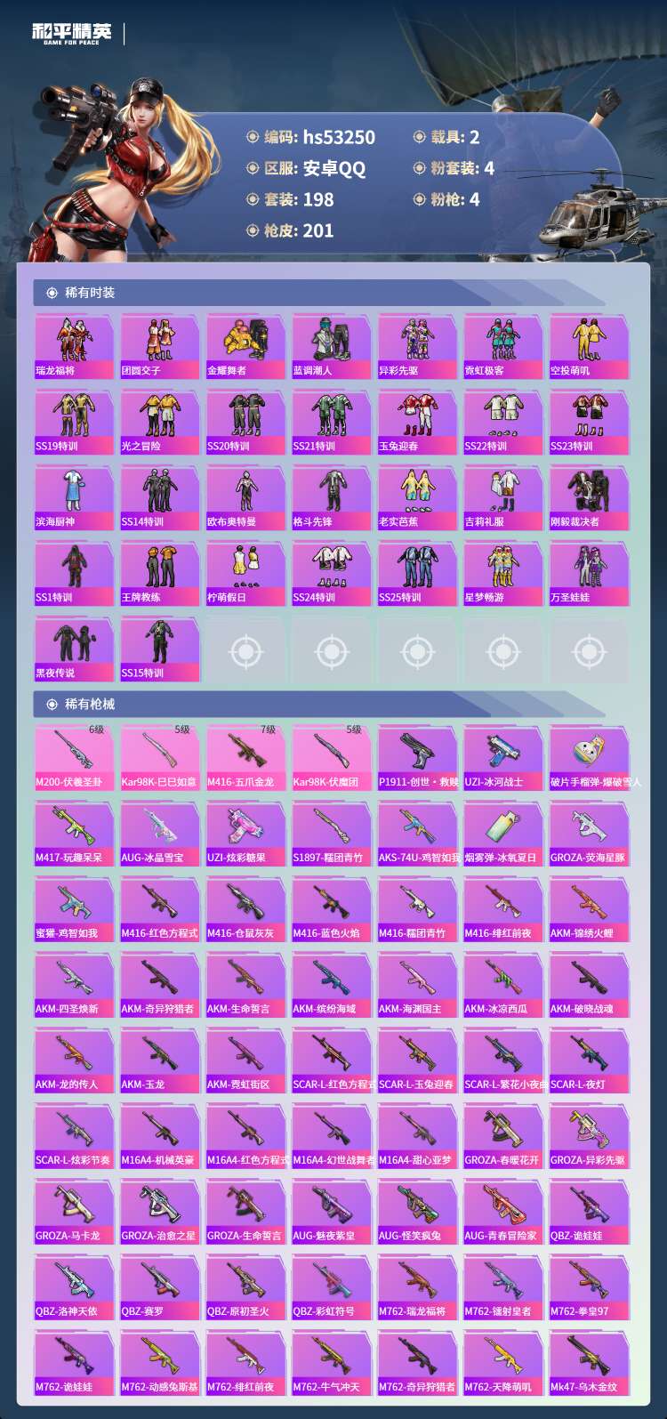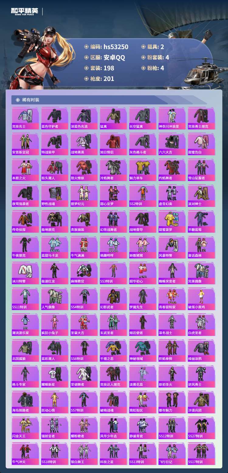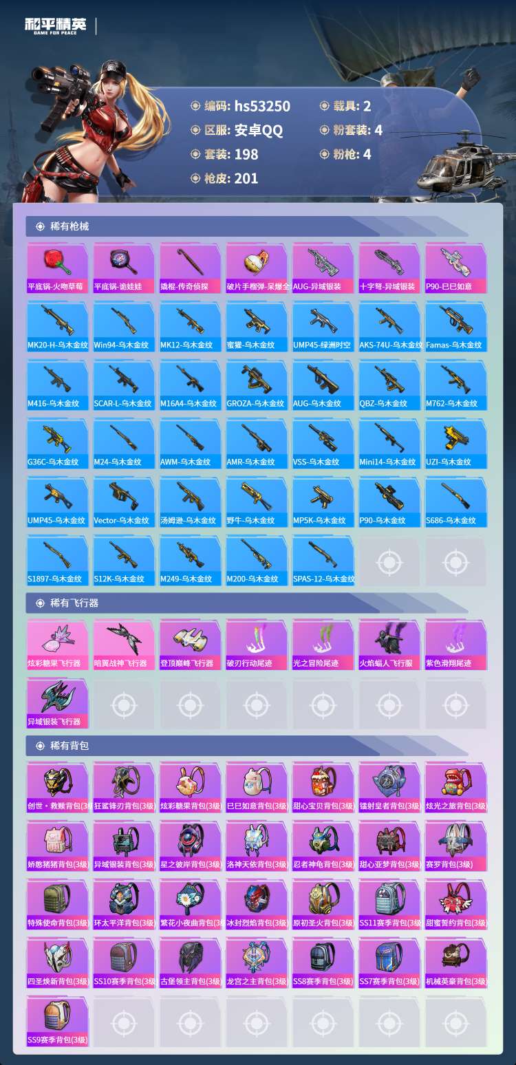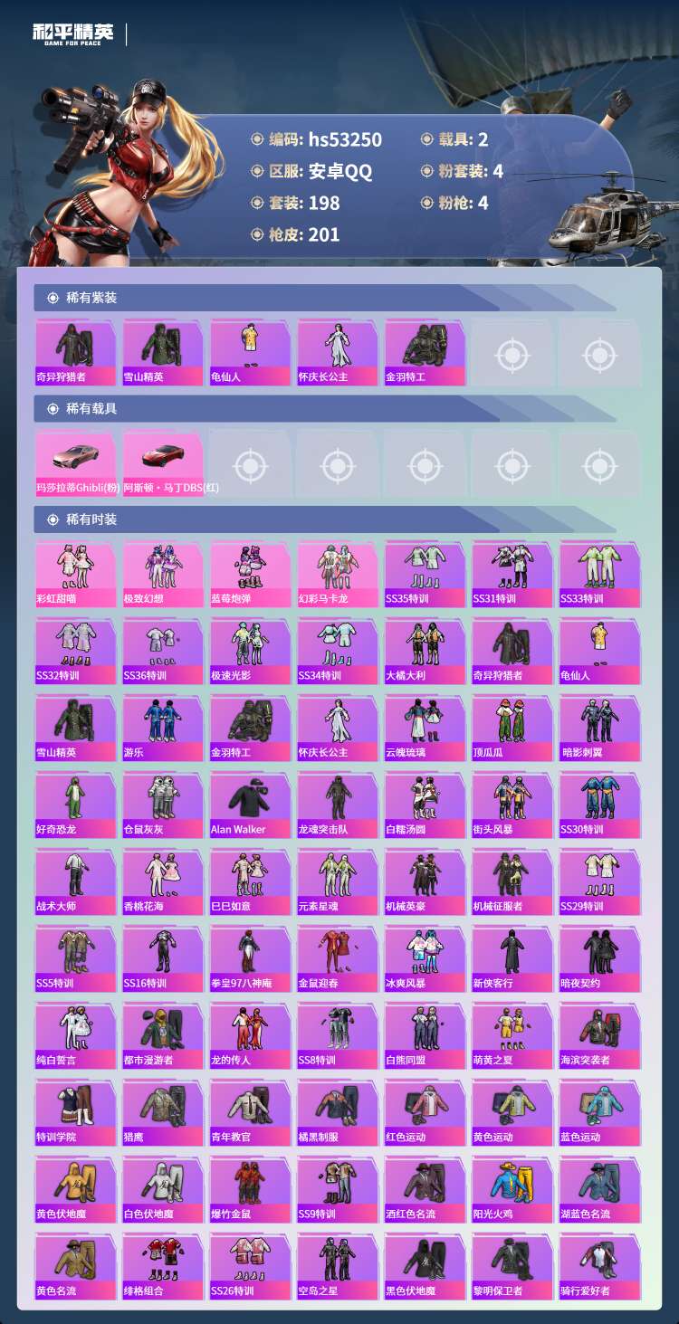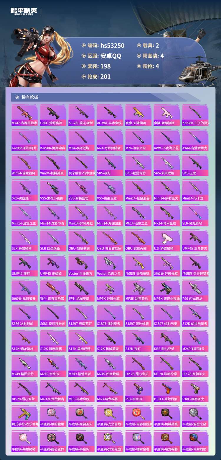 hs53250 安卓手Q-13王牌印记-4粉装-4特效枪-2载具-72443热力值-198套装-2