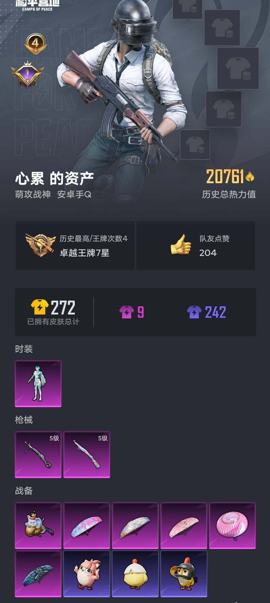 51套装/枪械2/装备80/战备54/王牌印记4/热力值20761/五级Kar98K-巳巳如意/五级DP-28-豹影疾电/角色-玄冥寒域/Kar98K-巳巳如意/DP-28-豹影疾电/极意拳锋飞行器/暗夜玫瑰降落伞/海渊国主降落伞/临安公主降落伞/月影灵韵降落伞/套装-燕燕于飞/套装-鱼渊荷华/套装-朱霞炽焰/套装-凌霄紫焰/玩偶服-懒羊羊/玩偶服-美羊羊/AKM-破晓战魂/AKM-萌趣颜团子/