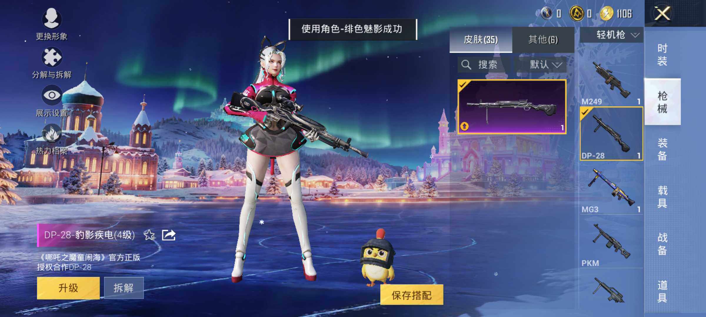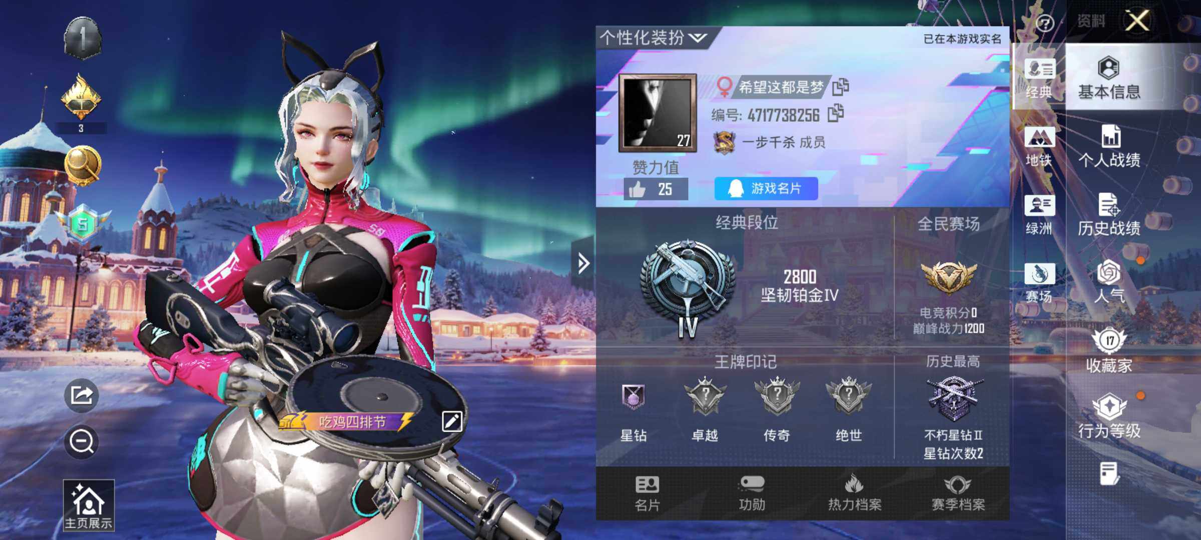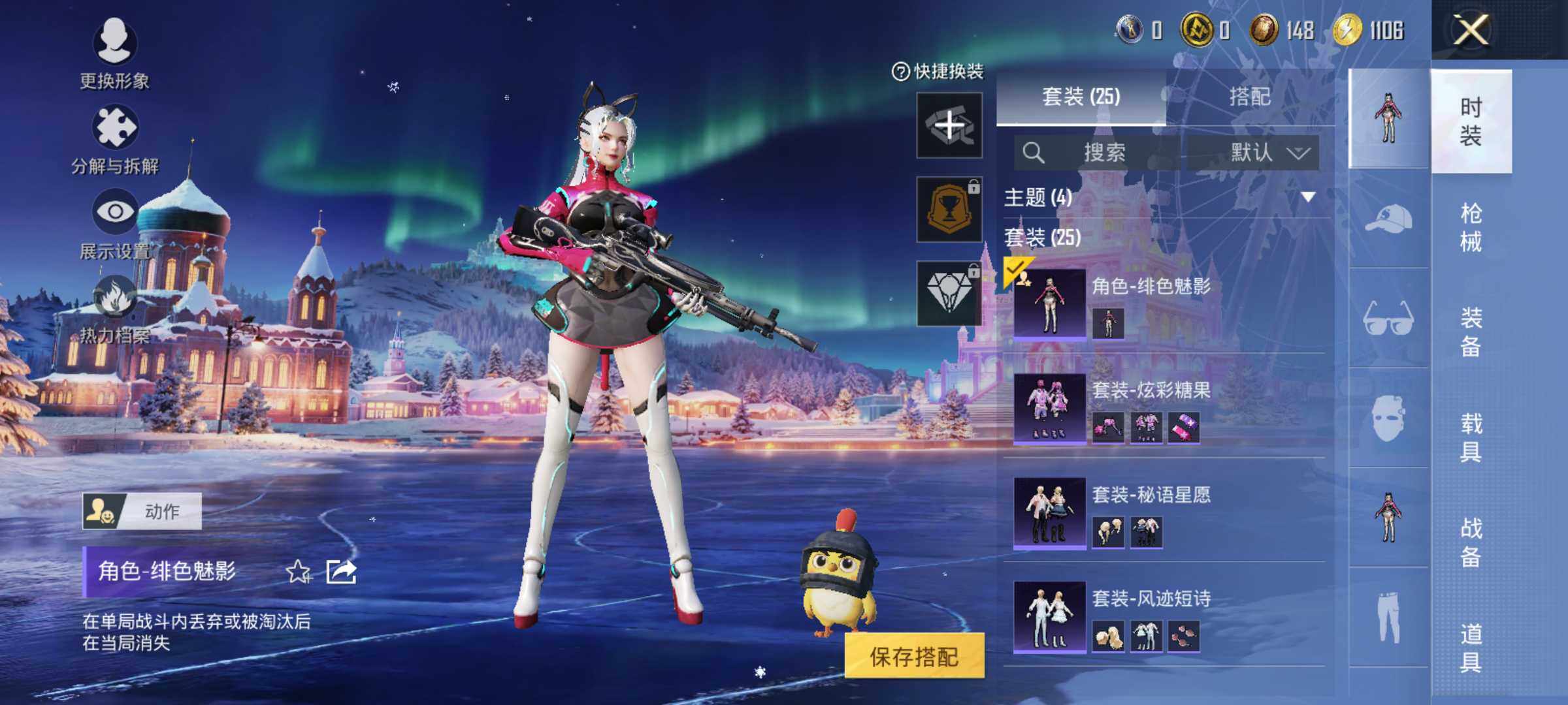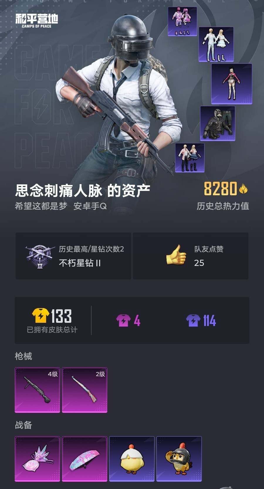 25套装/枪械2/装备42/战备31/热力值8280/二级Kar98K-巳巳如意/四级DP-28-豹影疾电/Kar98K-巳巳如意/DP-28-豹影疾电/角色-绯色魅影/套装-炫彩糖果/AKM-春暖花开/SCAR-L-炫彩节奏/M416-红色方程式/G36C-星穹咏叹调/UZI-天降萌叽/UMP45-夜灯/汤姆逊-天降萌叽/SKS-炫彩节奏/S12K-夜灯/M249-彩虹符号/MG3-幻世战舞者