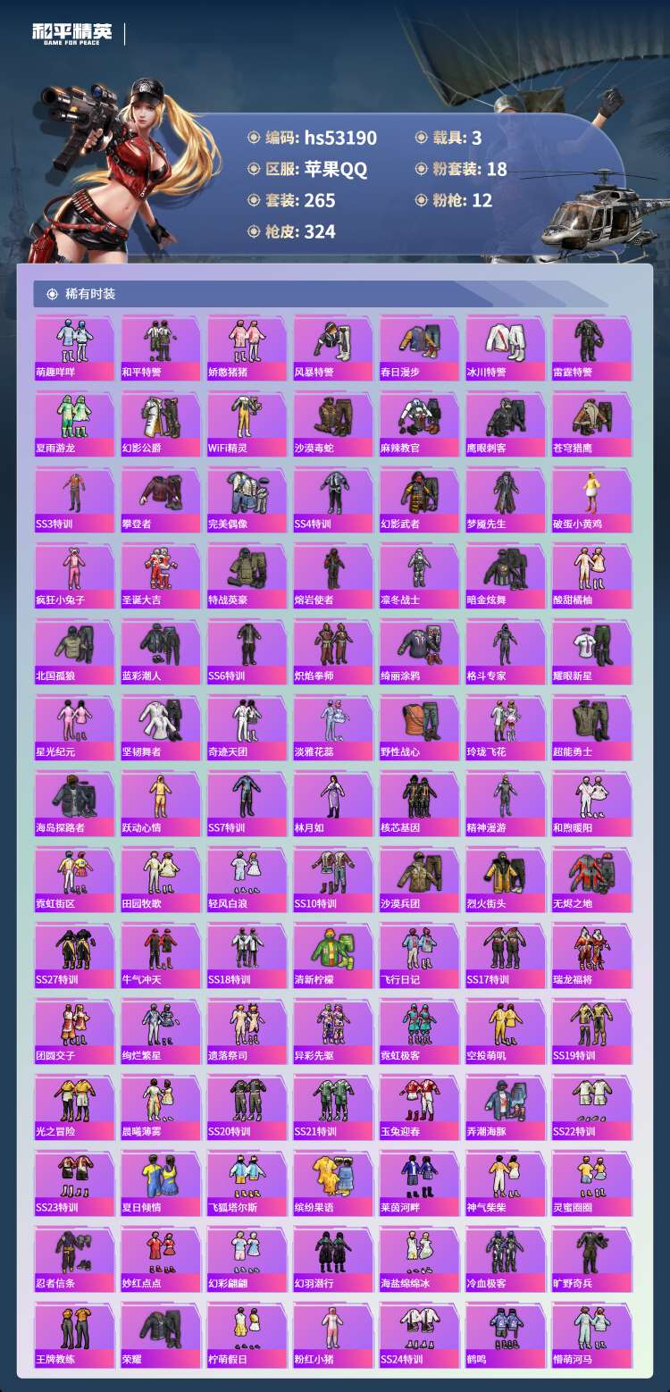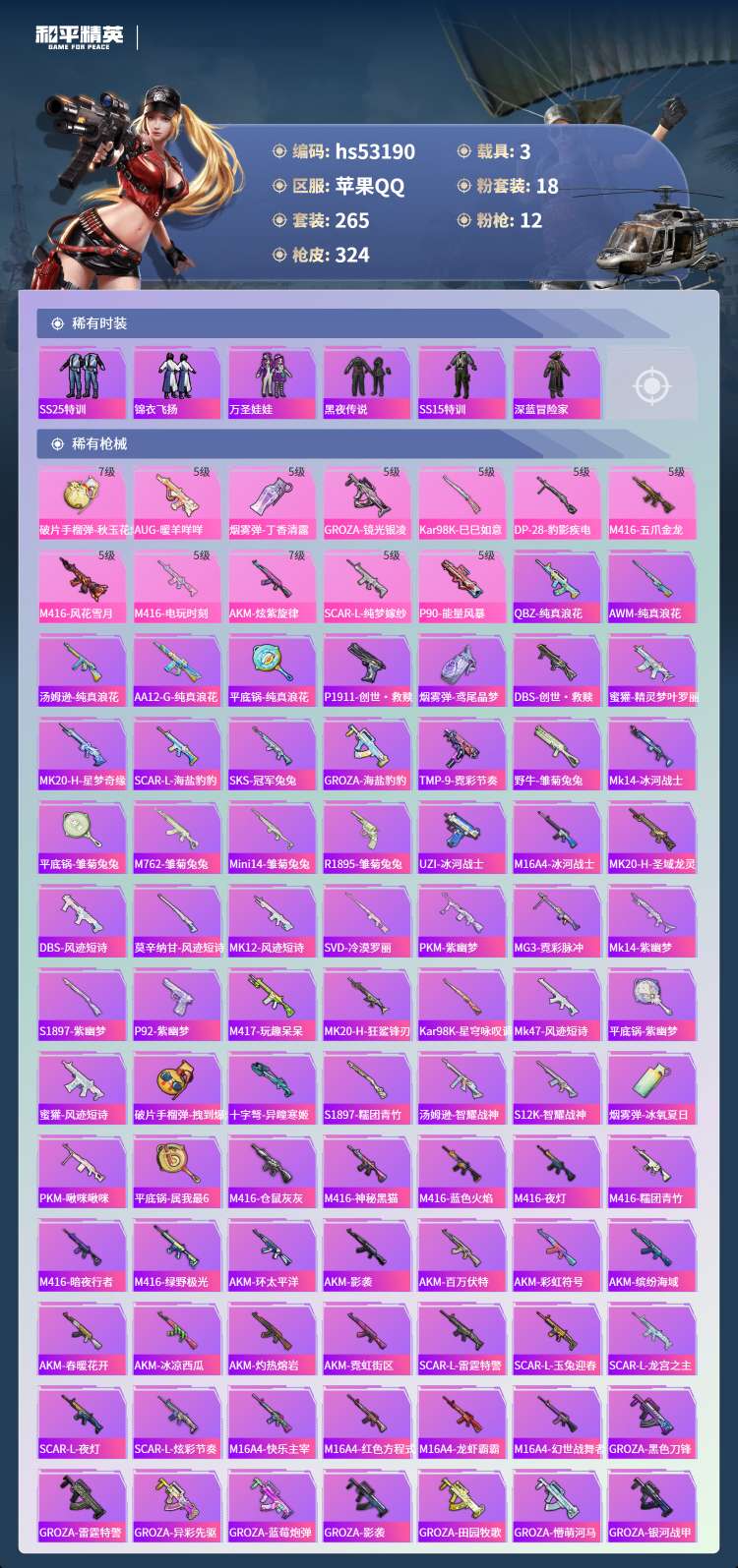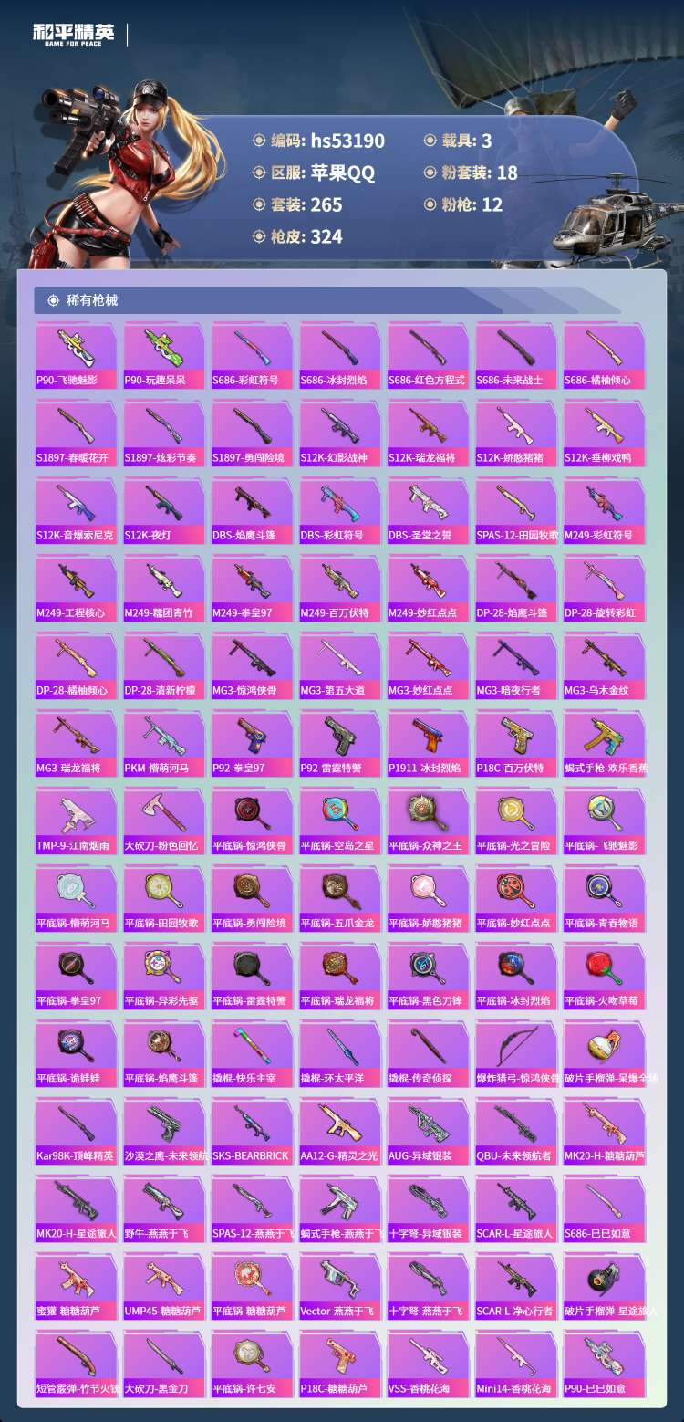 hs53190 苹果手Q-17王牌印记-18粉装-12特效枪-3载具-108143热力值-265套装