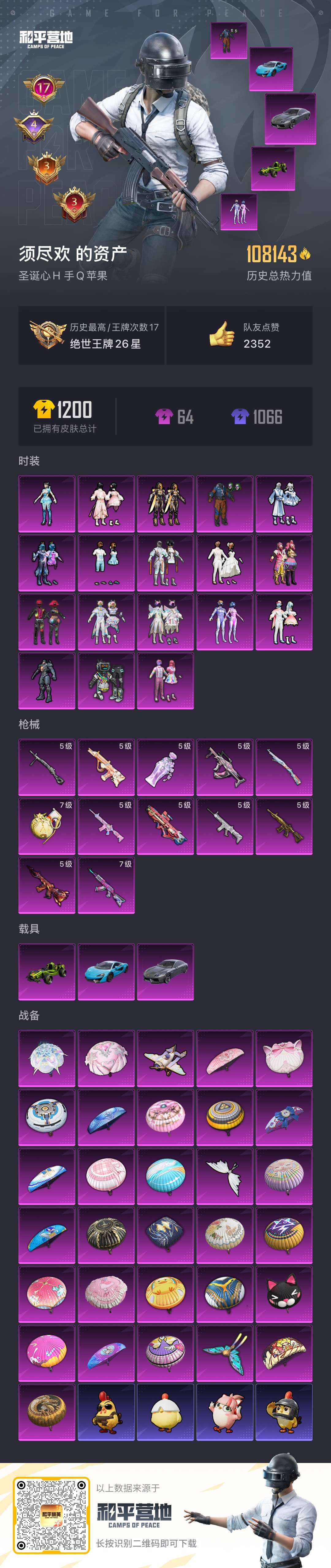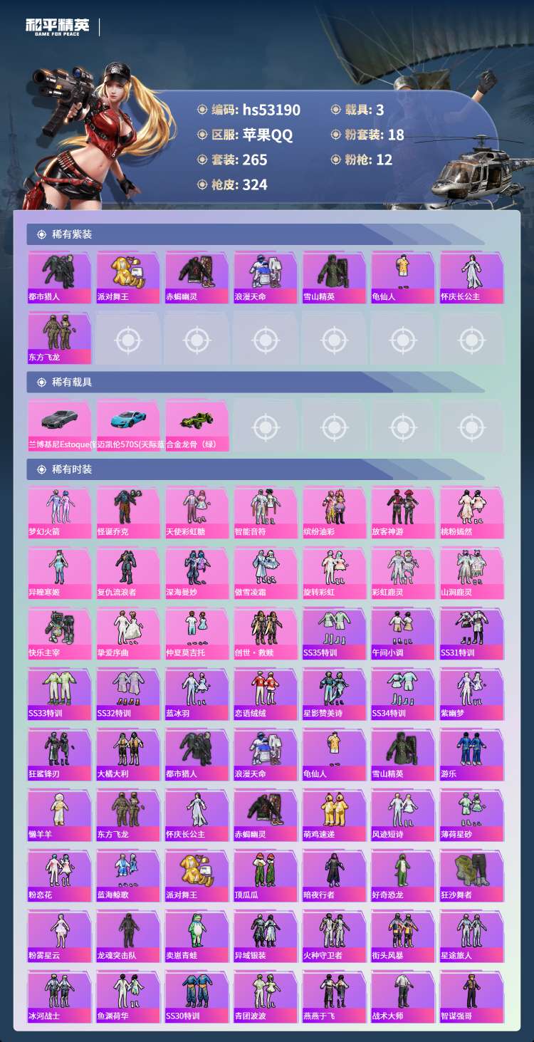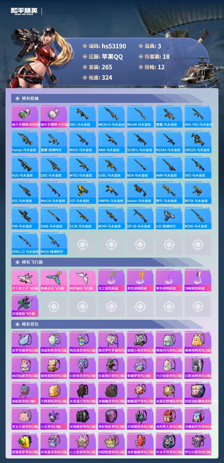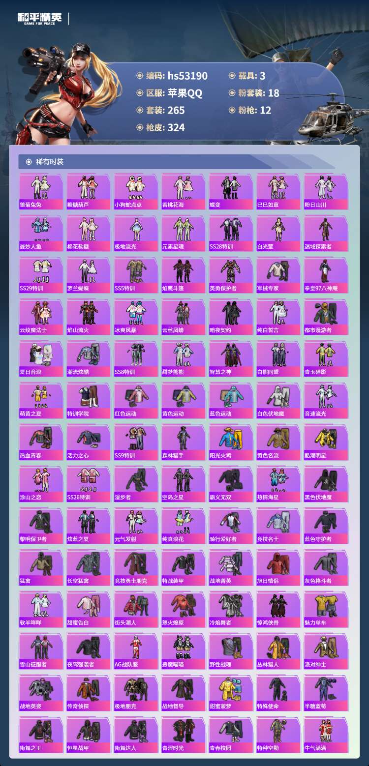 hs53190 苹果手Q-17王牌印记-18粉装-12特效枪-3载具-108143热力值-265套装