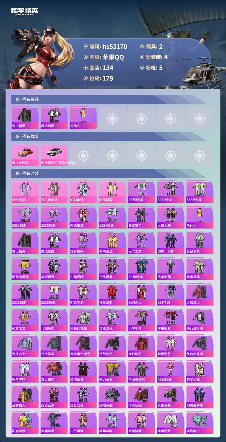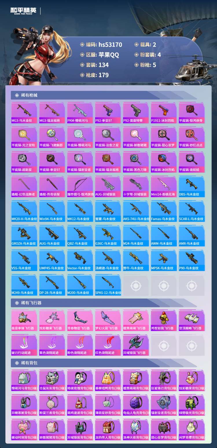 hs53170 苹果手Q-14王牌印记-有战神框-4粉装-5特效枪-2载具-62175热力值-134