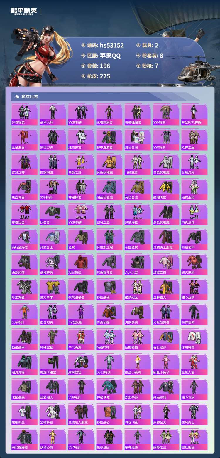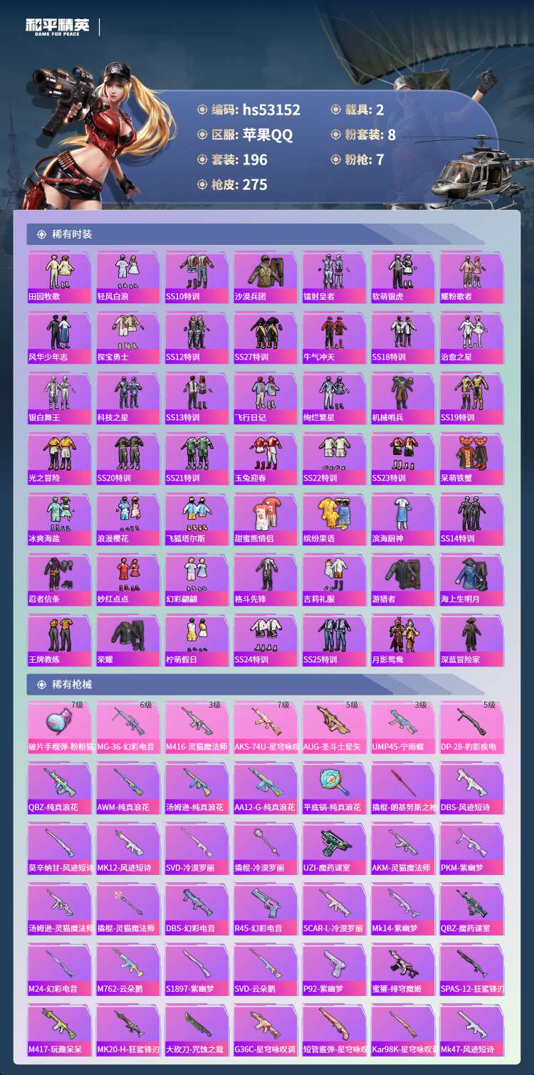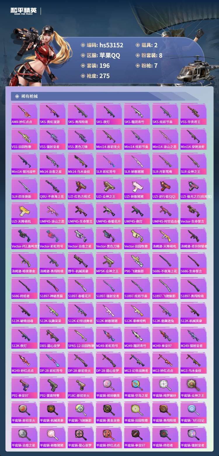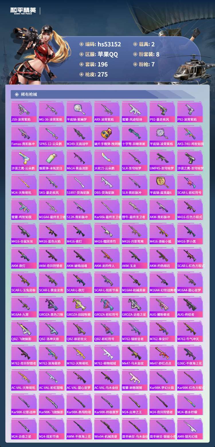 hs53152 苹果手Q-12王牌印记-有战神框-1红装-8粉装-7特效枪-2载具-89284热力值