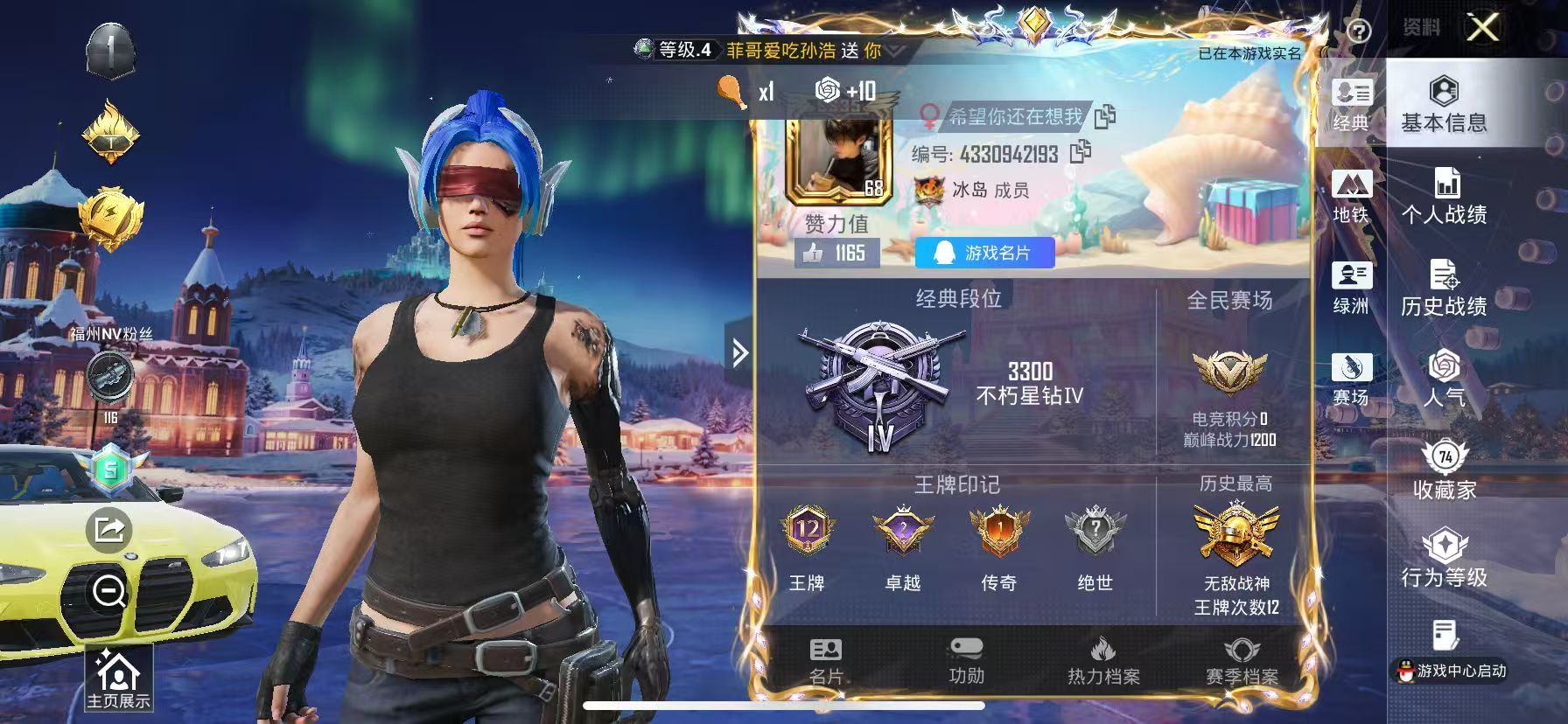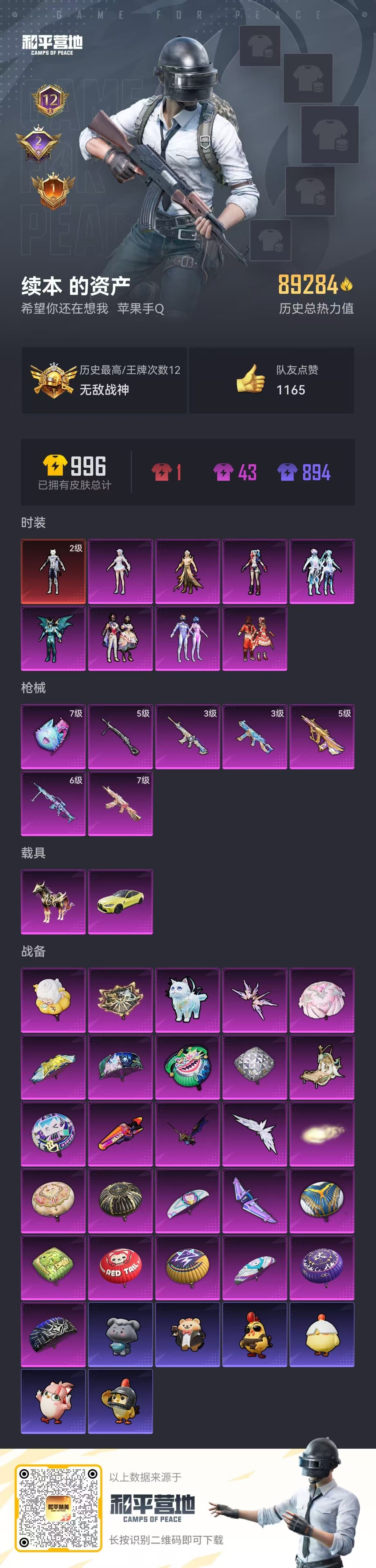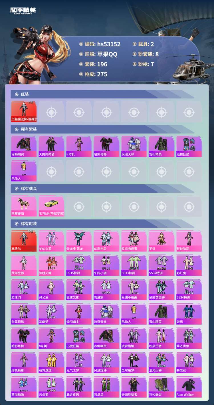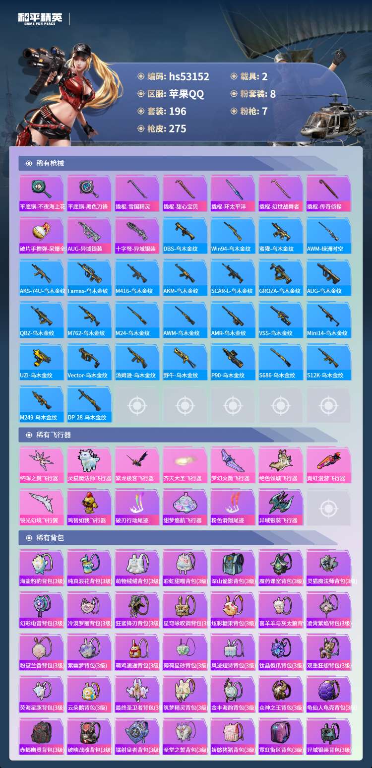 hs53152 苹果手Q-12王牌印记-有战神框-1红装-8粉装-7特效枪-2载具-89284热力值