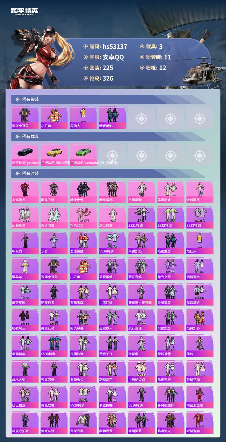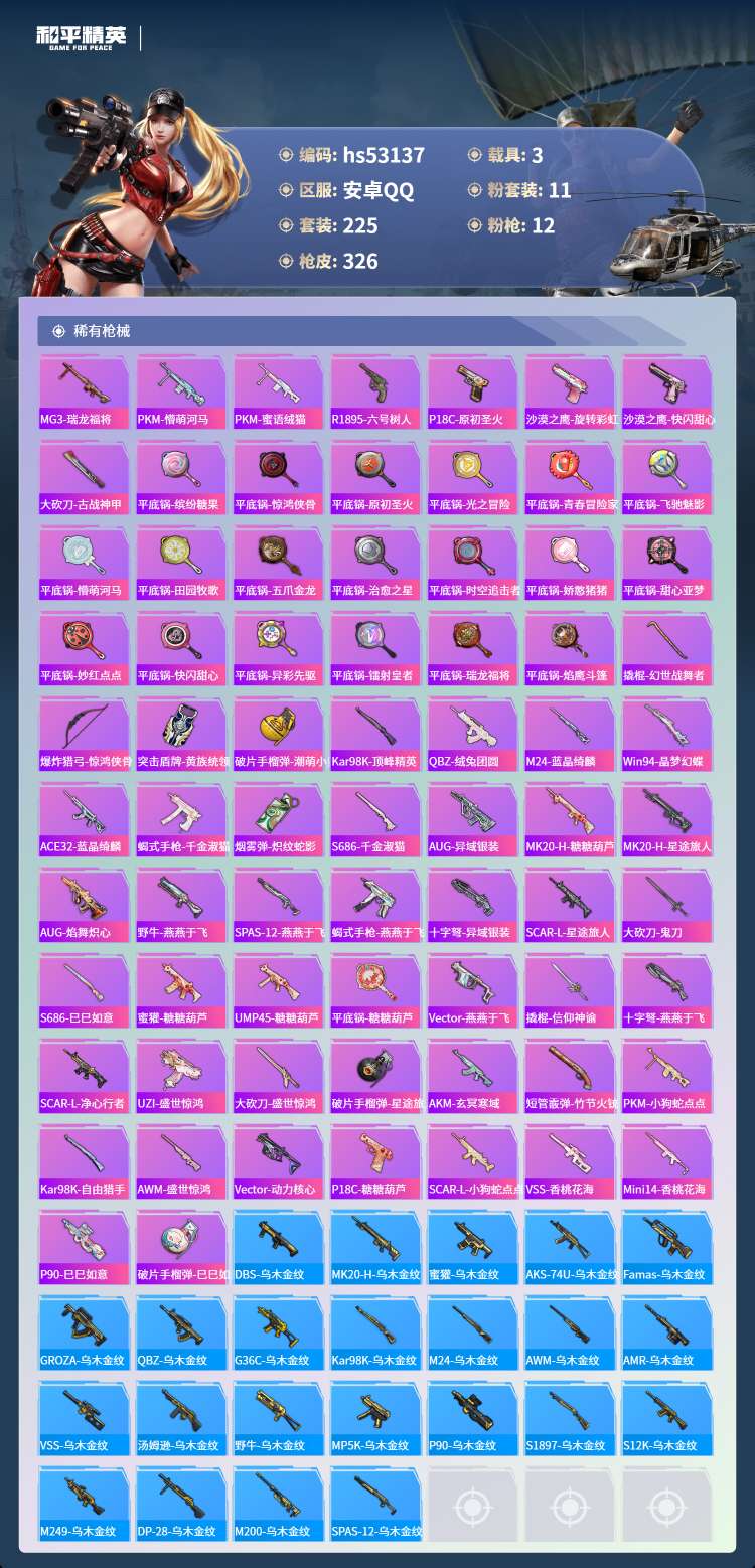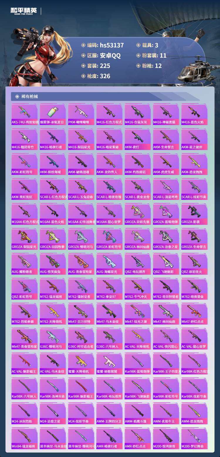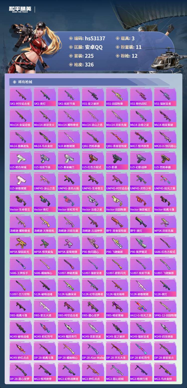hs53137 安卓手Q-8王牌印记-11粉装-12特效枪-3载具-115120热力值-225套装-